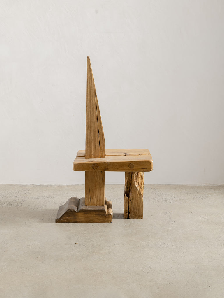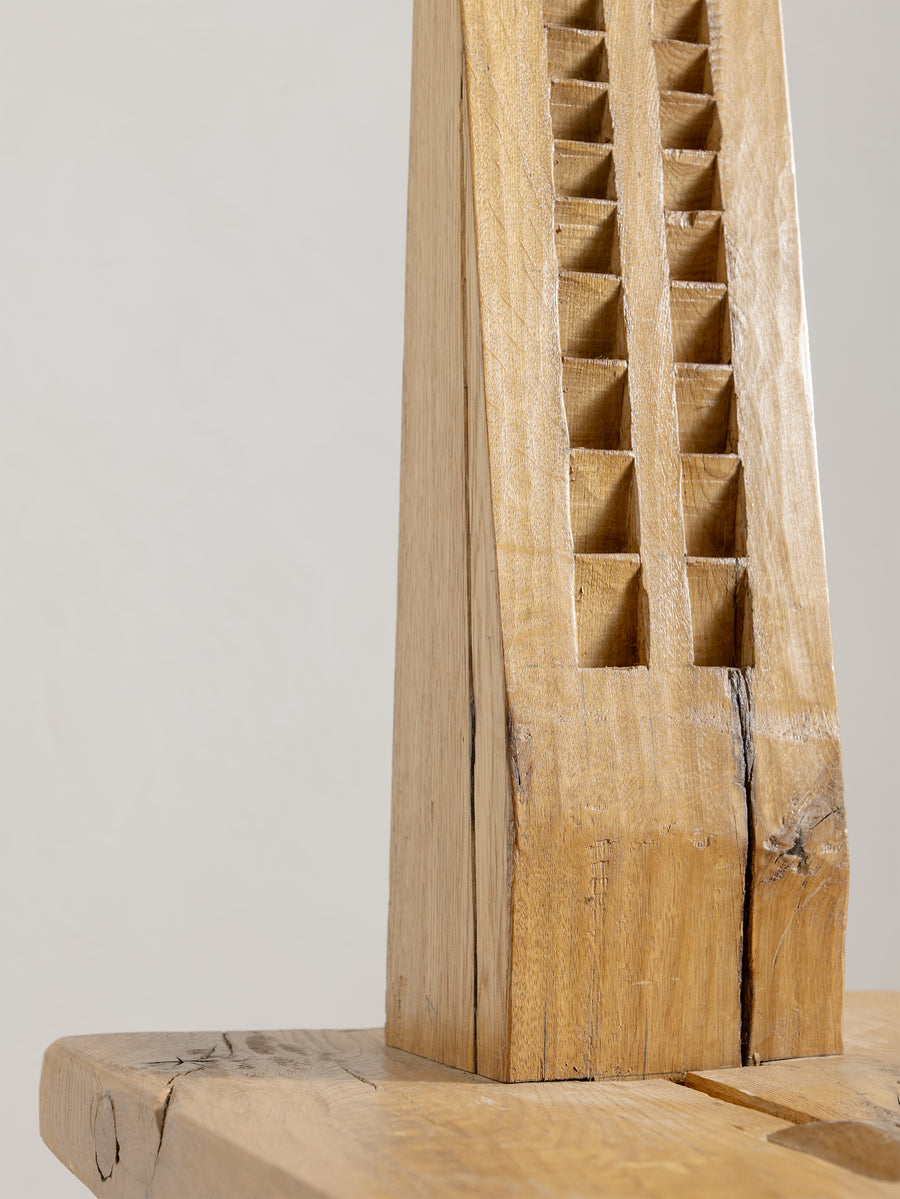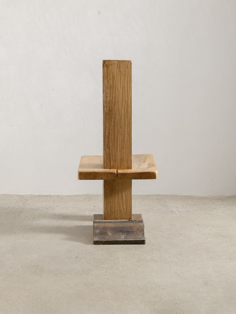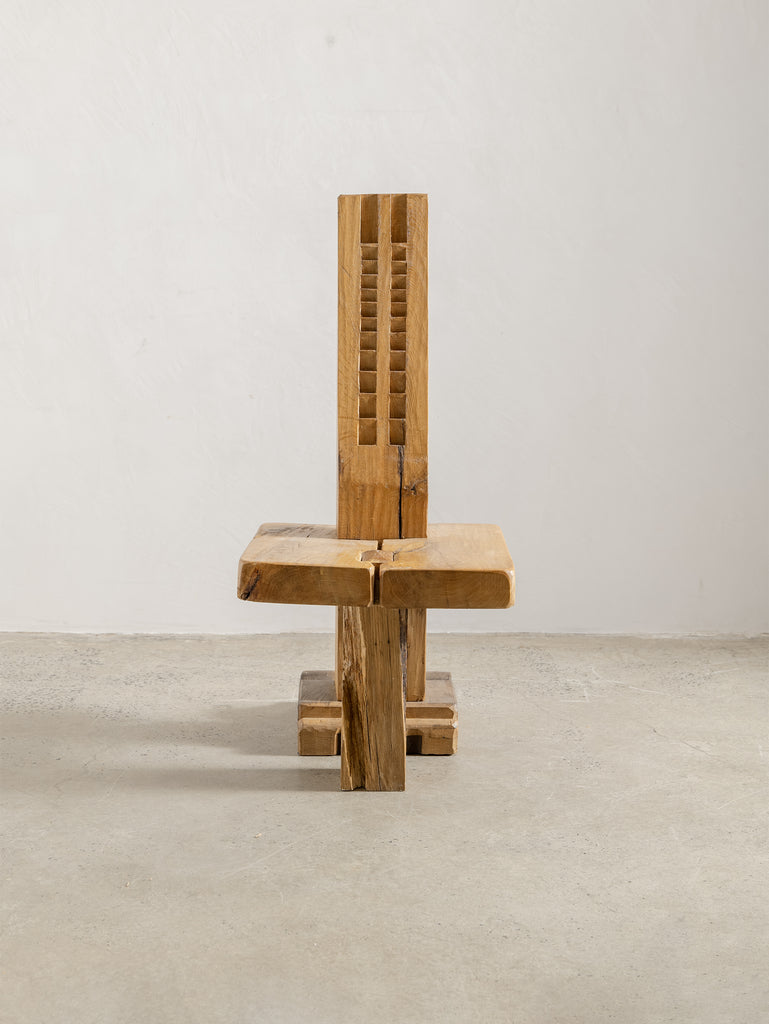 An artisan-made French timber chair, sculpted with a bold, architectural presence. Crafted from solid timber, its geometric form is balanced by the hand-carved detailing to the backrest, giving it both sculptural depth and textural character. Bearing the marks of the maker’s hand, the chair reflects a raw, elemental beauty. A statement piece that embodies the enduring traditions of French craftsmanship.