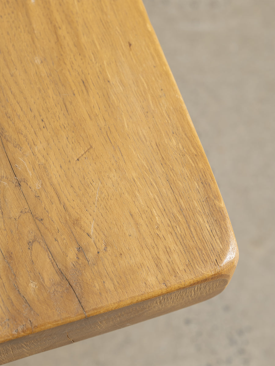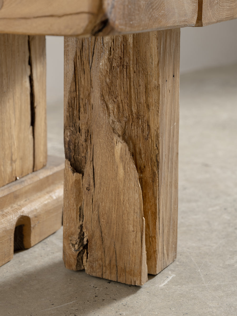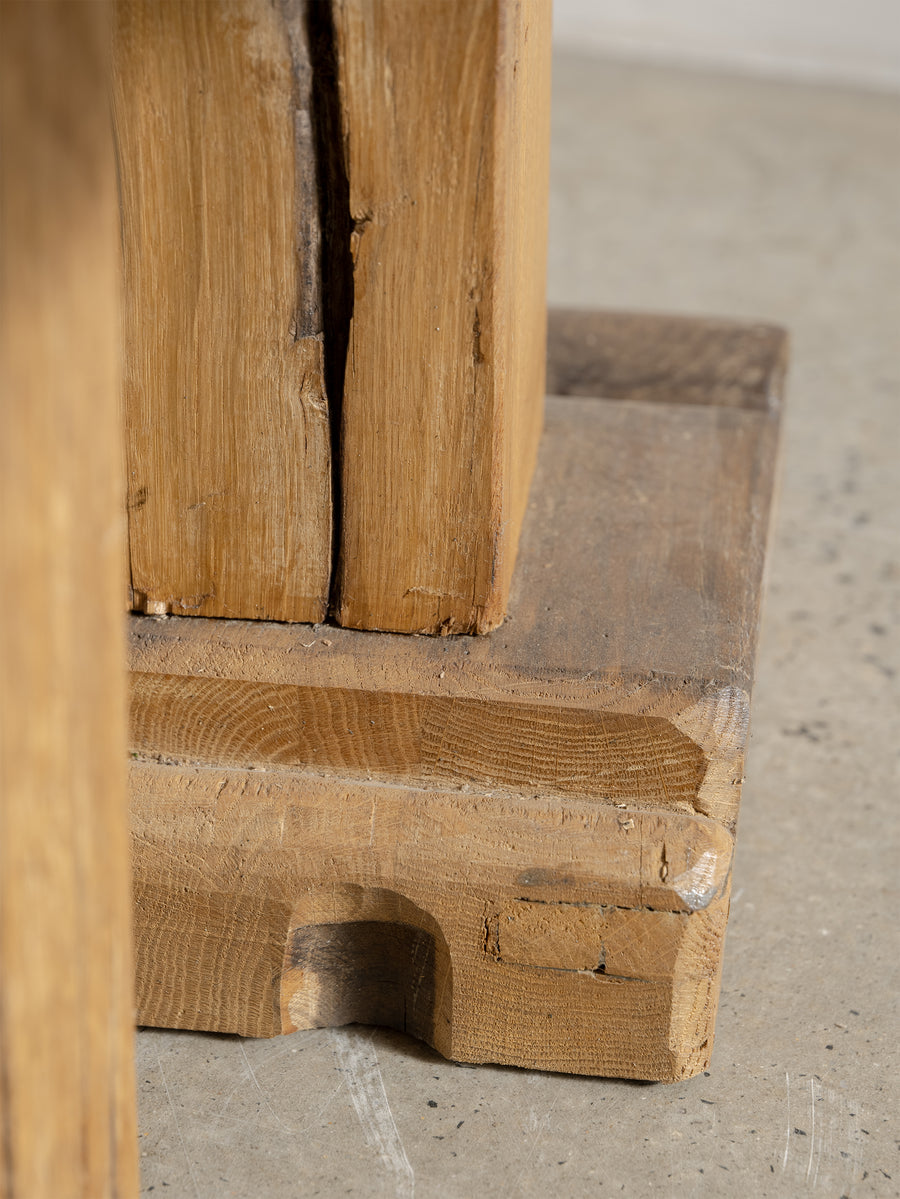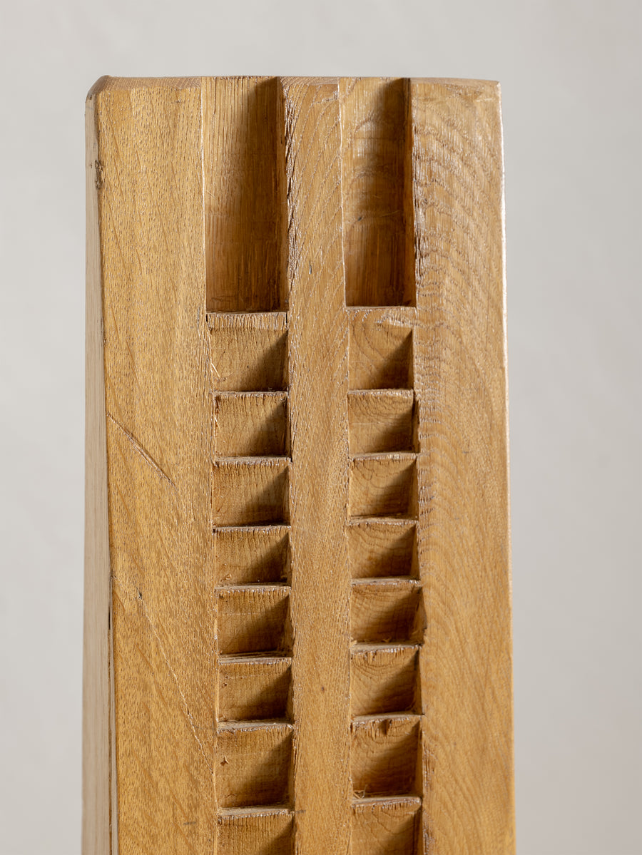 An artisan-made French timber chair, sculpted with a bold, architectural presence. Crafted from solid timber, its geometric form is balanced by the hand-carved detailing to the backrest, giving it both sculptural depth and textural character. Bearing the marks of the maker’s hand, the chair reflects a raw, elemental beauty. A statement piece that embodies the enduring traditions of French craftsmanship.