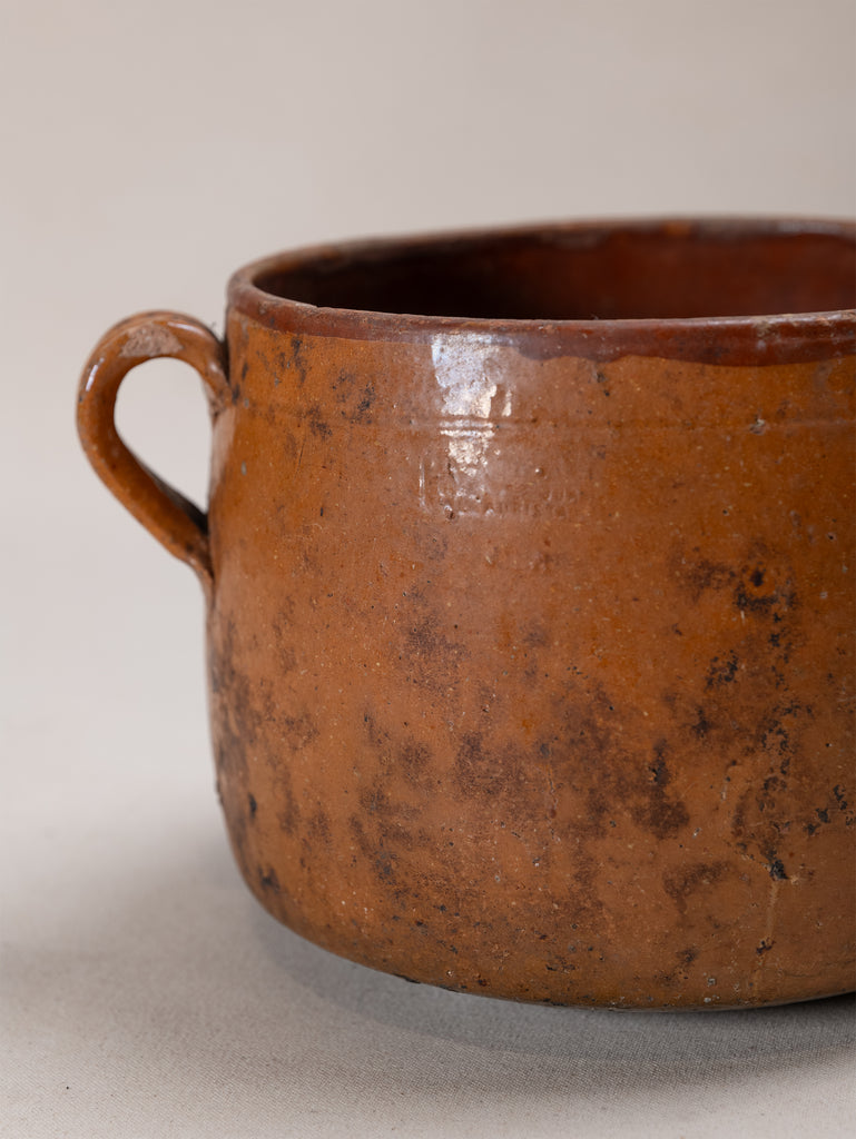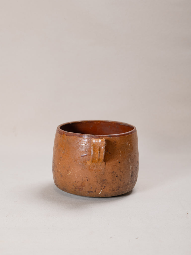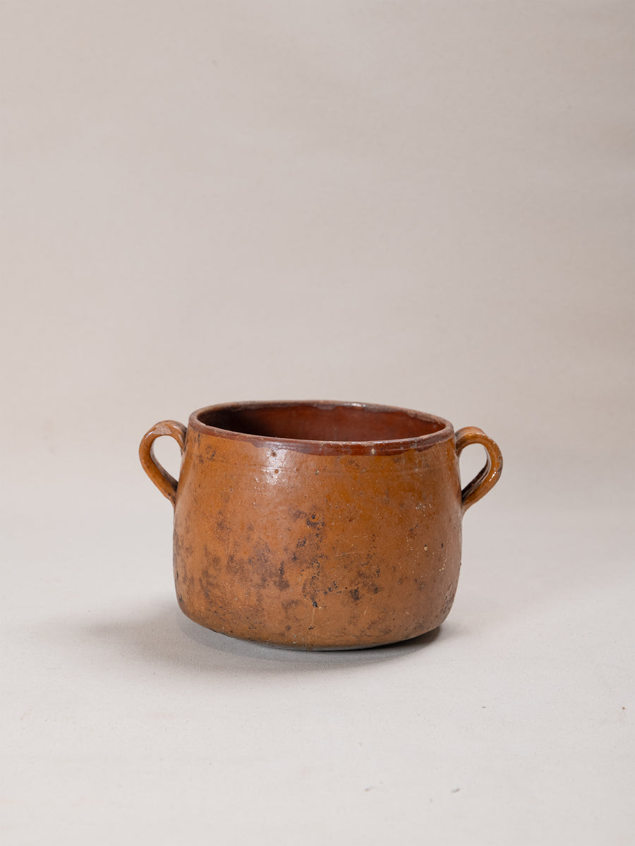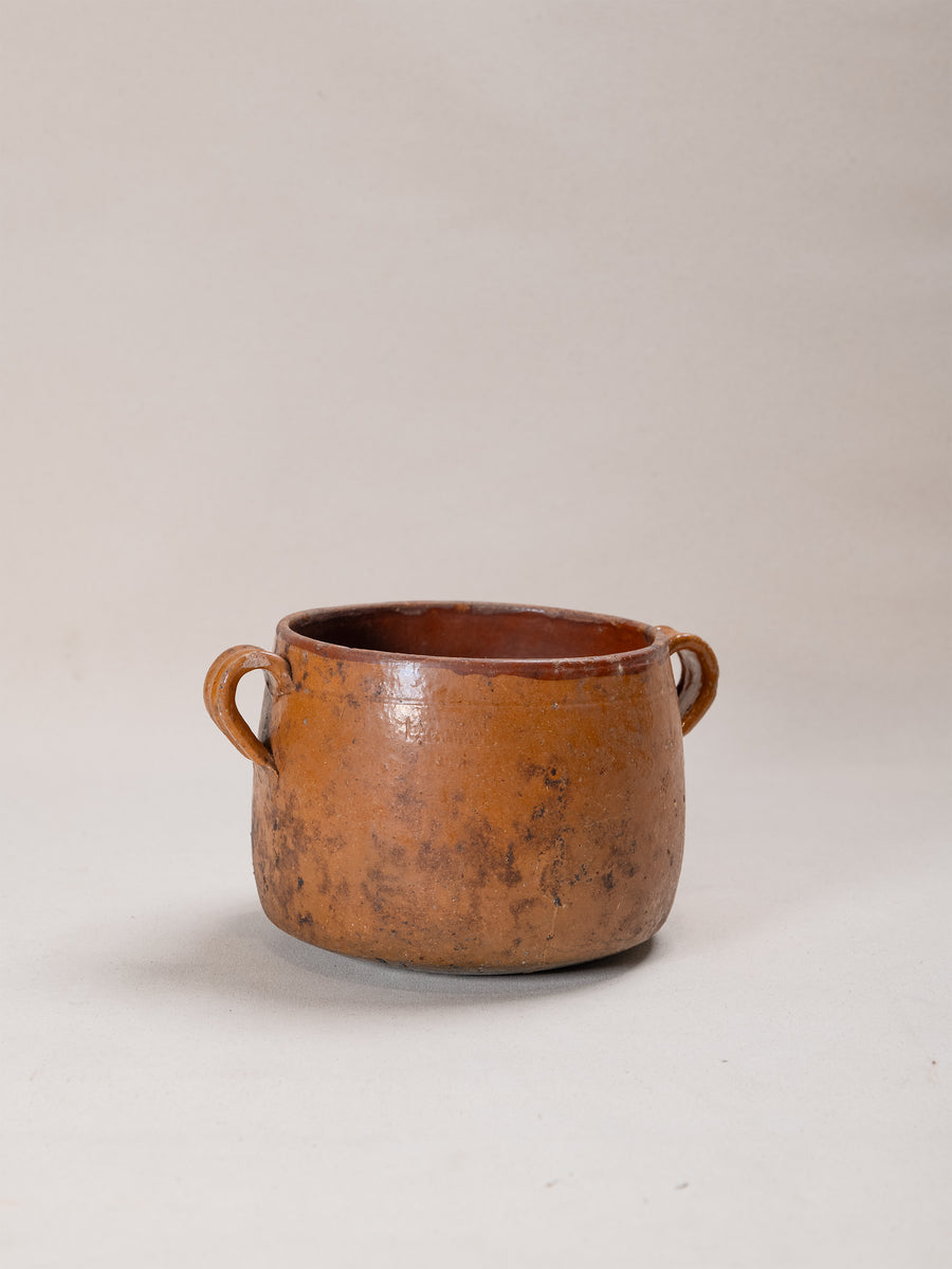 Vintage glazed terracotta pot with a warm, earthy tone and twin side handles. Once a utilitarian vessel, it now serves as a beautiful decorative accent — its simple, rounded form and natural imperfections telling the story of its handmade origin. The glaze has softened over time, revealing a surface rich in character and patina, perfect for adding an element of rustic charm to any interior.