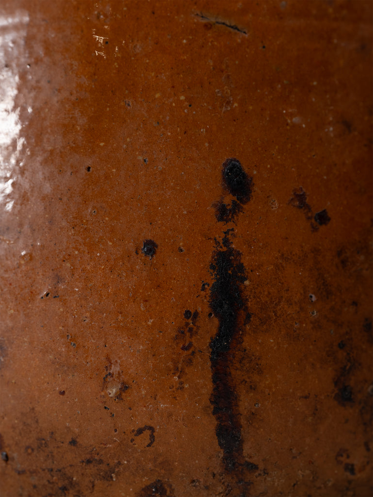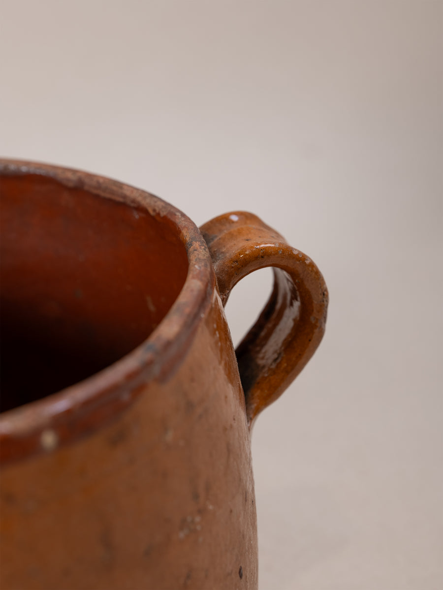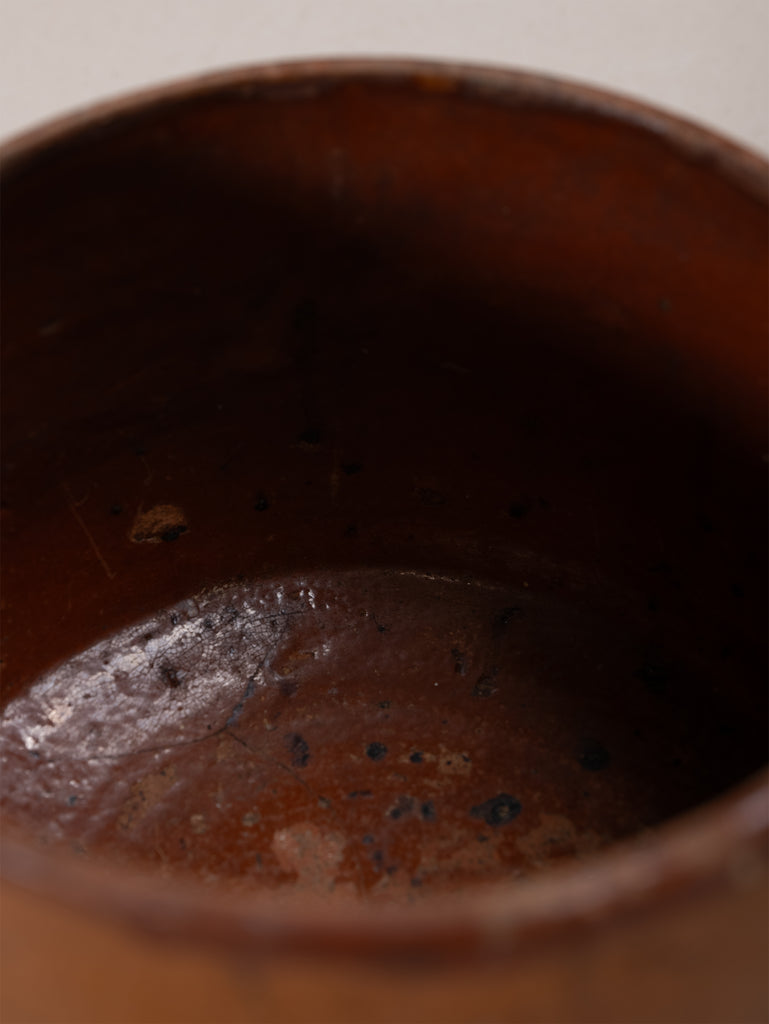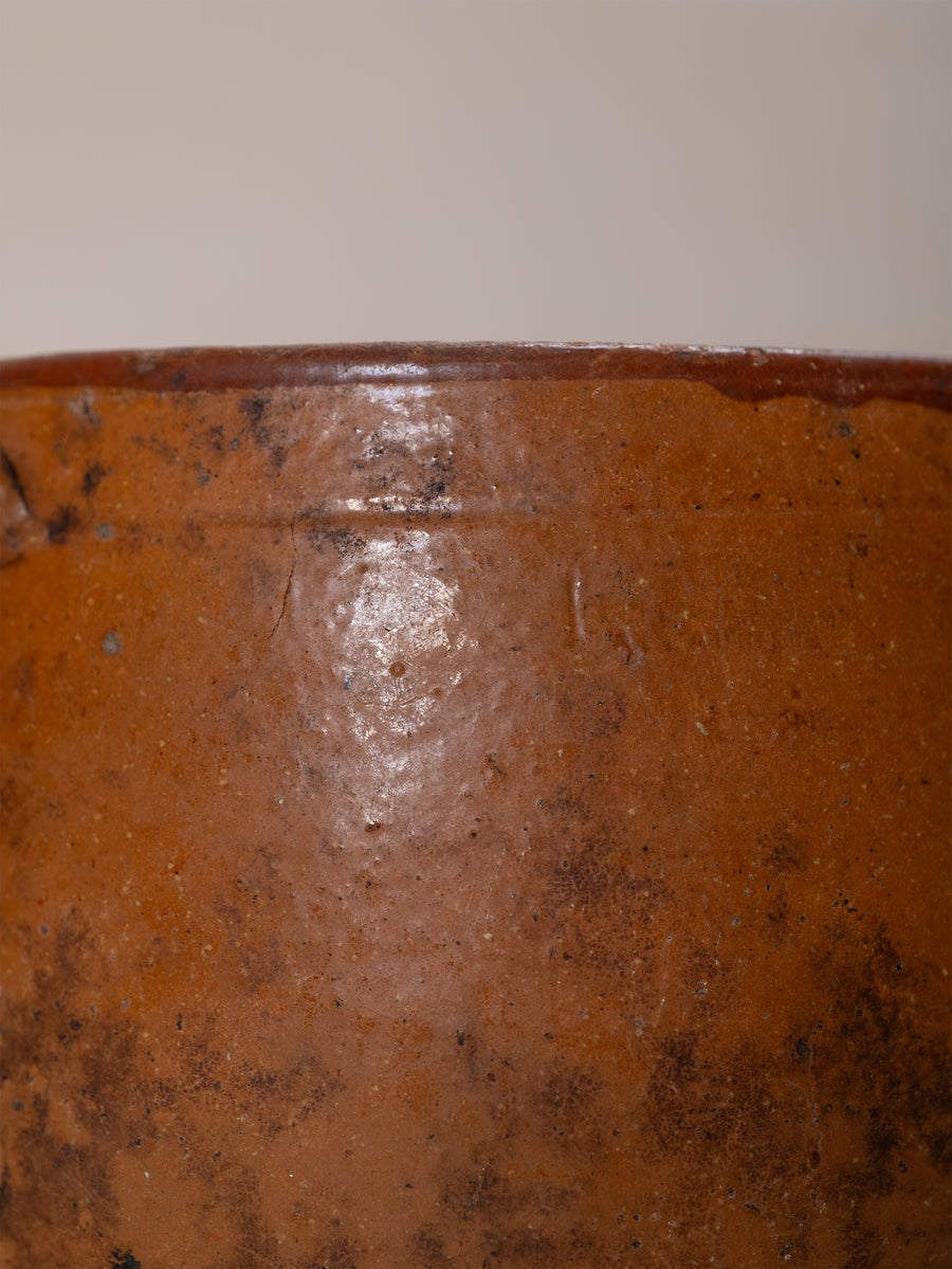 Vintage glazed terracotta pot with a warm, earthy tone and twin side handles. Once a utilitarian vessel, it now serves as a beautiful decorative accent — its simple, rounded form and natural imperfections telling the story of its handmade origin. The glaze has softened over time, revealing a surface rich in character and patina, perfect for adding an element of rustic charm to any interior.