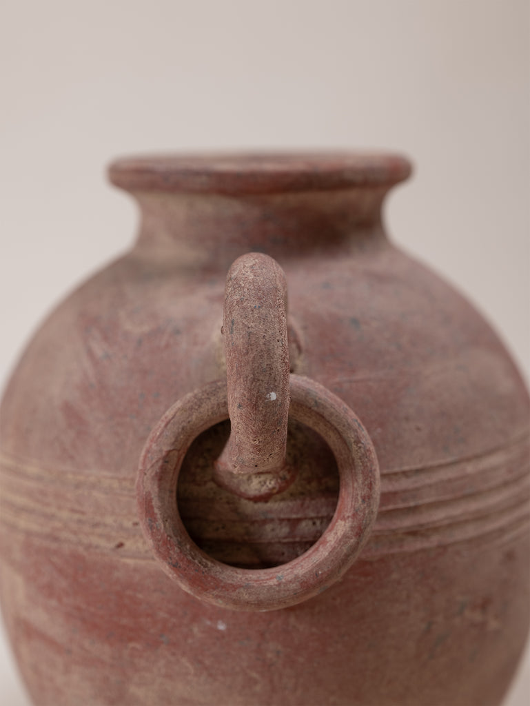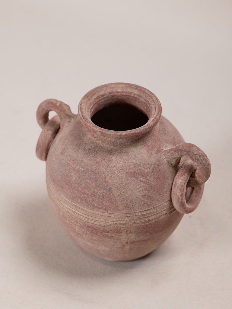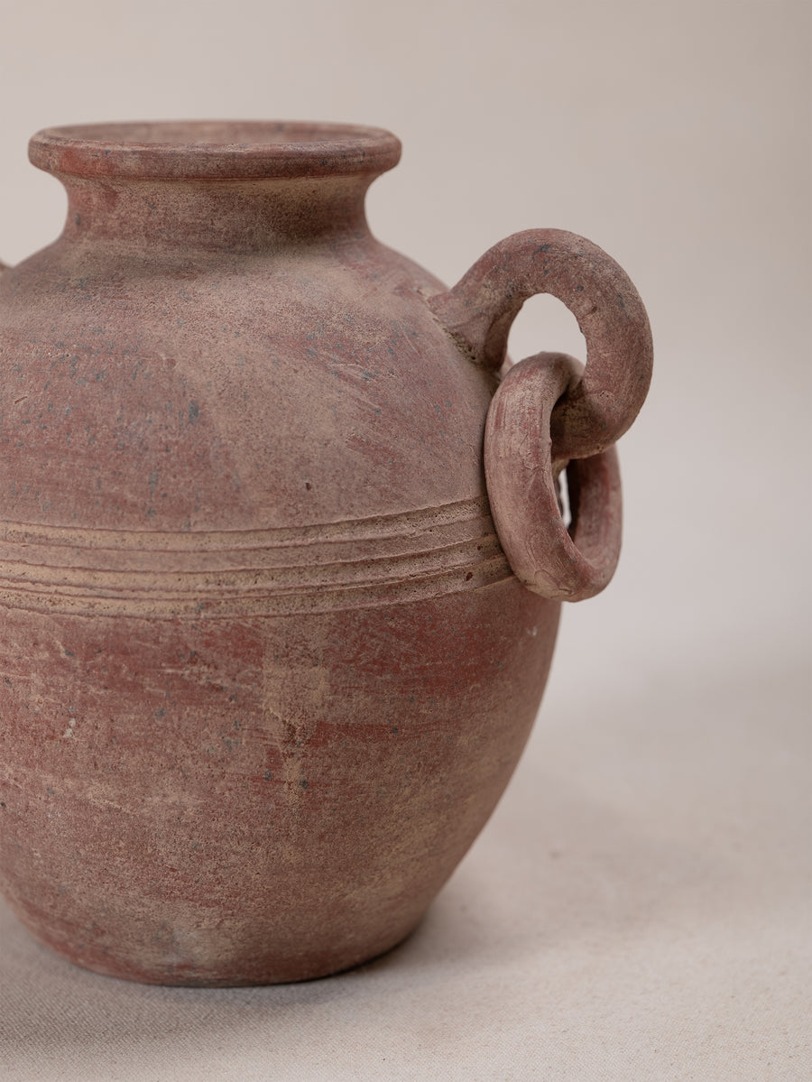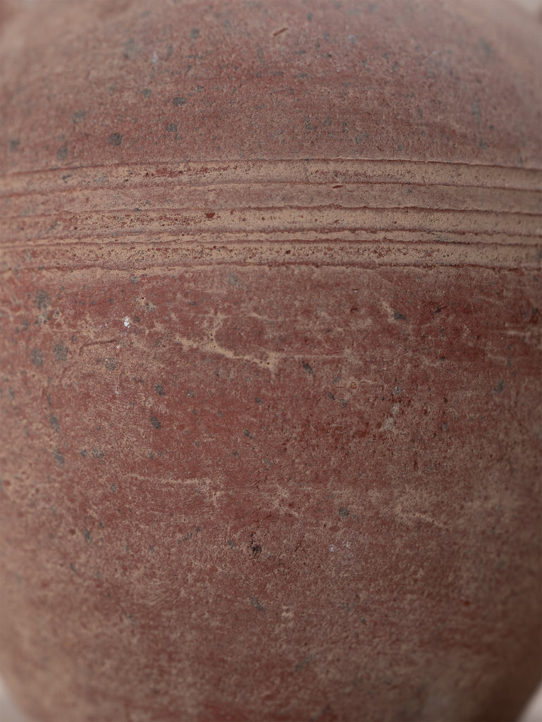 Vintage terracotta vessel with a warm, red-toned finish and softly weathered surface that speaks to its age and handmade origins. Its rounded form is accented by incised banding and sculptural loop handles, giving the piece both balance and decorative presence. Once utilitarian, now a striking object of character, it embodies the enduring beauty of simple, time-worn craftsmanship.