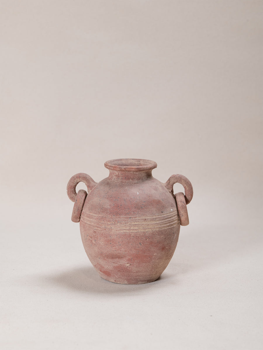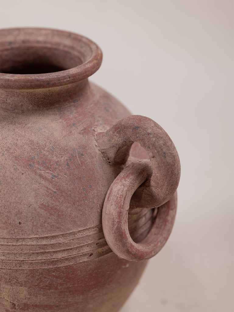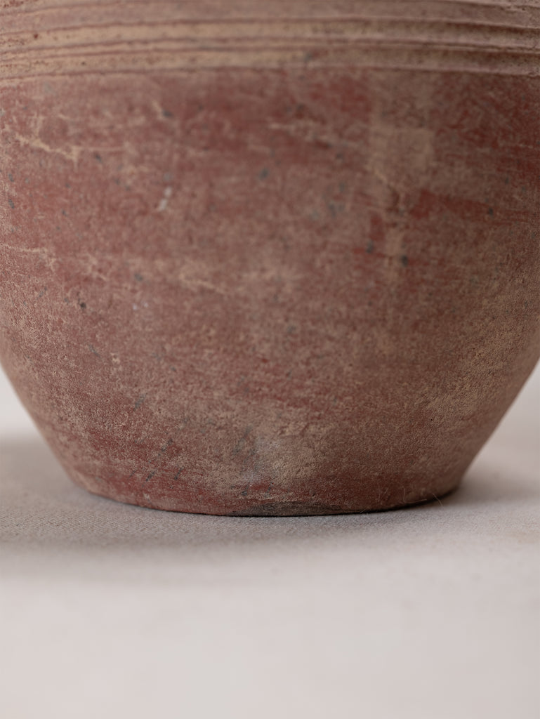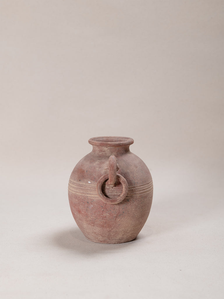 Vintage terracotta vessel with a warm, red-toned finish and softly weathered surface that speaks to its age and handmade origins. Its rounded form is accented by incised banding and sculptural loop handles, giving the piece both balance and decorative presence. Once utilitarian, now a striking object of character, it embodies the enduring beauty of simple, time-worn craftsmanship.