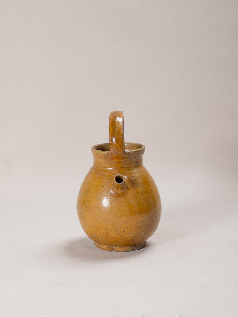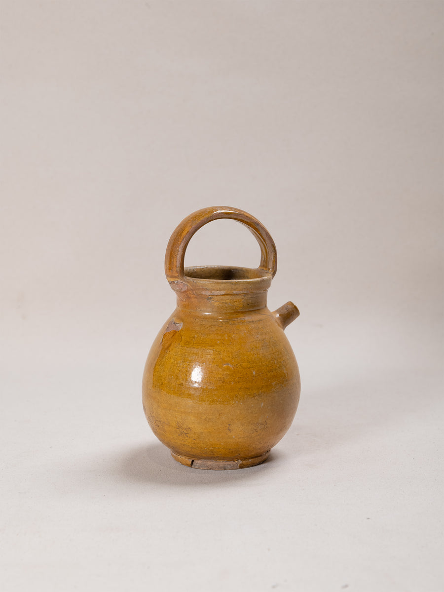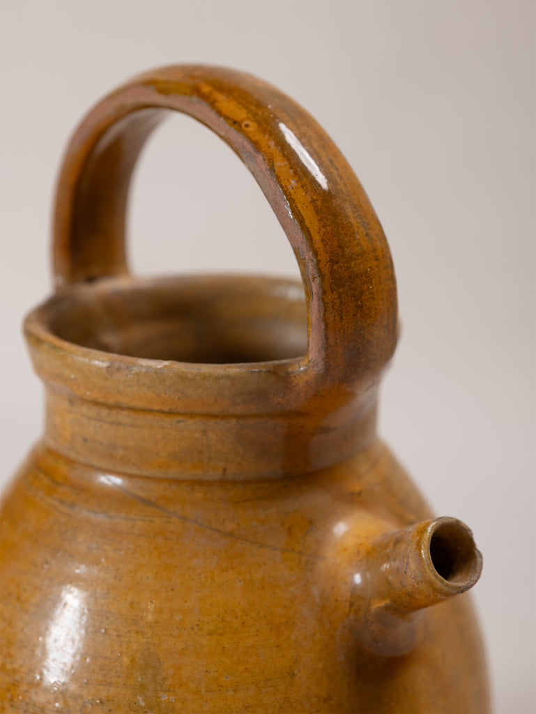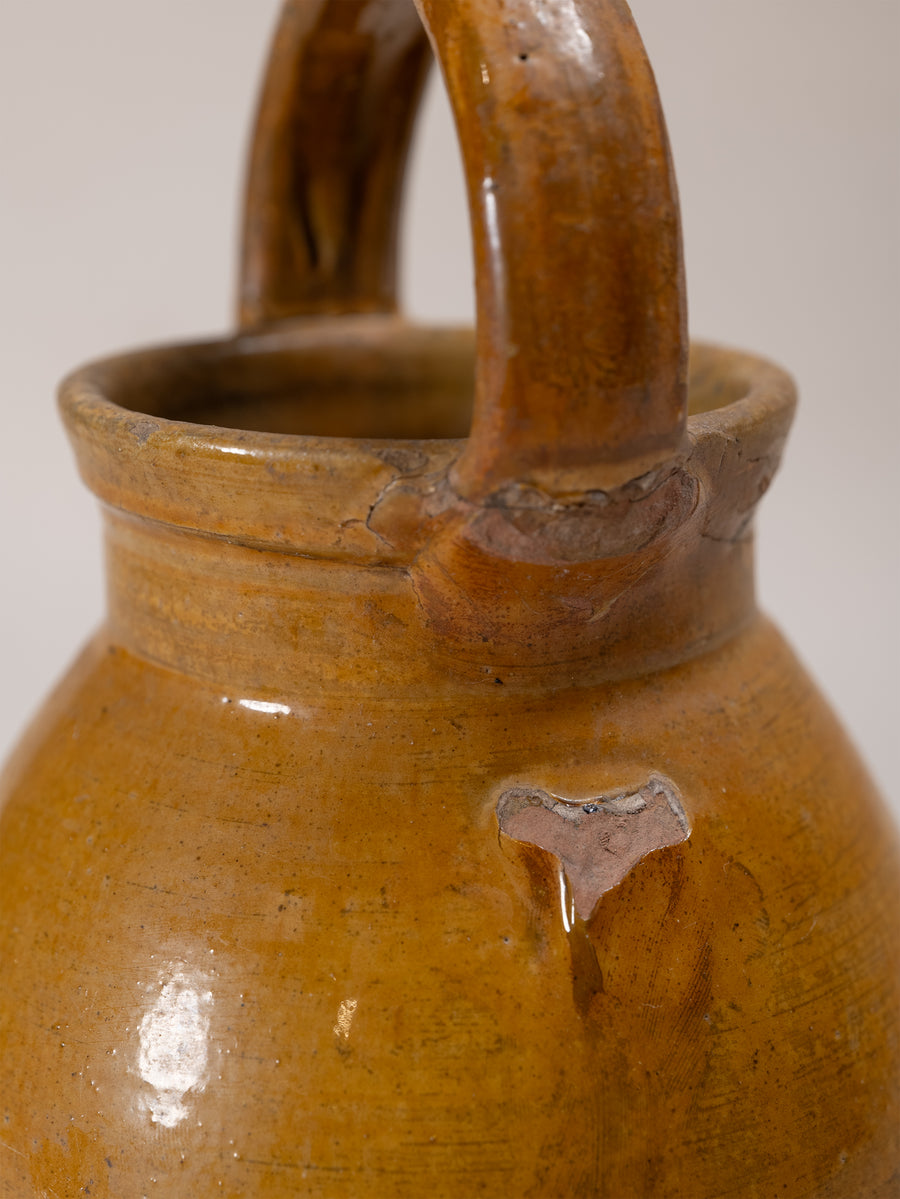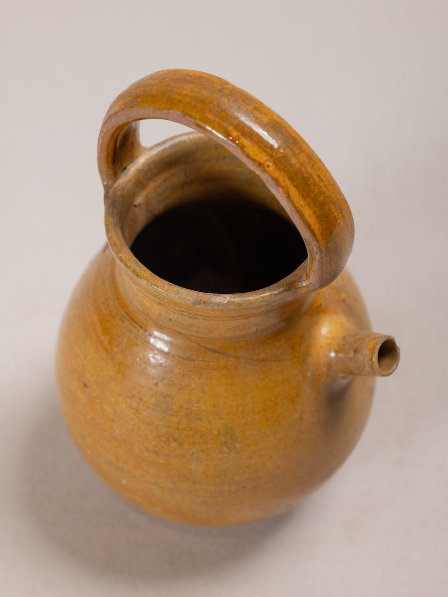 Vintage French terracotta pitcher with a warm golden glaze and a curved handle. Once used in the south of France for pouring water or wine, its form reflects traditional Provençal craftsmanship — both functional and sculptural. The softly aged surface and irregular glaze give it a timeless patina, making it a beautiful decorative accent with rustic charm.