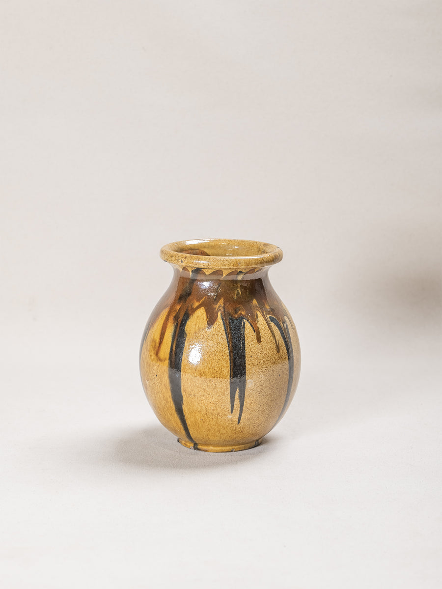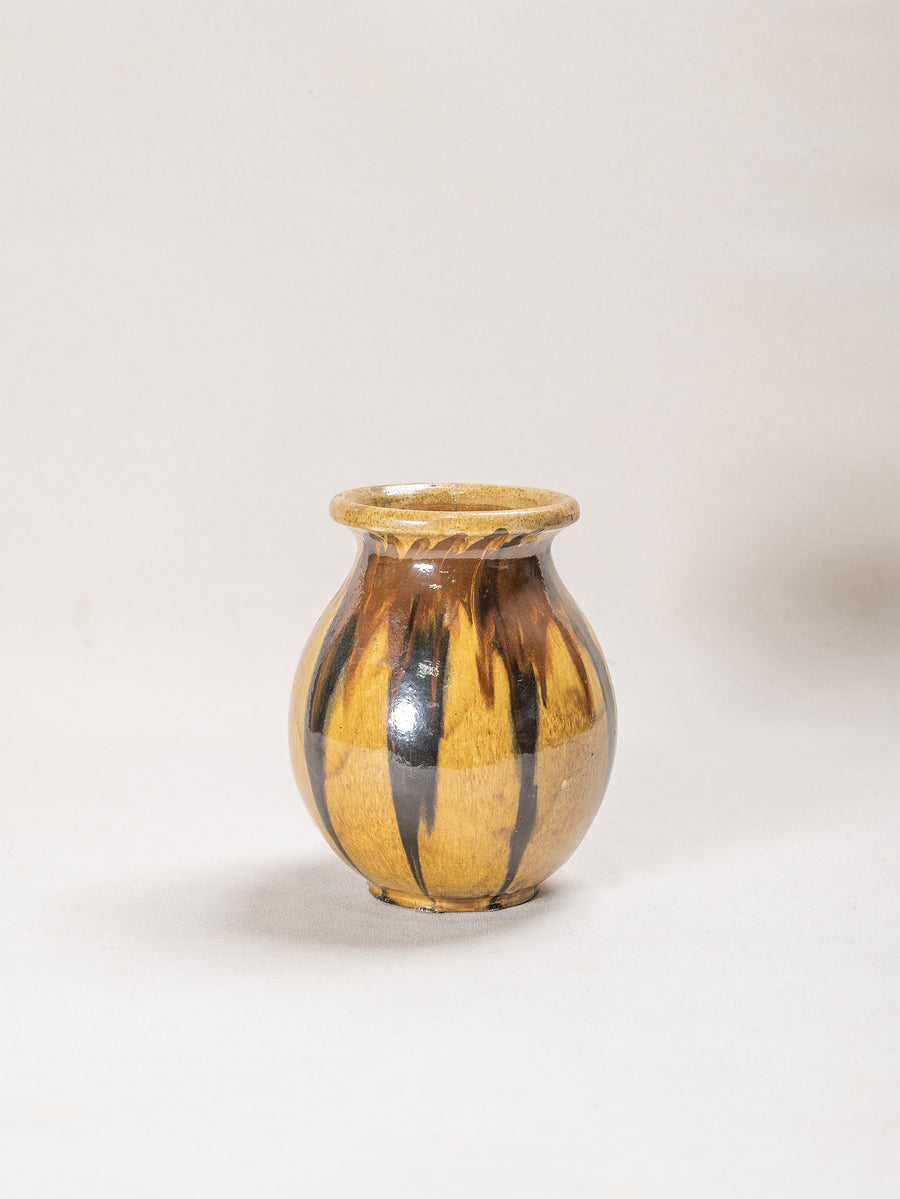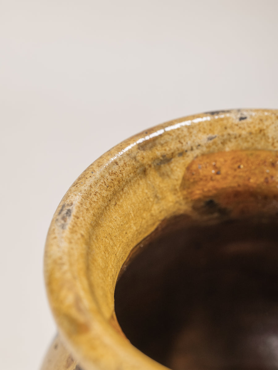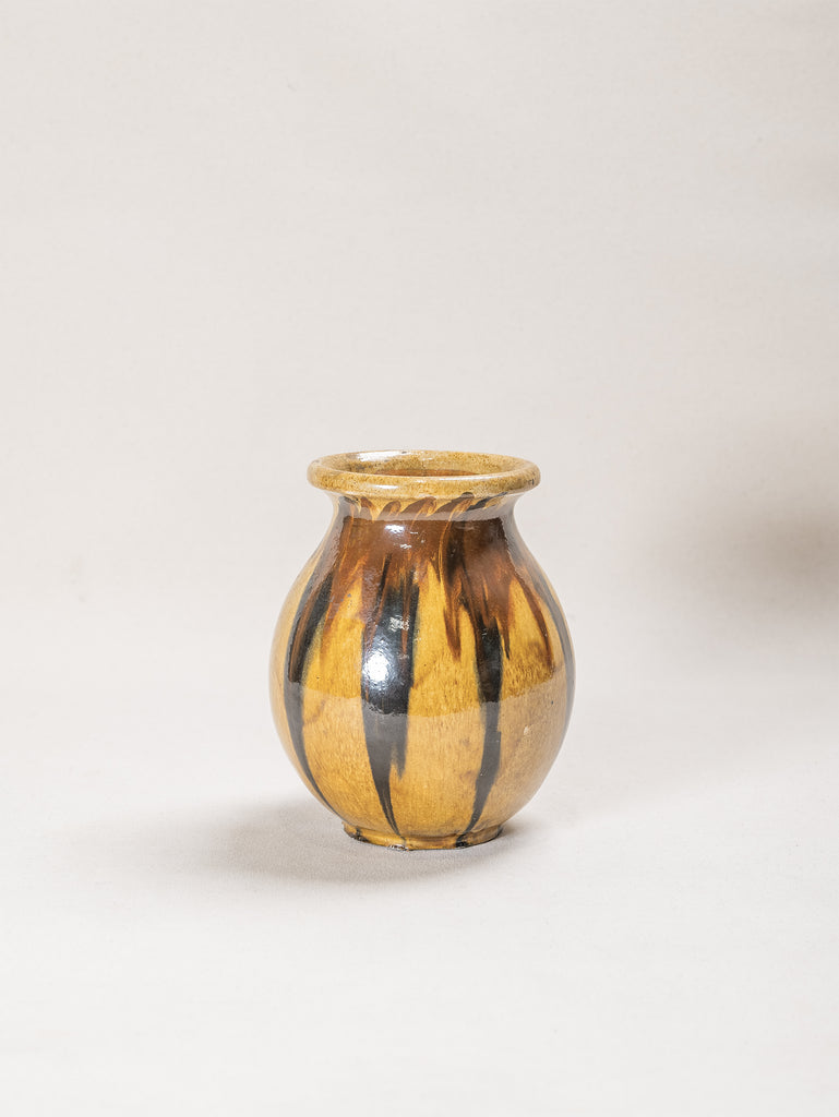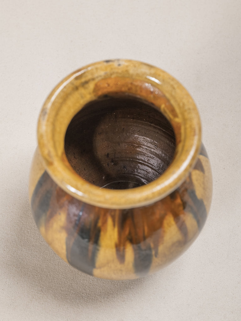 Vintage French terracotta gargoulette in a rich yellow glaze, accented with dark dripping tones that give it depth and movement. Traditionally used in Provence for storing water or wine, this small vessel captures the rustic beauty of southern French pottery. Its rounded form, tactile surface, and handmade imperfections bring a timeless warmth and character to any interior.