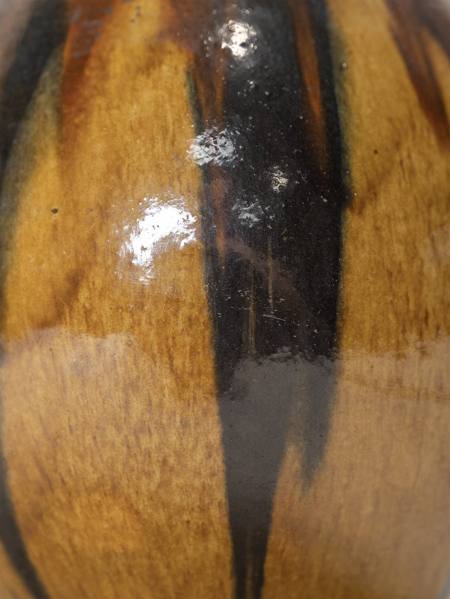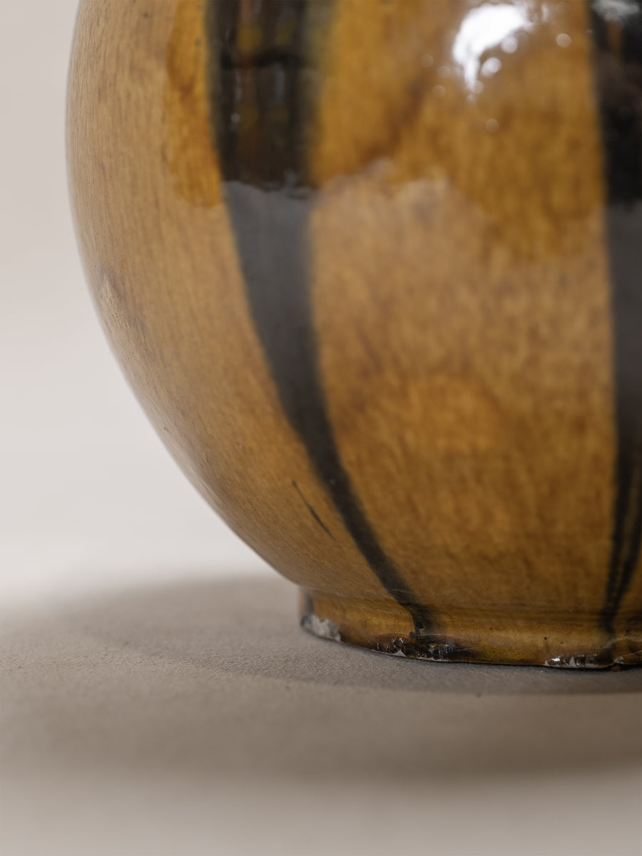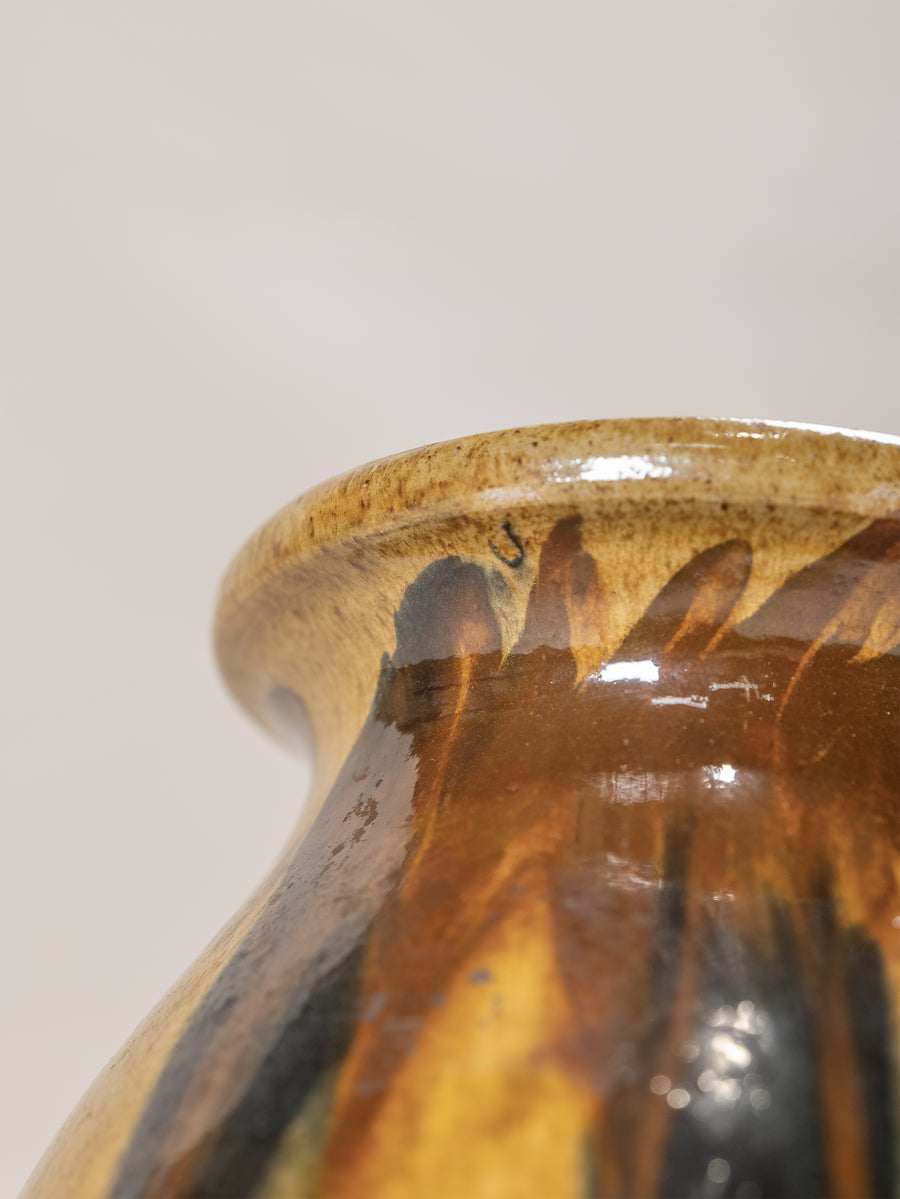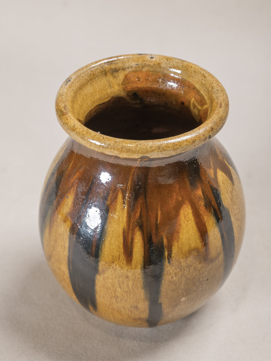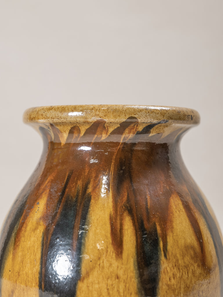 Vintage French terracotta gargoulette in a rich yellow glaze, accented with dark dripping tones that give it depth and movement. Traditionally used in Provence for storing water or wine, this small vessel captures the rustic beauty of southern French pottery. Its rounded form, tactile surface, and handmade imperfections bring a timeless warmth and character to any interior.