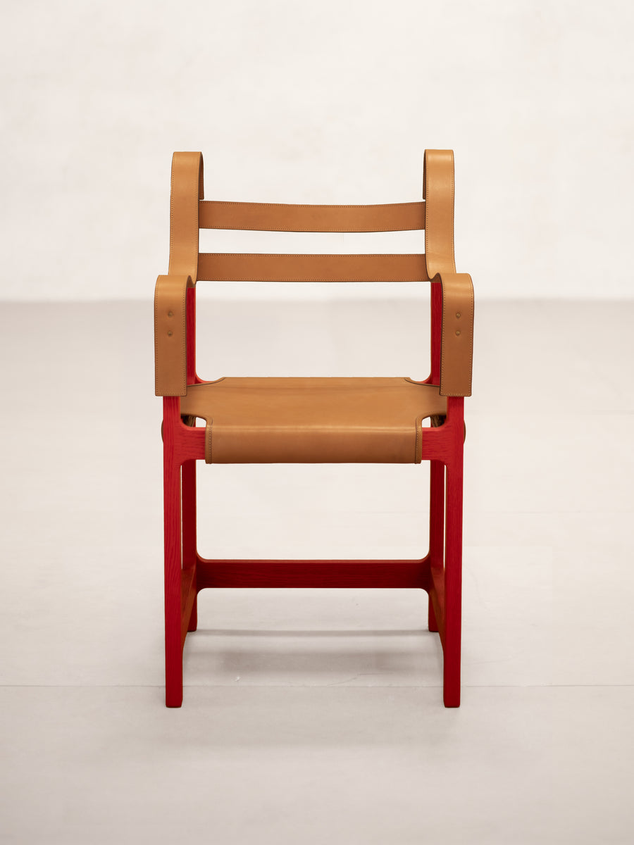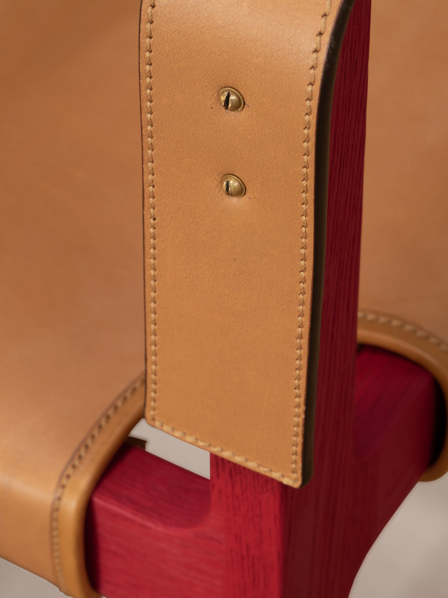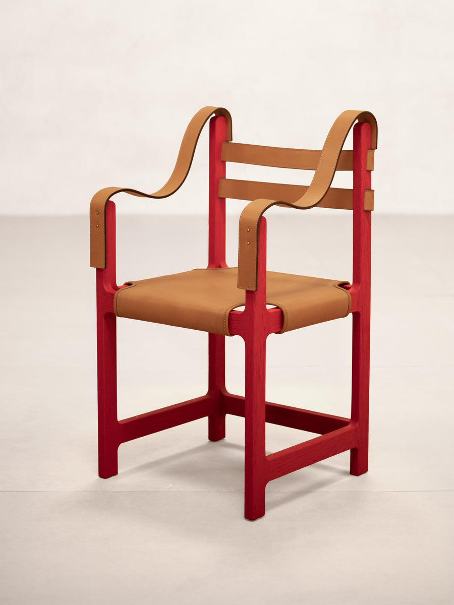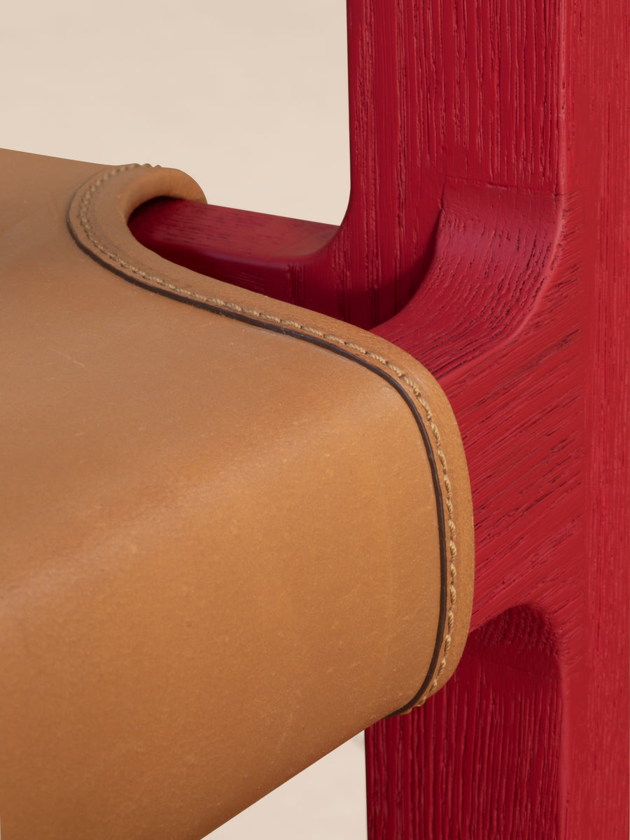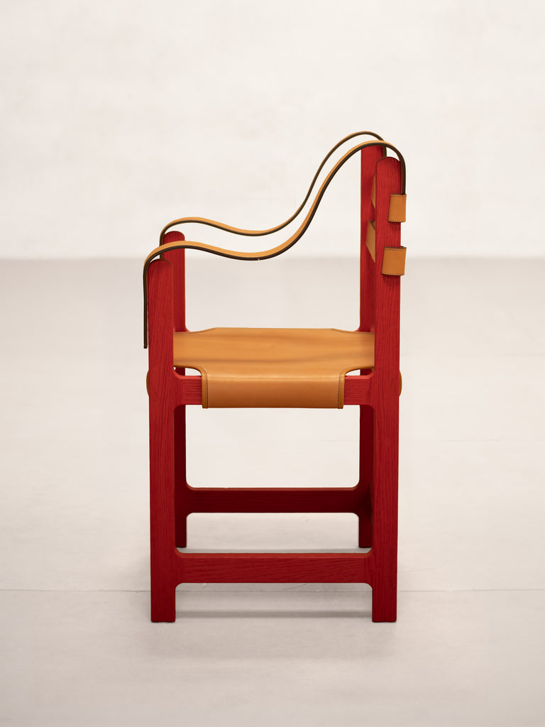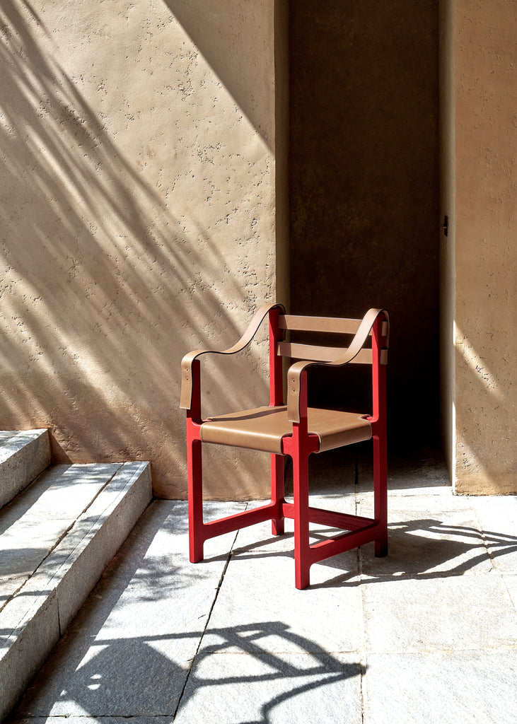 The original chair was likely tailored to Bawa’s own stature, as he stood well over six feet tall. The re-edition by Phantom Hands has been adjusted for greater comfort across a range of body types. The locally sourced tan coloured leather of the original has been replaced with high-quality Indian buffalo leather of a similar colour, sourced from J & R Guram, the renowned campaign furniture makers based in Delhi. The frame is crafted from North American red oak, chosen for its strength, environmental credentials, and ability to take colour. The wood is lightly brushed for a tactile feel, painted red in a RAL 3002 shade to match the original and sealed with an eco-friendly, water-based finish.