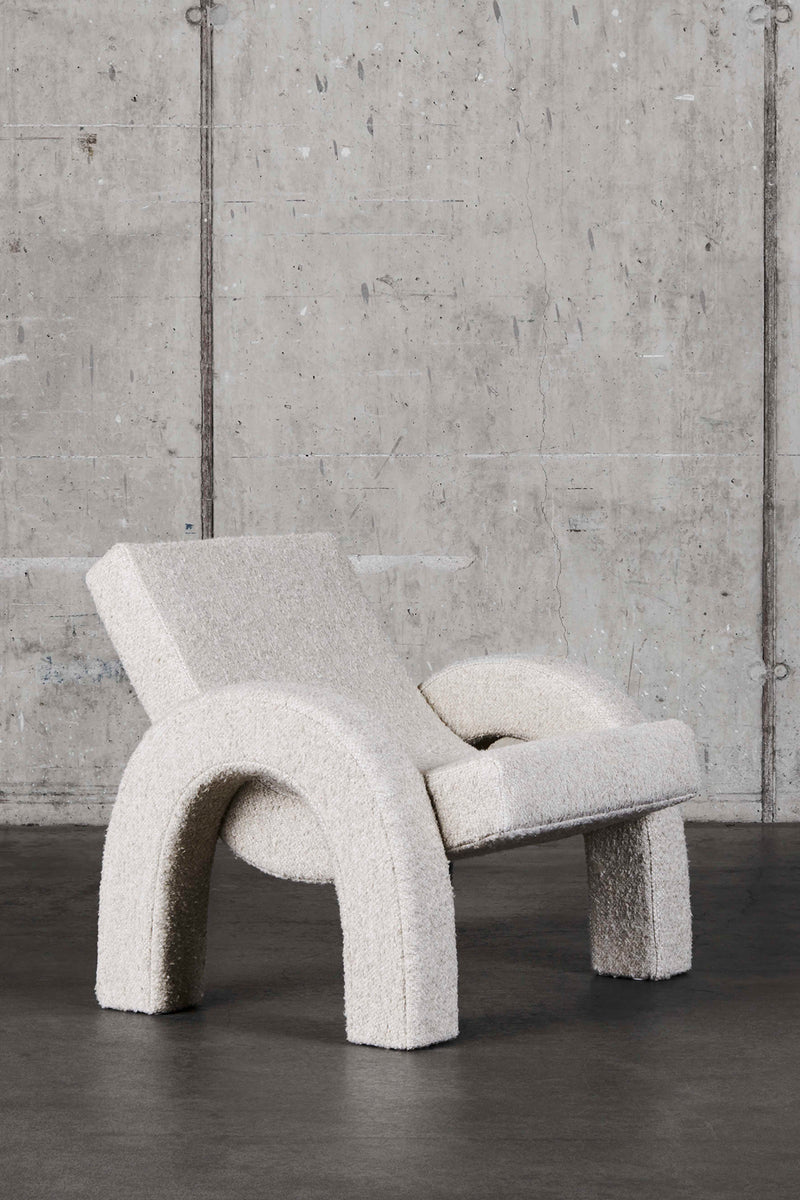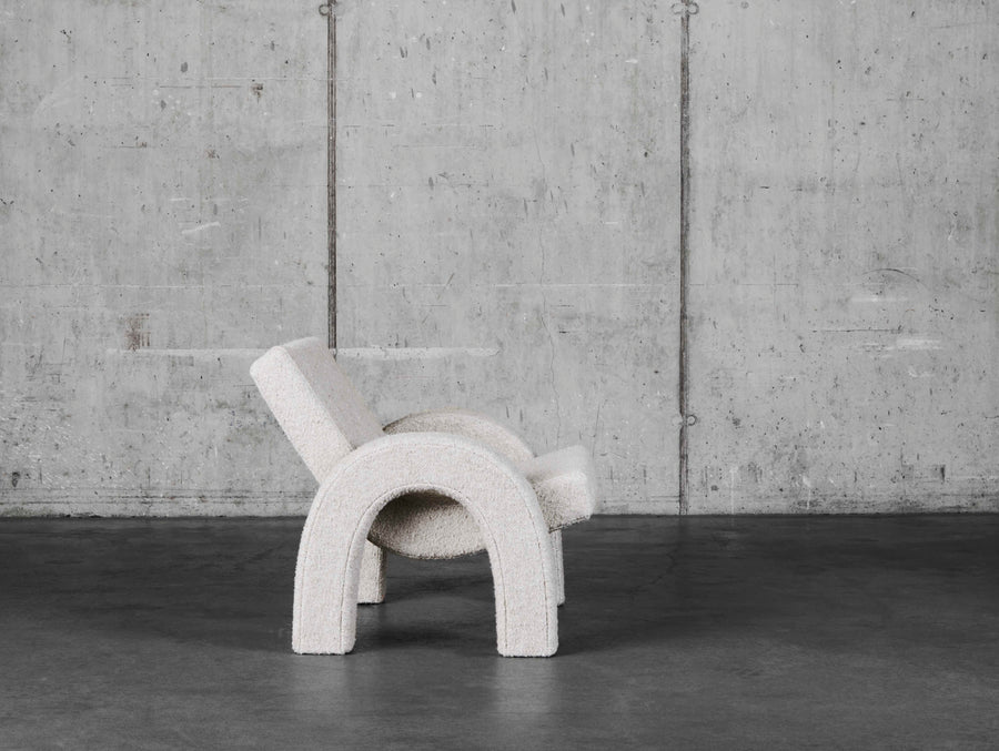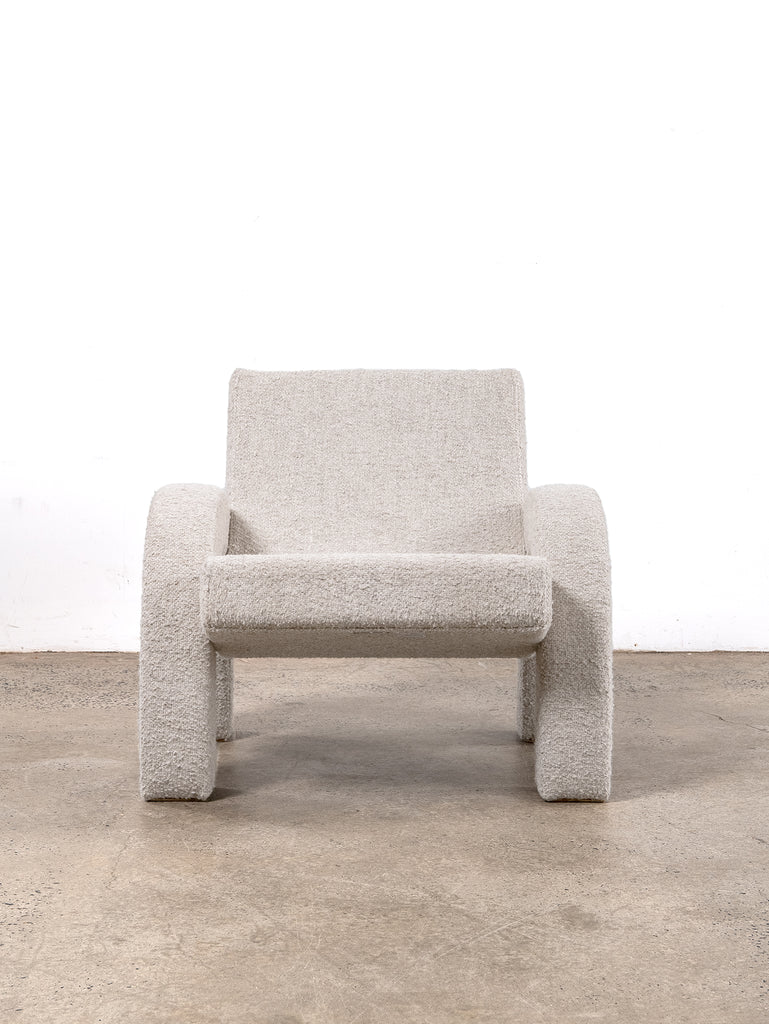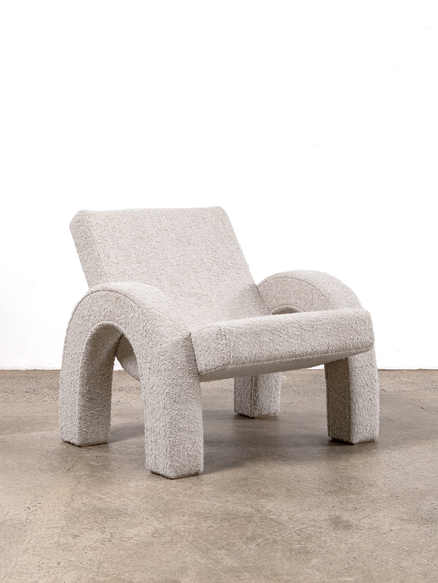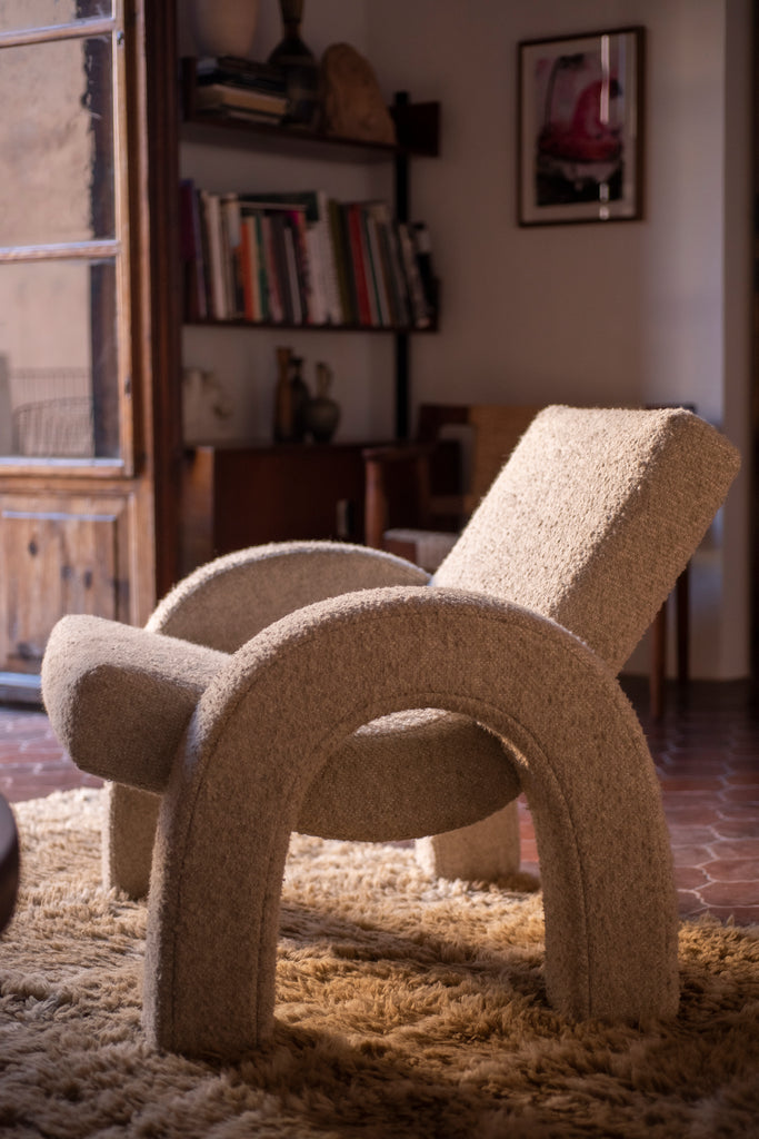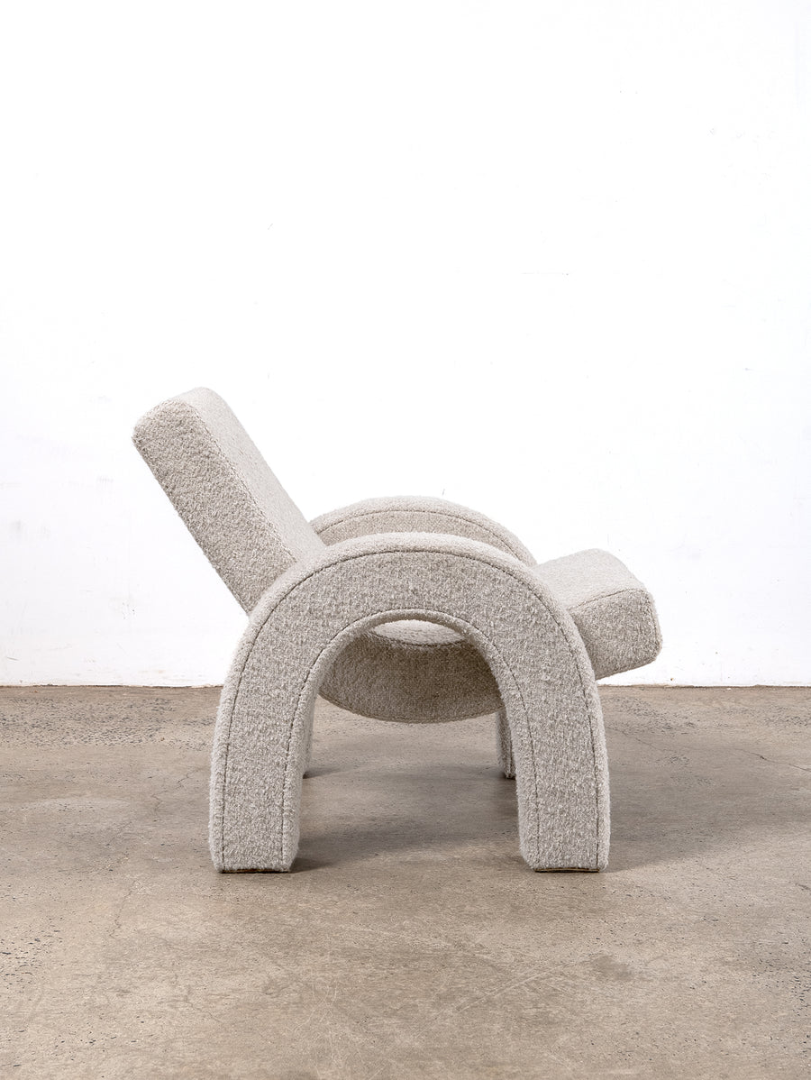 Dusty Deco Arco Lounge Chair in Astrid Mons Natural Boucle Upholstery.