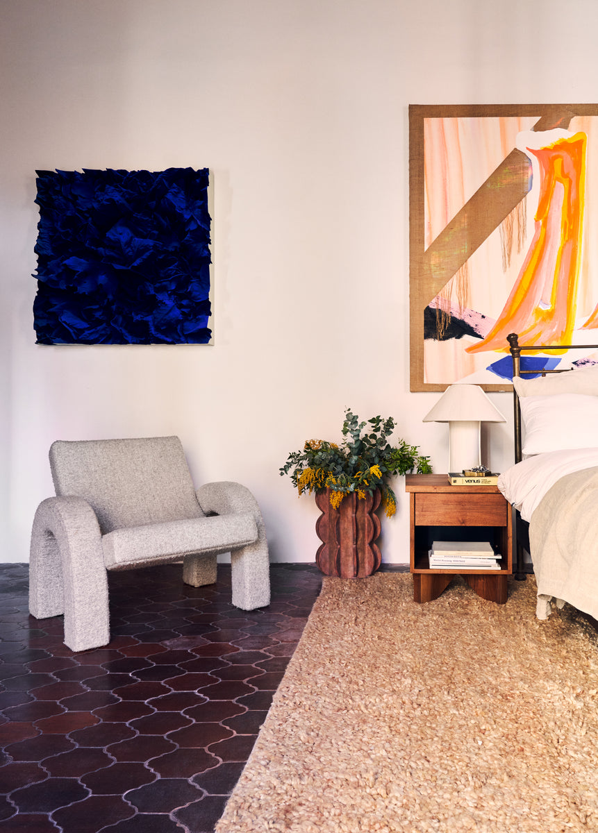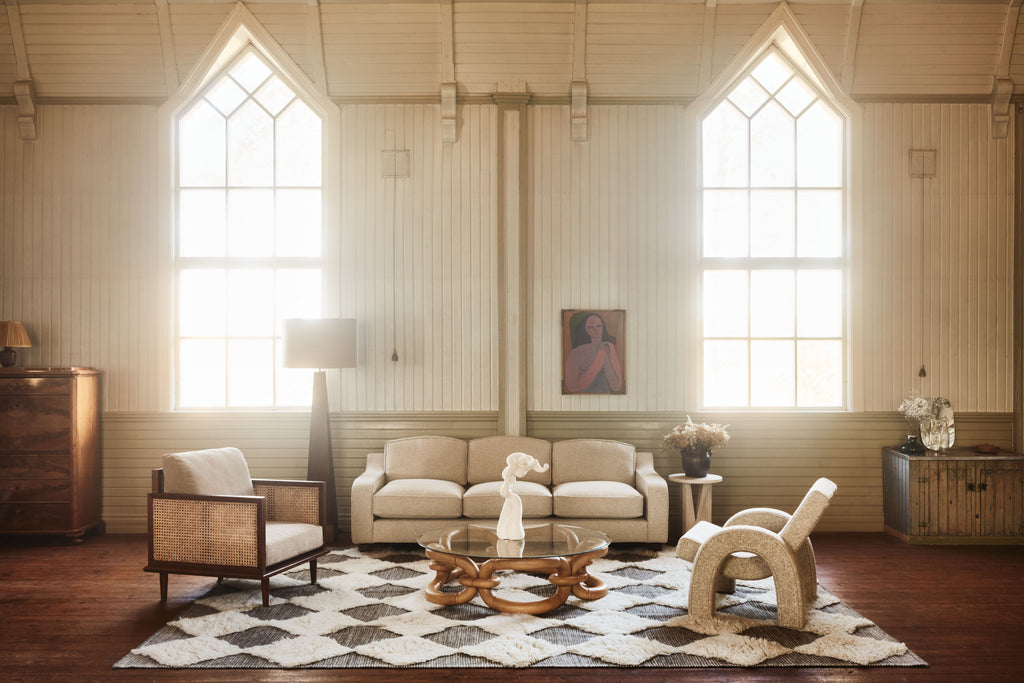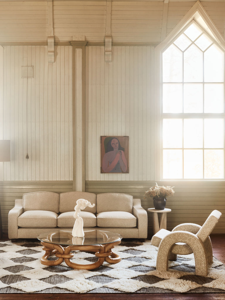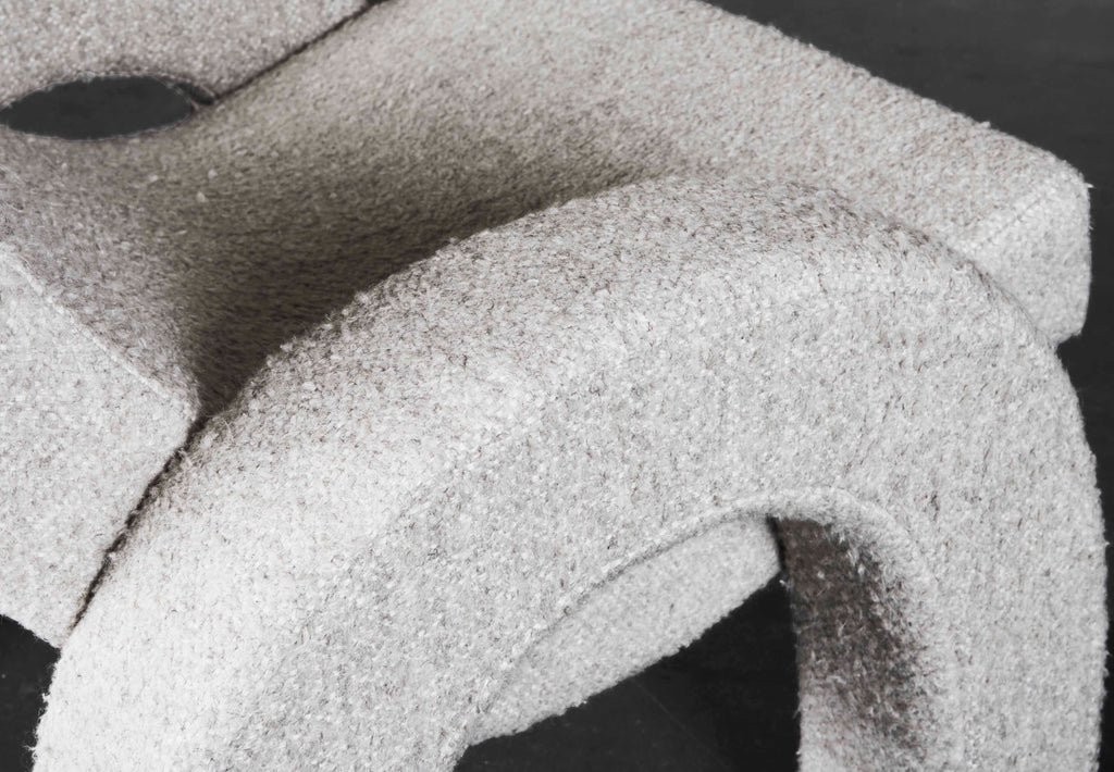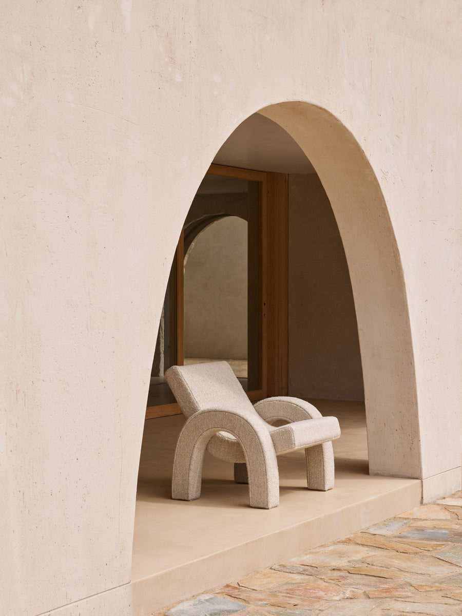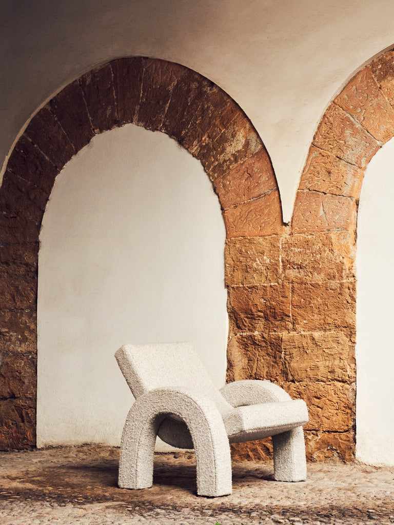Dusty Deco Arco Lounge Chair in Astrid Mons Natural Boucle Upholstery.