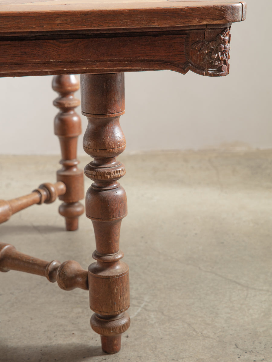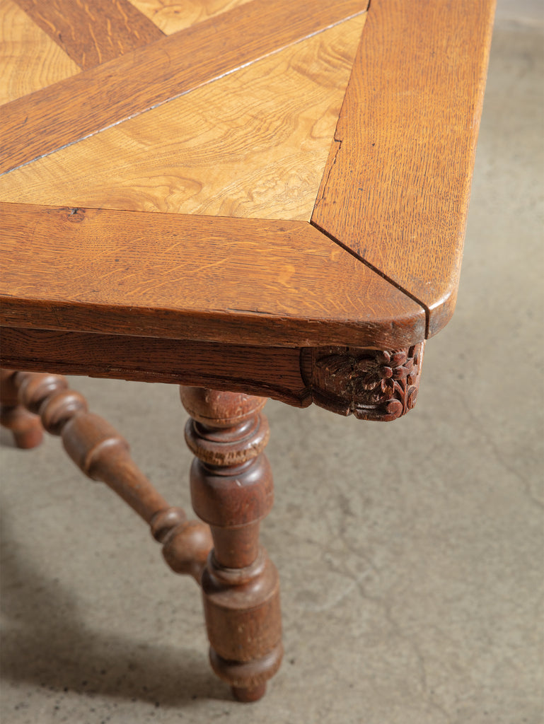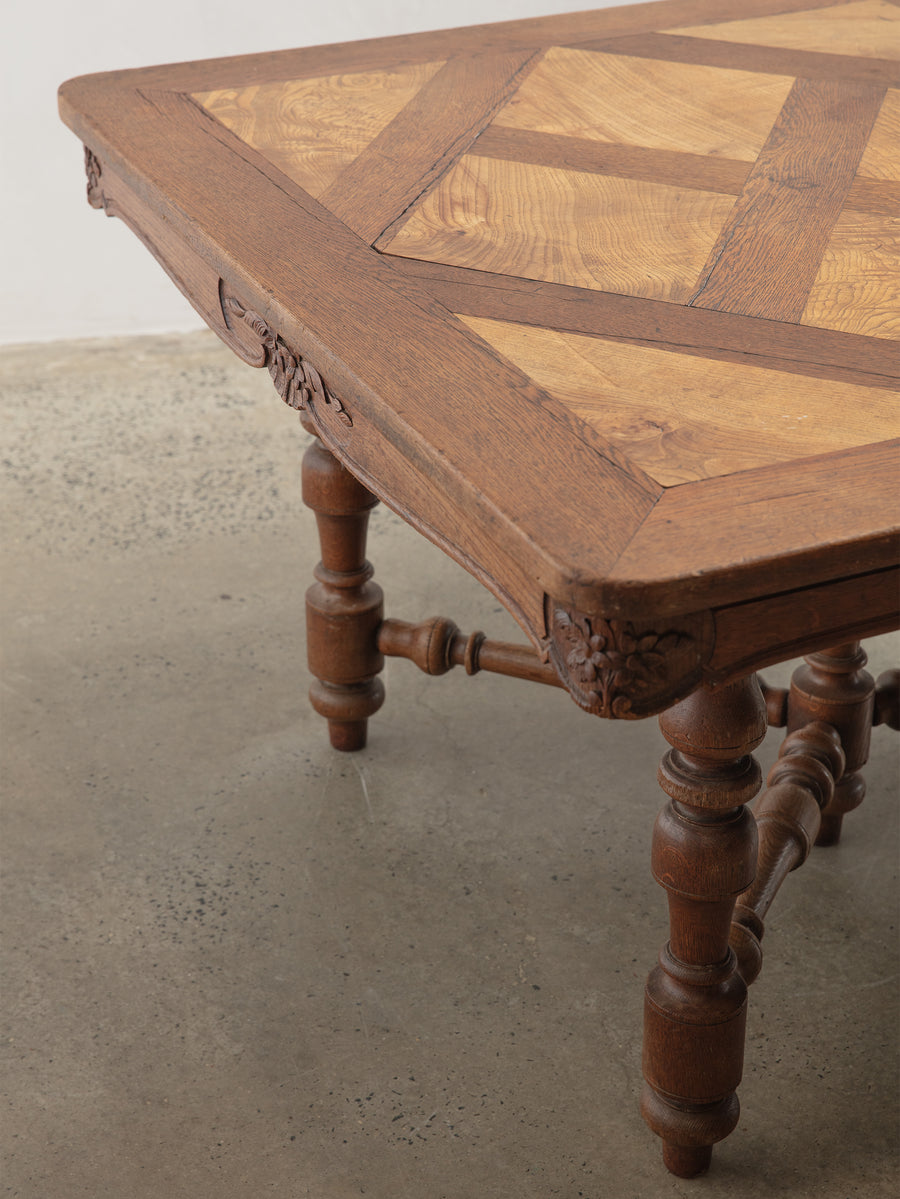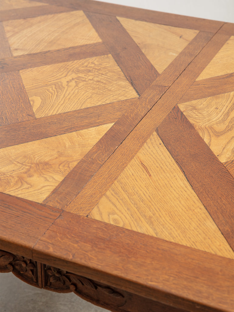 An exceptional oak dining table with parquetry inlay and beautifully hand-carved legs, sourced from an 18th-century French château. The craftsmanship speaks to its provenance - rich tones of aged timber, intricate detailing, and extendable leaves that transform it into an impressive, banquet-sized piece. Grand yet inviting, it embodies the enduring charm of French heritage furniture and the quiet grandeur of its origins.