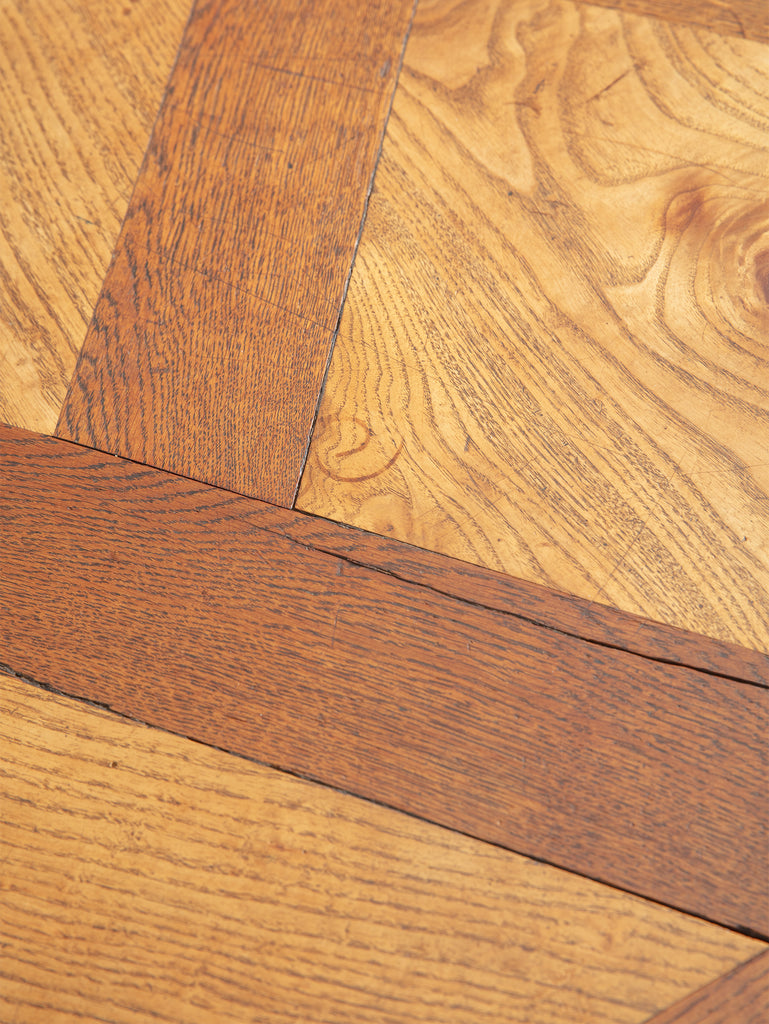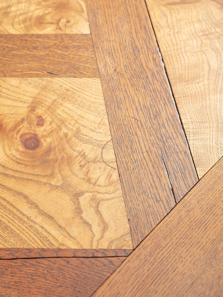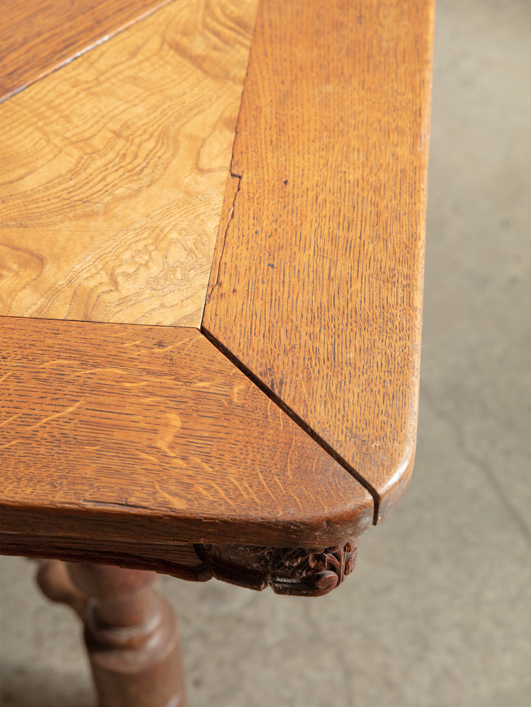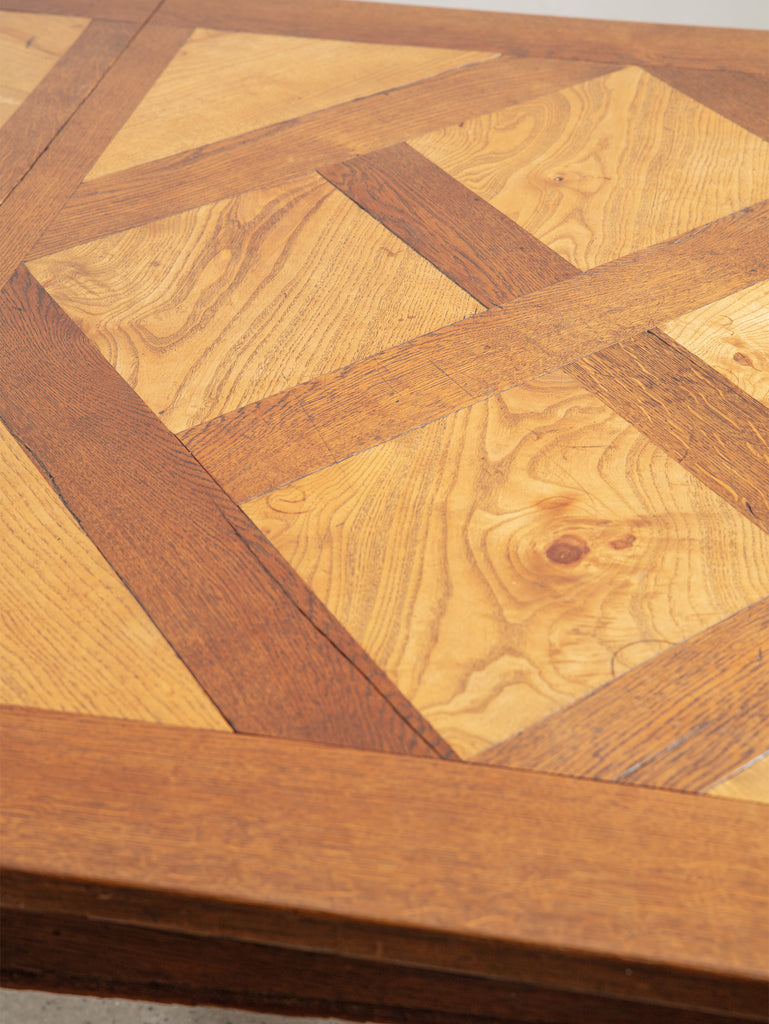 An exceptional oak dining table with parquetry inlay and beautifully hand-carved legs, sourced from an 18th-century French château. The craftsmanship speaks to its provenance - rich tones of aged timber, intricate detailing, and extendable leaves that transform it into an impressive, banquet-sized piece. Grand yet inviting, it embodies the enduring charm of French heritage furniture and the quiet grandeur of its origins.