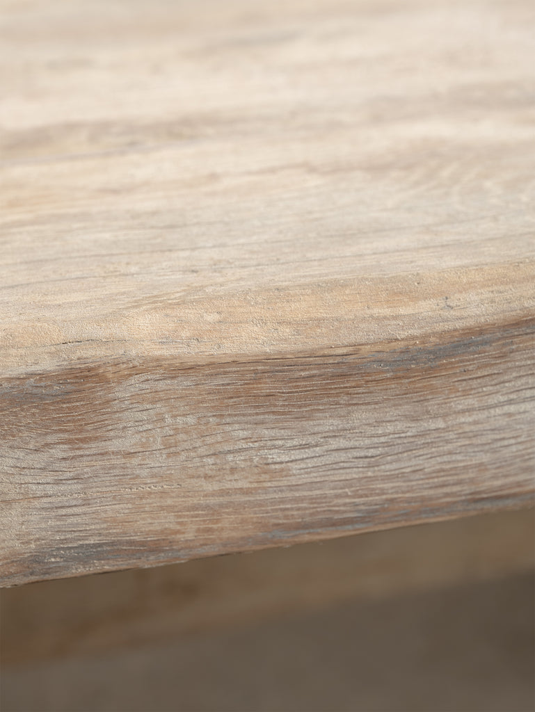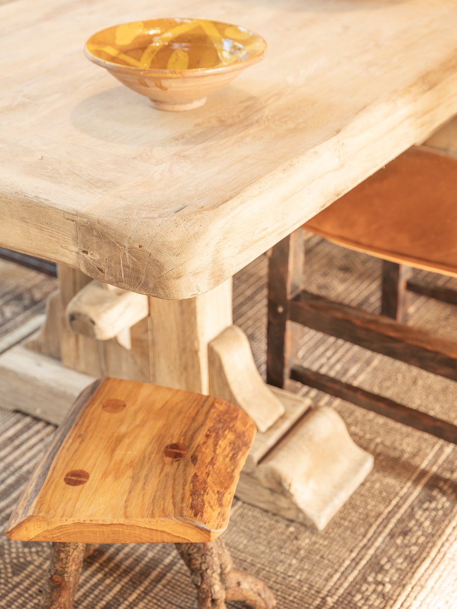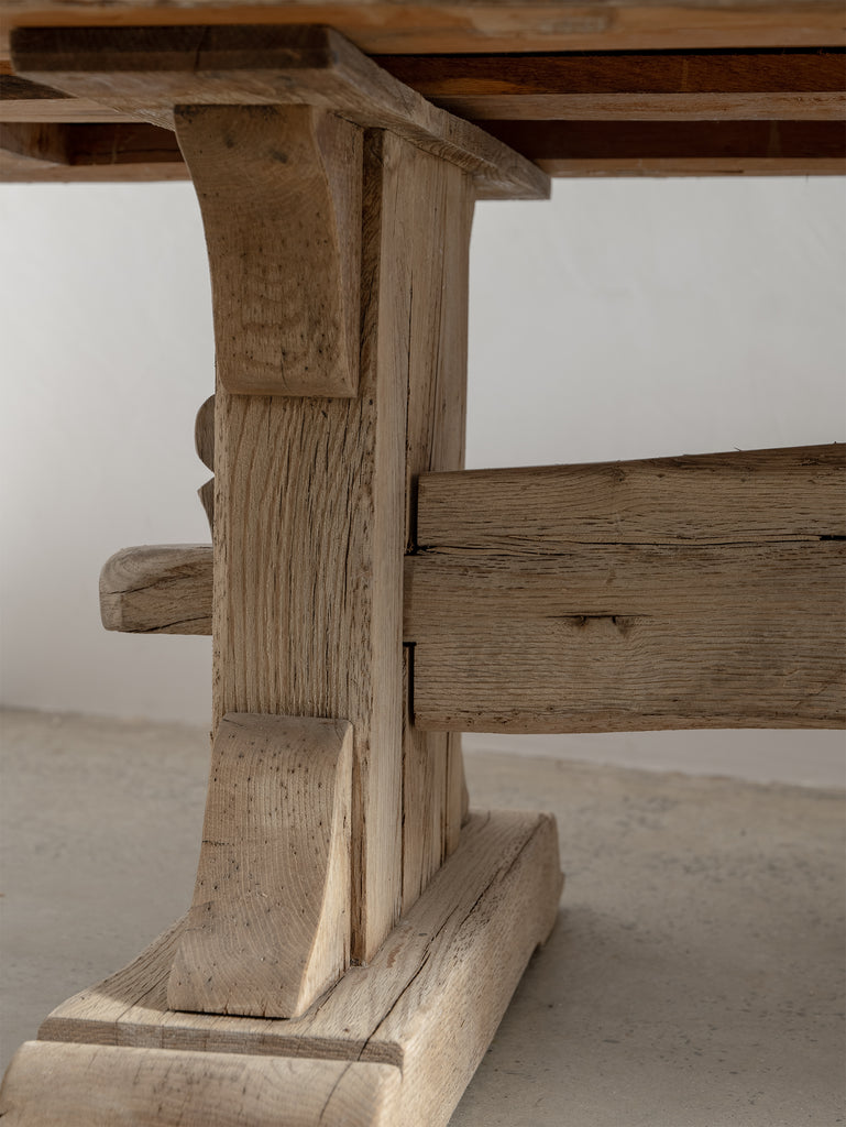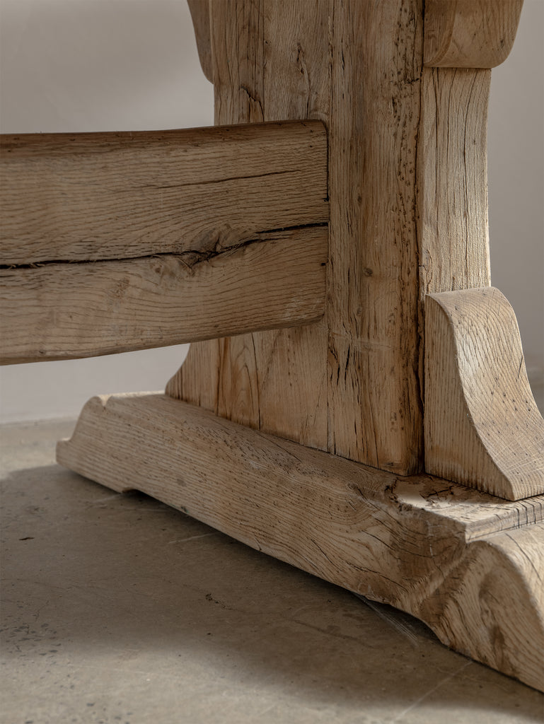 A large French oak farmhouse table with a super solid top, sturdy legs and cross beam support. Early 20th century in origin, it has been carefully stripped back to reveal the raw beauty of the timber, leaving a soft, tactile finish that highlights its natural grain and timeworn character. Both generous and grounding in scale, this piece carries the quiet strength of farmhouse craftsmanship while offering a timeless, versatile centrepiece for the dining space.