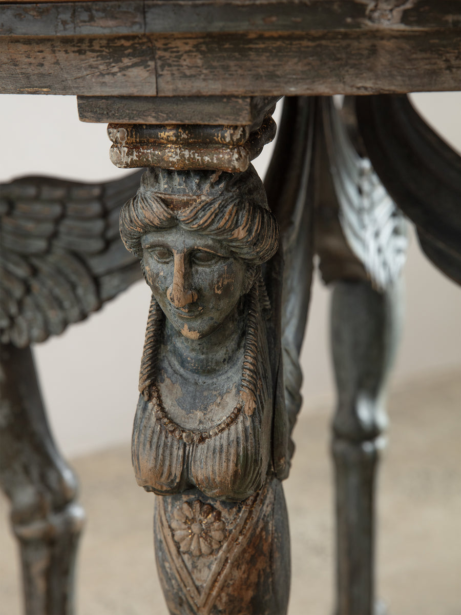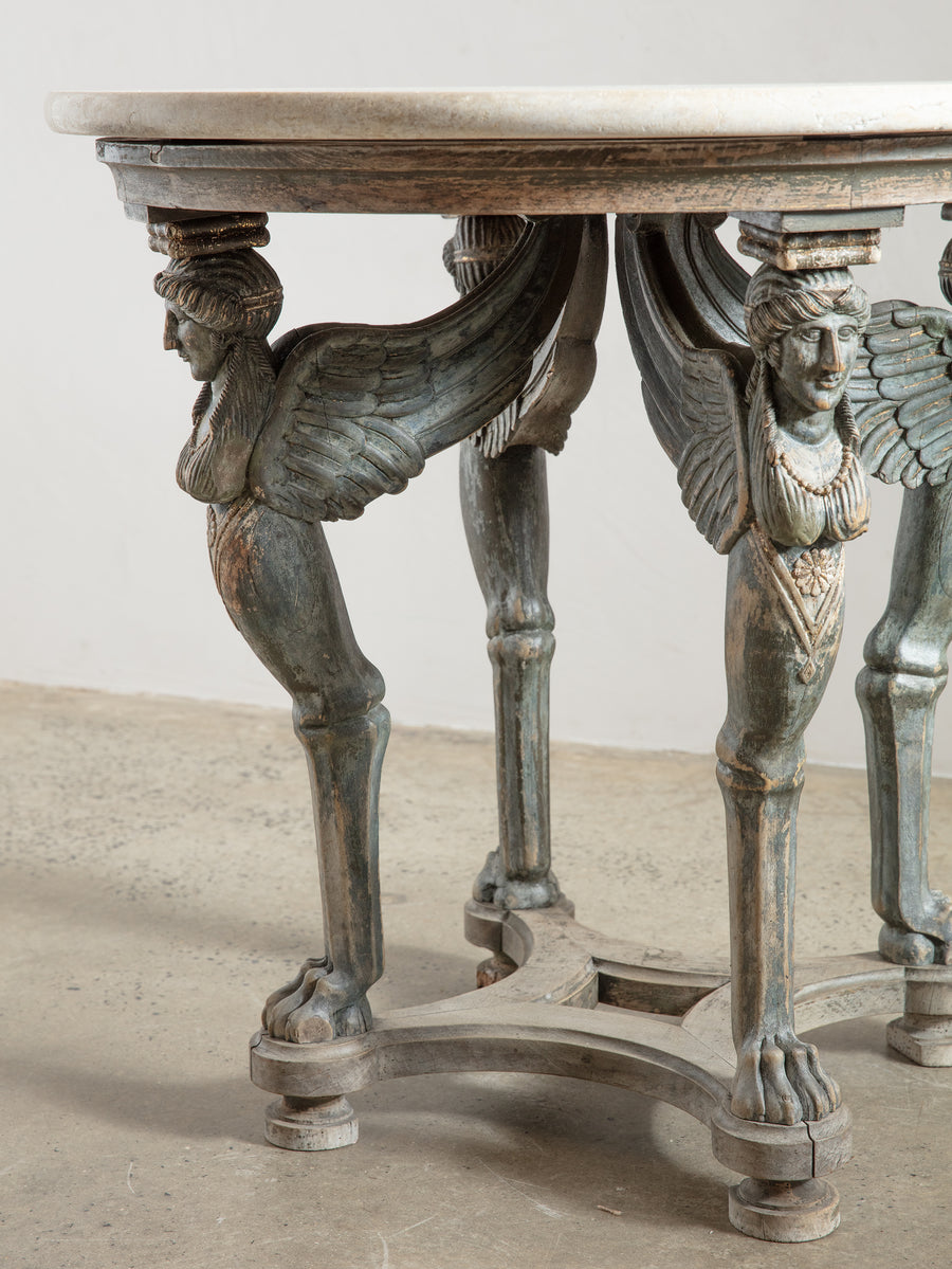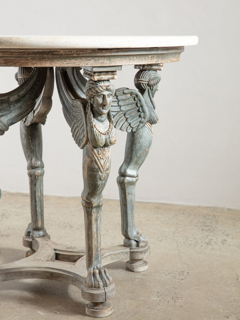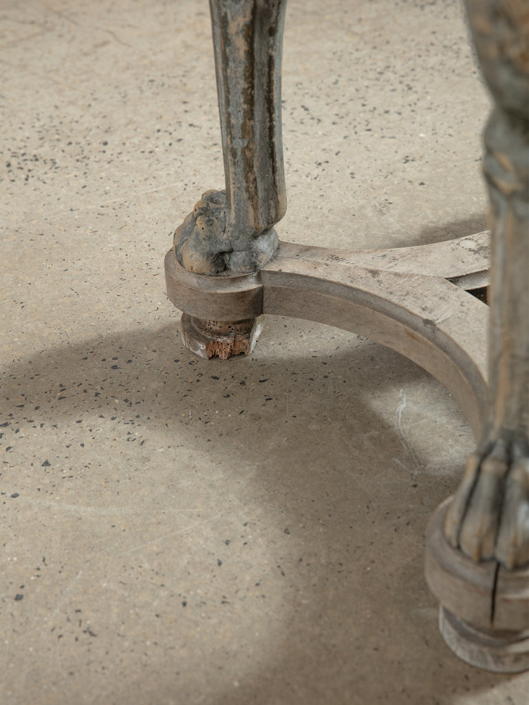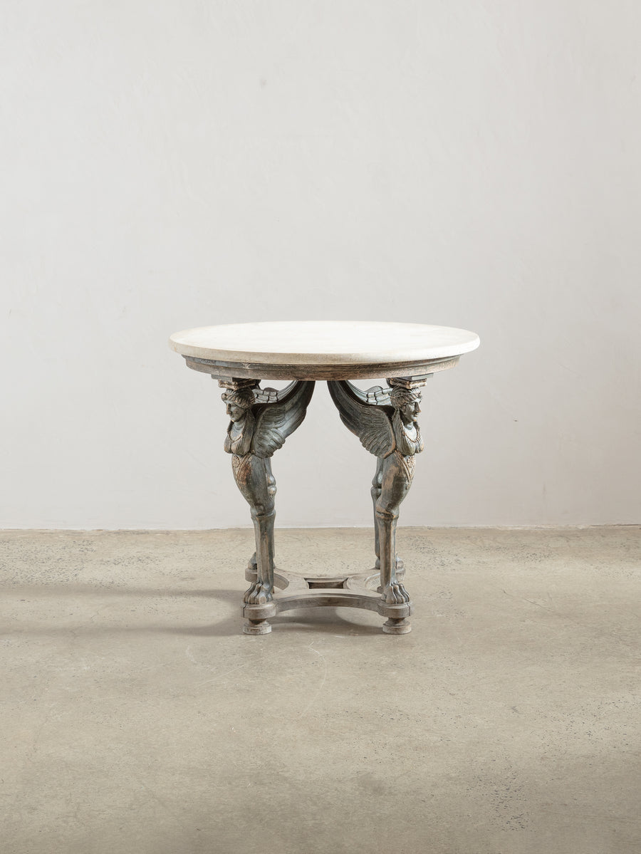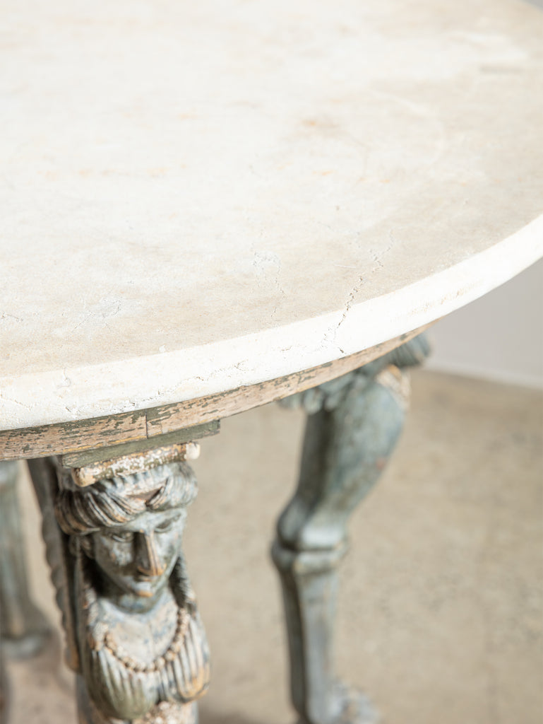 A sculptural round table marrying classical form with artisan craftsmanship. The marble top rests upon a base of hand-carved timber figures, each leg detailed with ornate precision and a soft patinated finish that speaks to its age. Decorative yet functional, it’s a remarkable piece that captures the elegance and drama of early 20th-century French design.