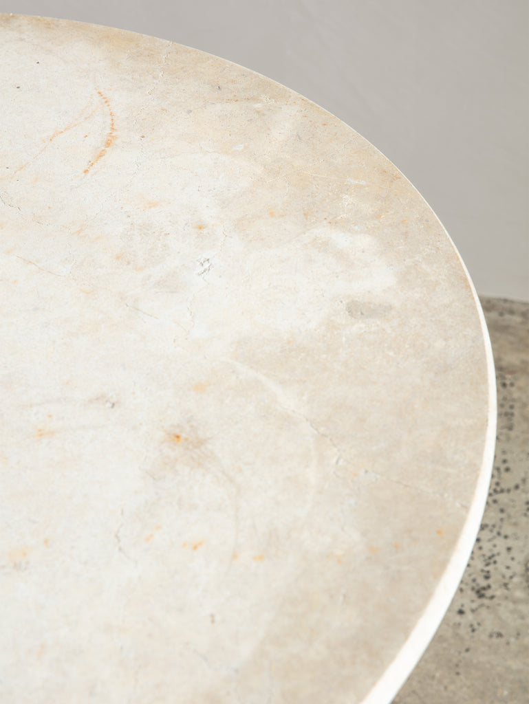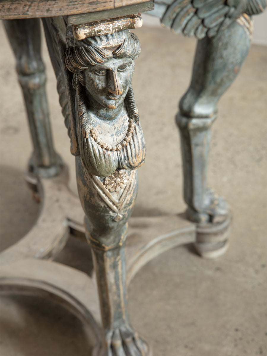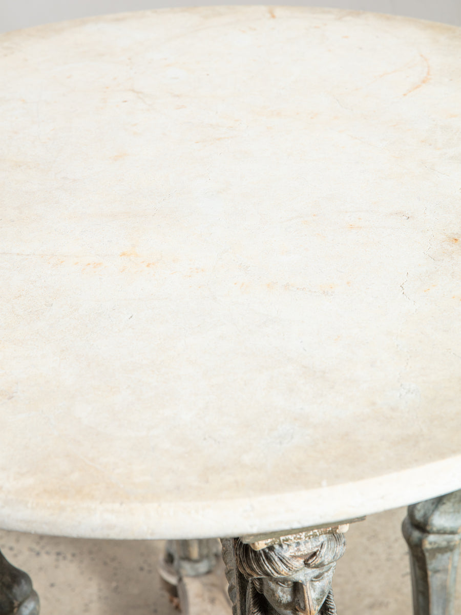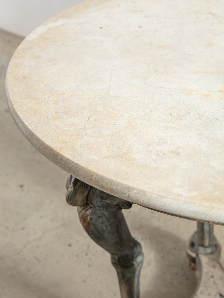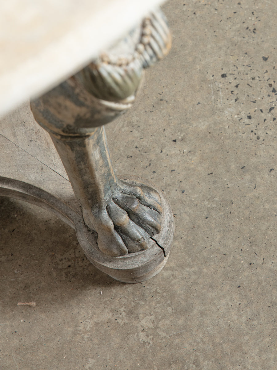 A sculptural round table marrying classical form with artisan craftsmanship. The marble top rests upon a base of hand-carved timber figures, each leg detailed with ornate precision and a soft patinated finish that speaks to its age. Decorative yet functional, it’s a remarkable piece that captures the elegance and drama of early 20th-century French design.