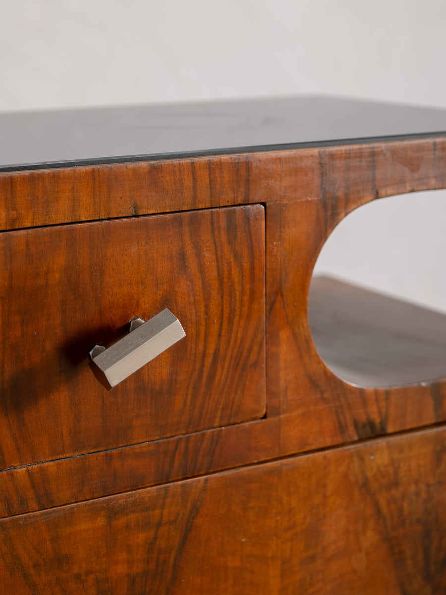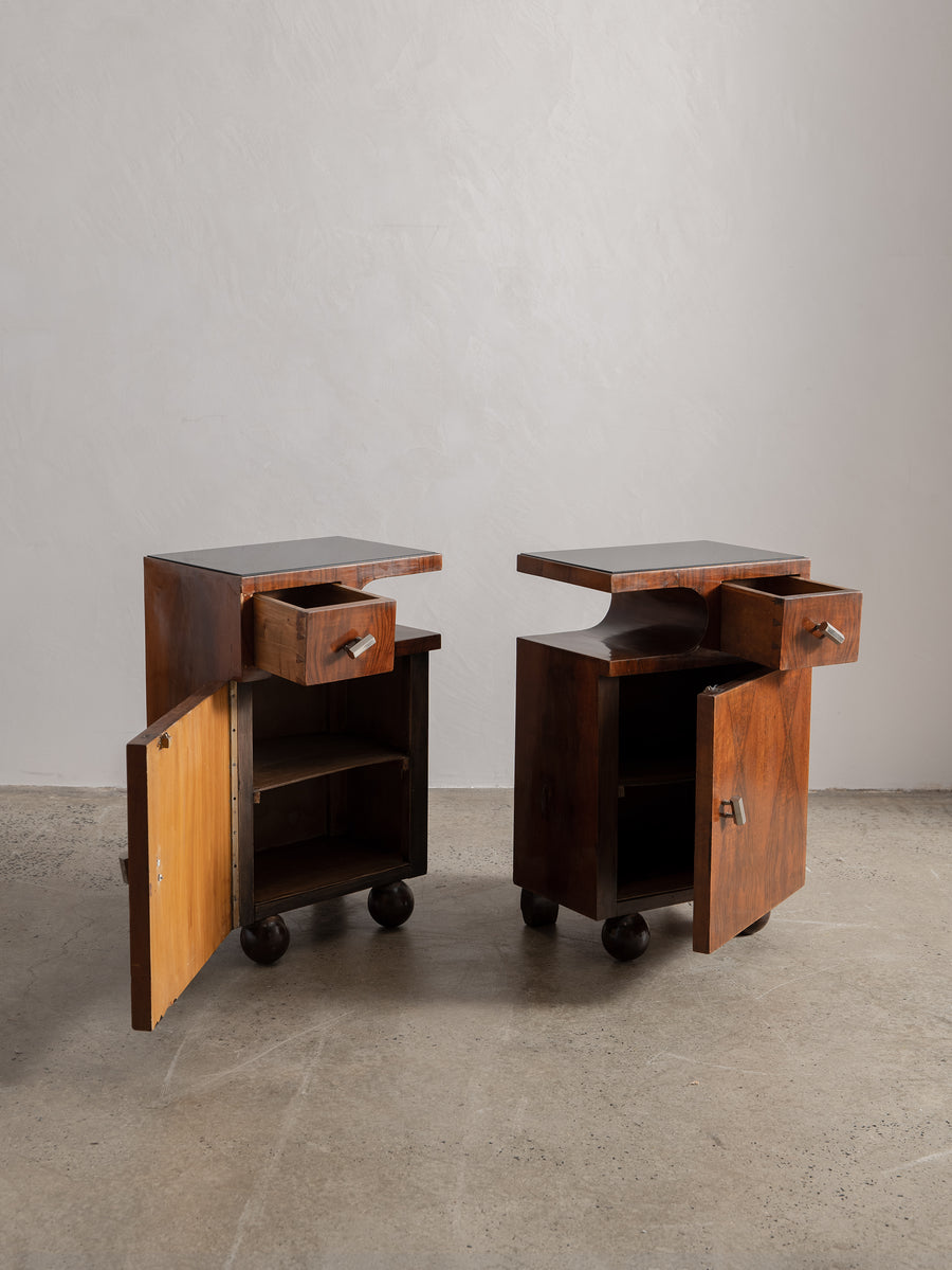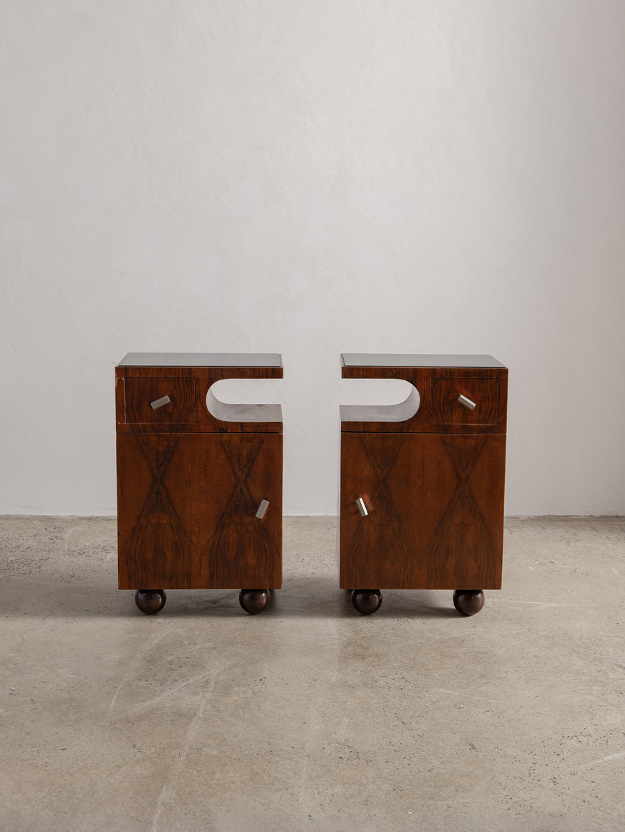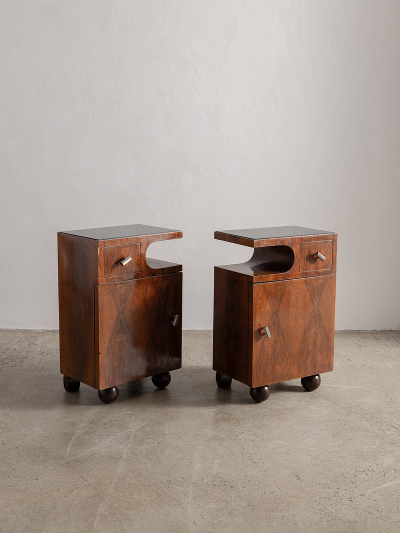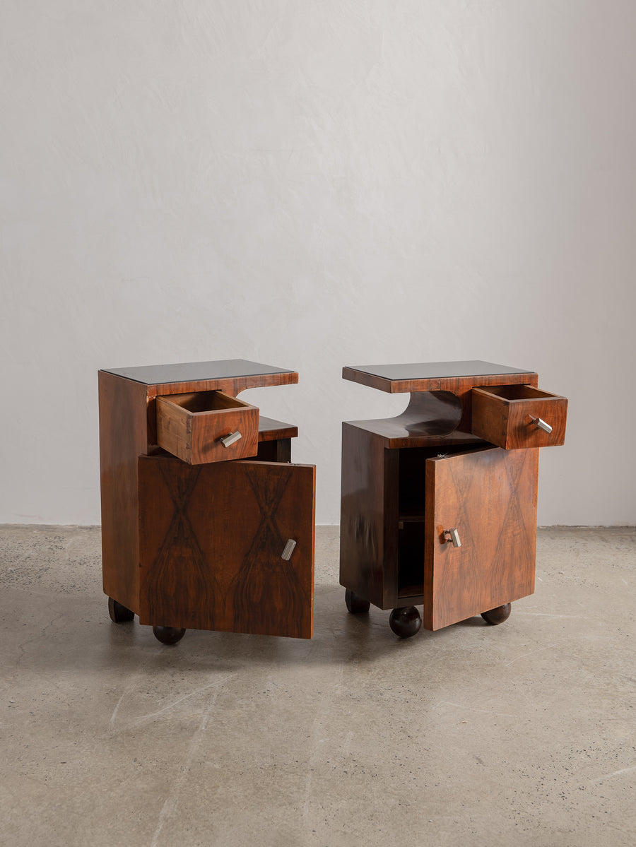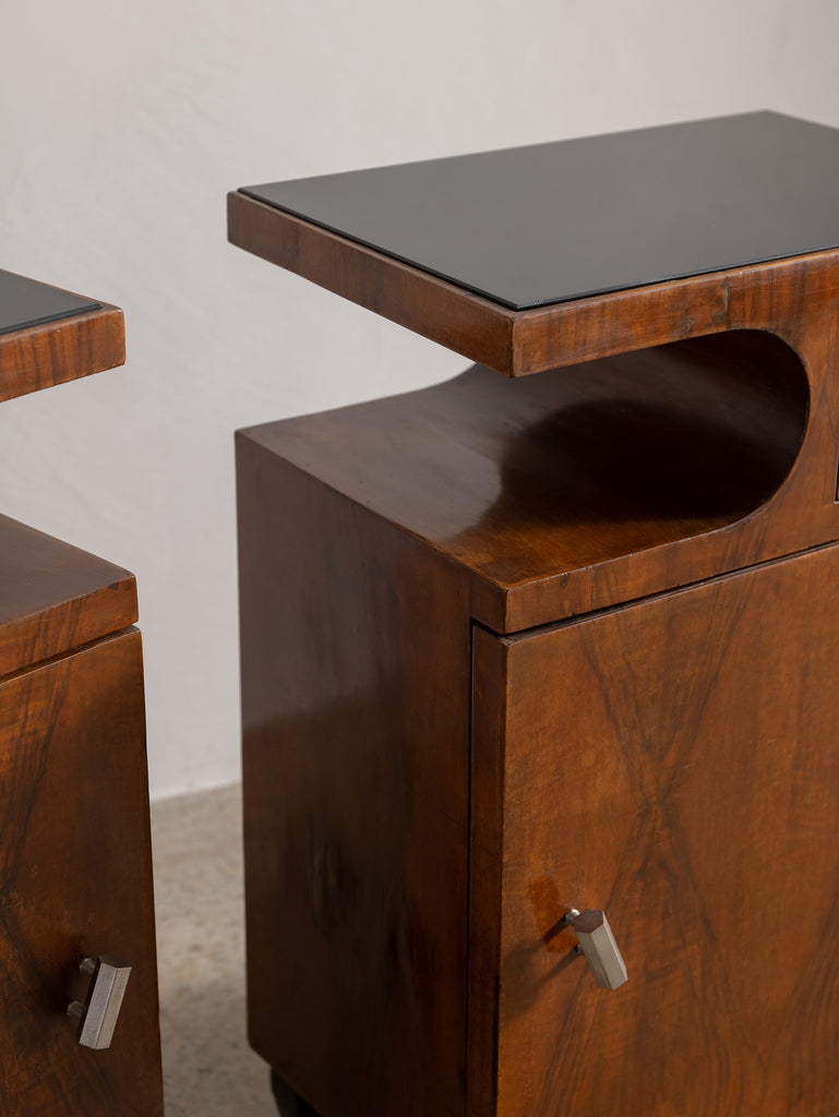1930s Pair of Deco Bedside Tables in Wood, Glass & Metal