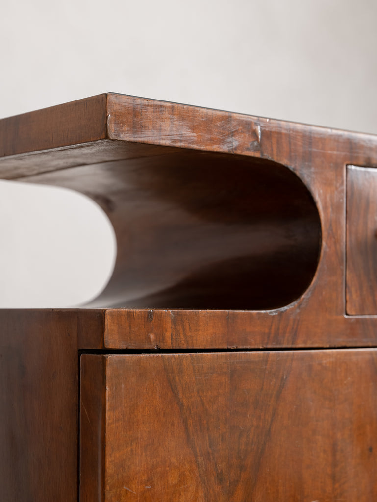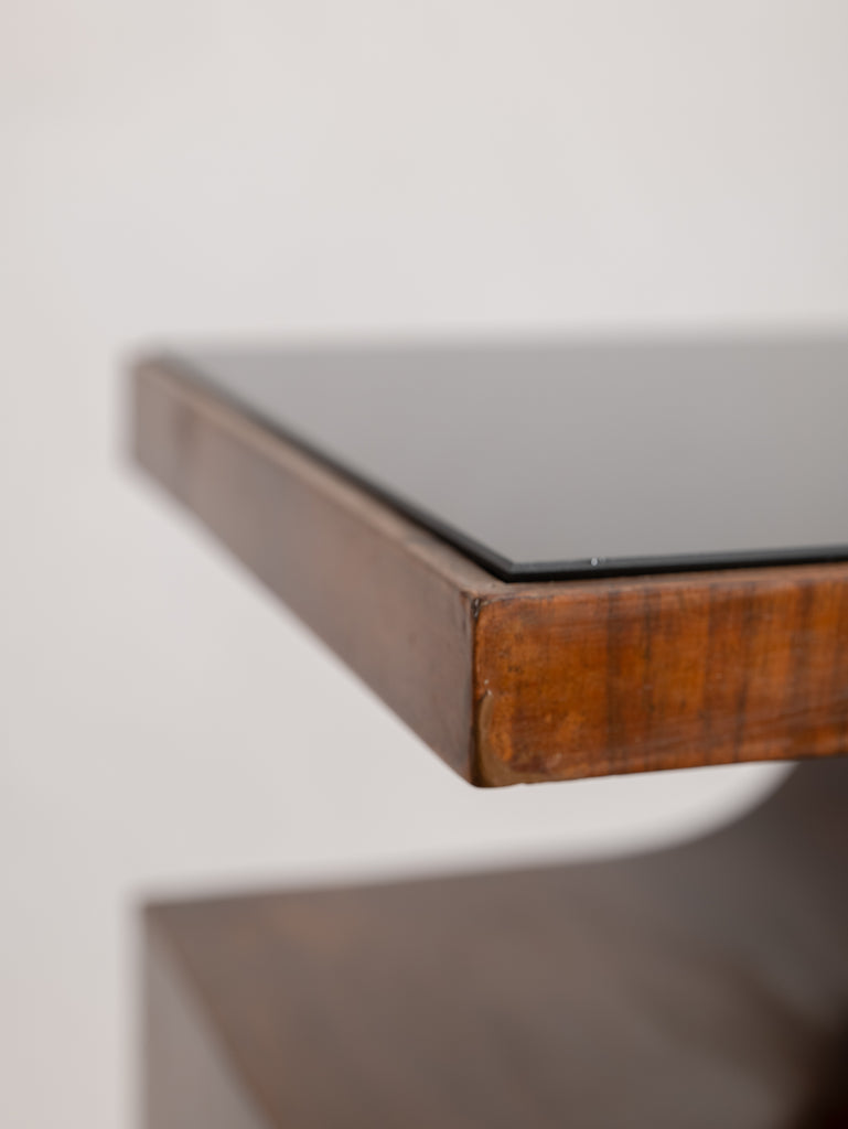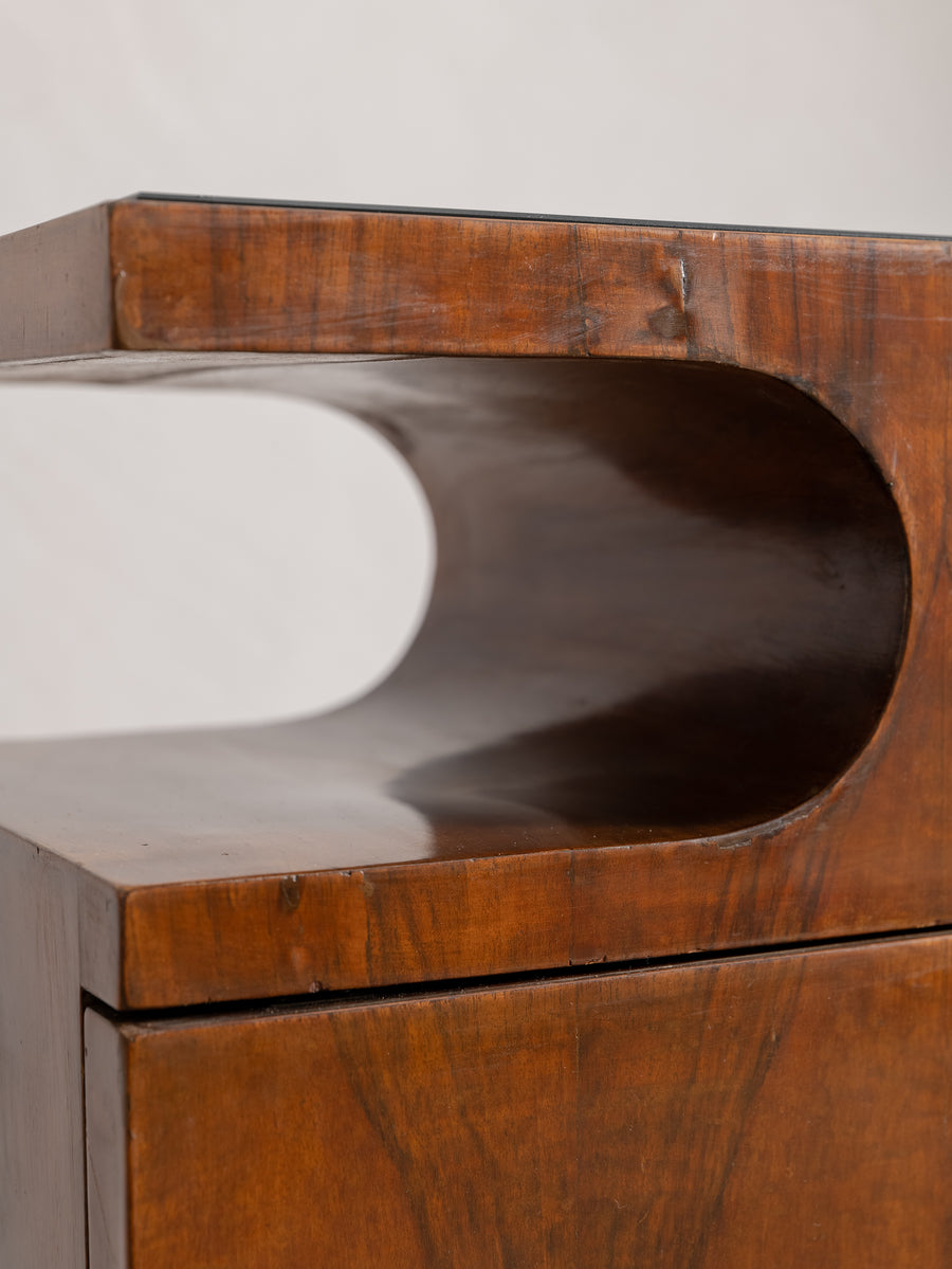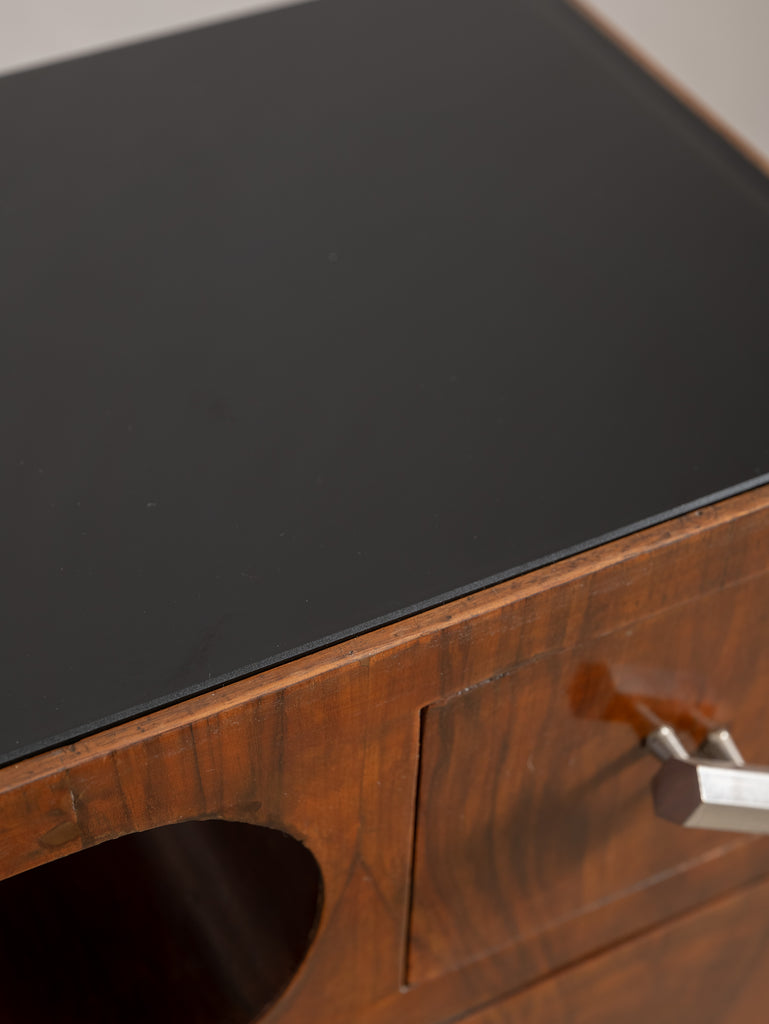 An elegant expression of Art Deco design, this pair of 1930s bedside tables embodies the quiet glamour of the era. Crafted from wood with metal accents, their structured form is softened by time—heritage marks, gentle chipping, and a soft sheen on the veneer speaking to their storied past. A newly added smoked glass top refines the look, offering a subtle contrast to the warmth of the wood.