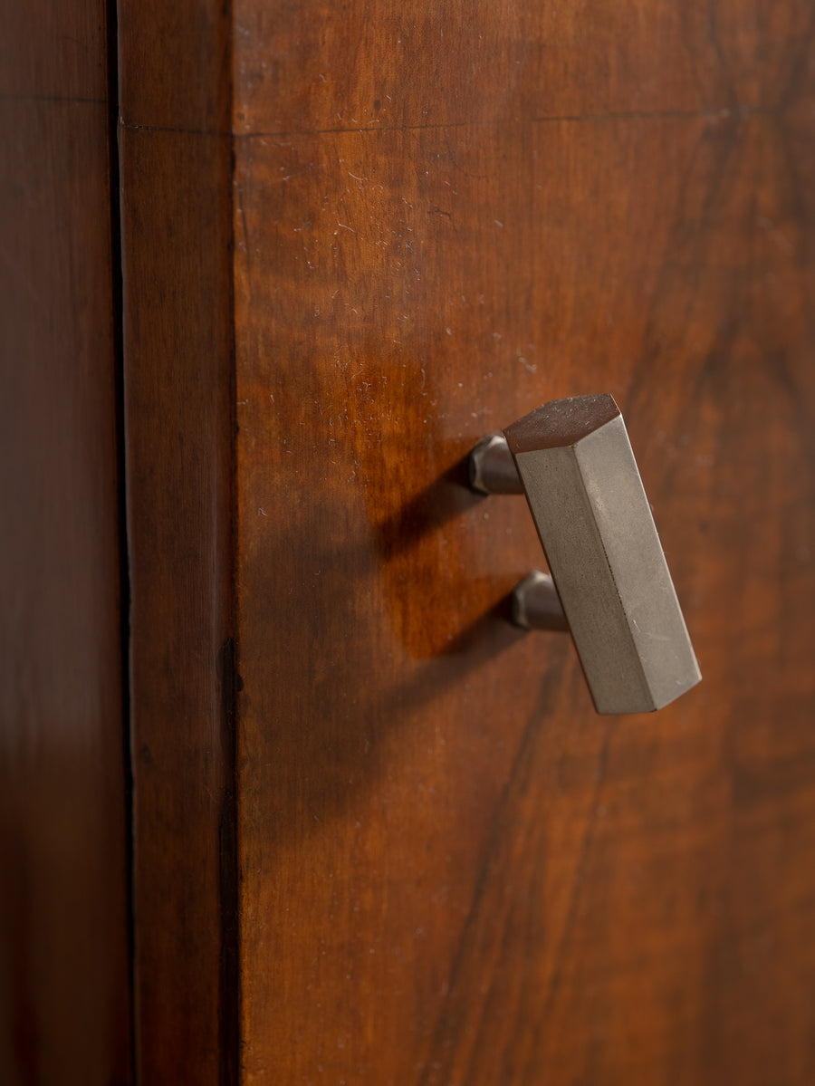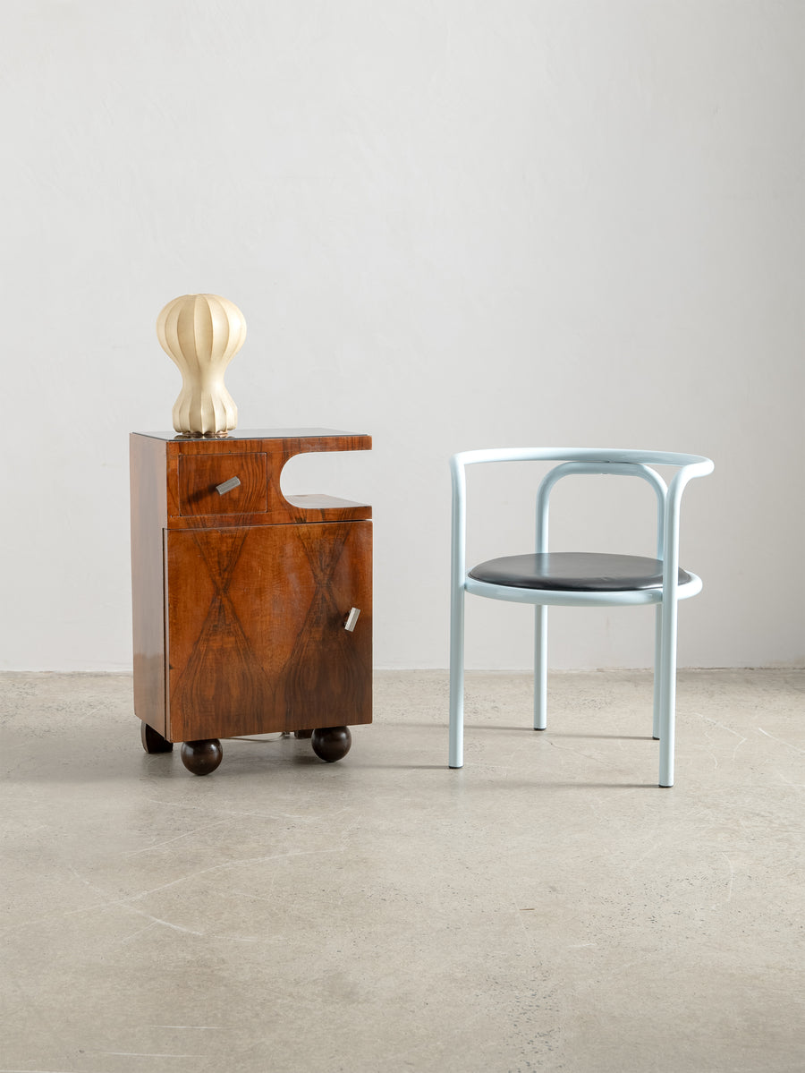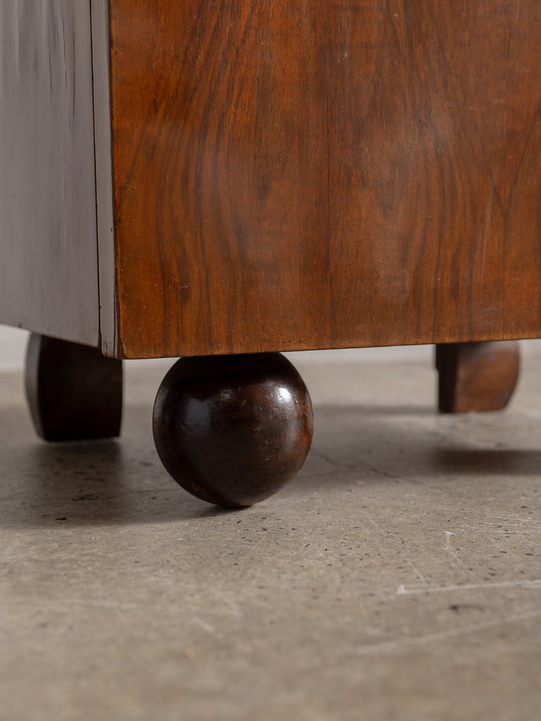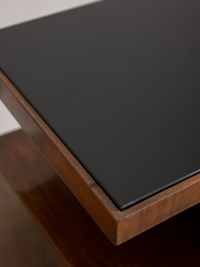 An elegant expression of Art Deco design, this pair of 1930s bedside tables embodies the quiet glamour of the era. Crafted from wood with metal accents, their structured form is softened by time—heritage marks, gentle chipping, and a soft sheen on the veneer speaking to their storied past. A newly added smoked glass top refines the look, offering a subtle contrast to the warmth of the wood.