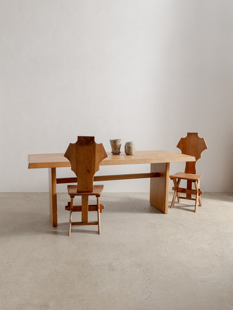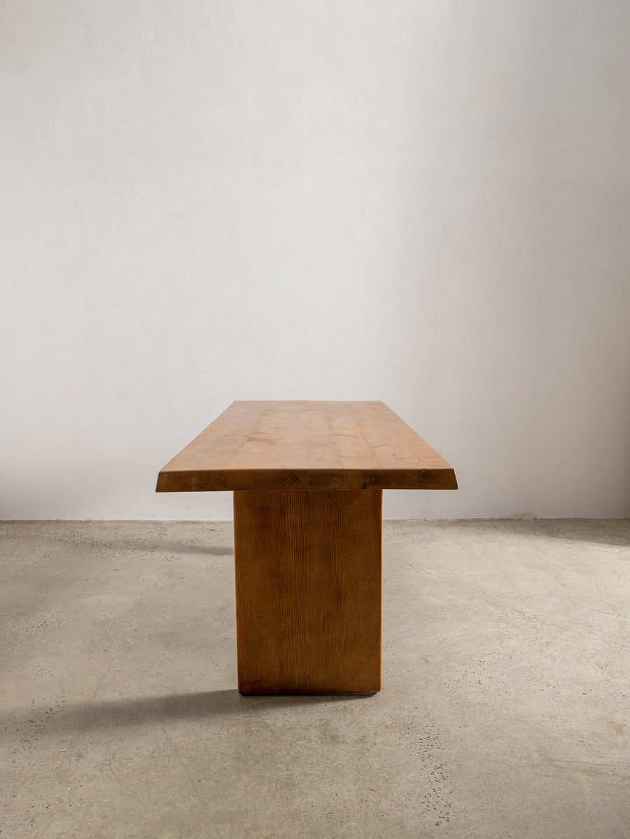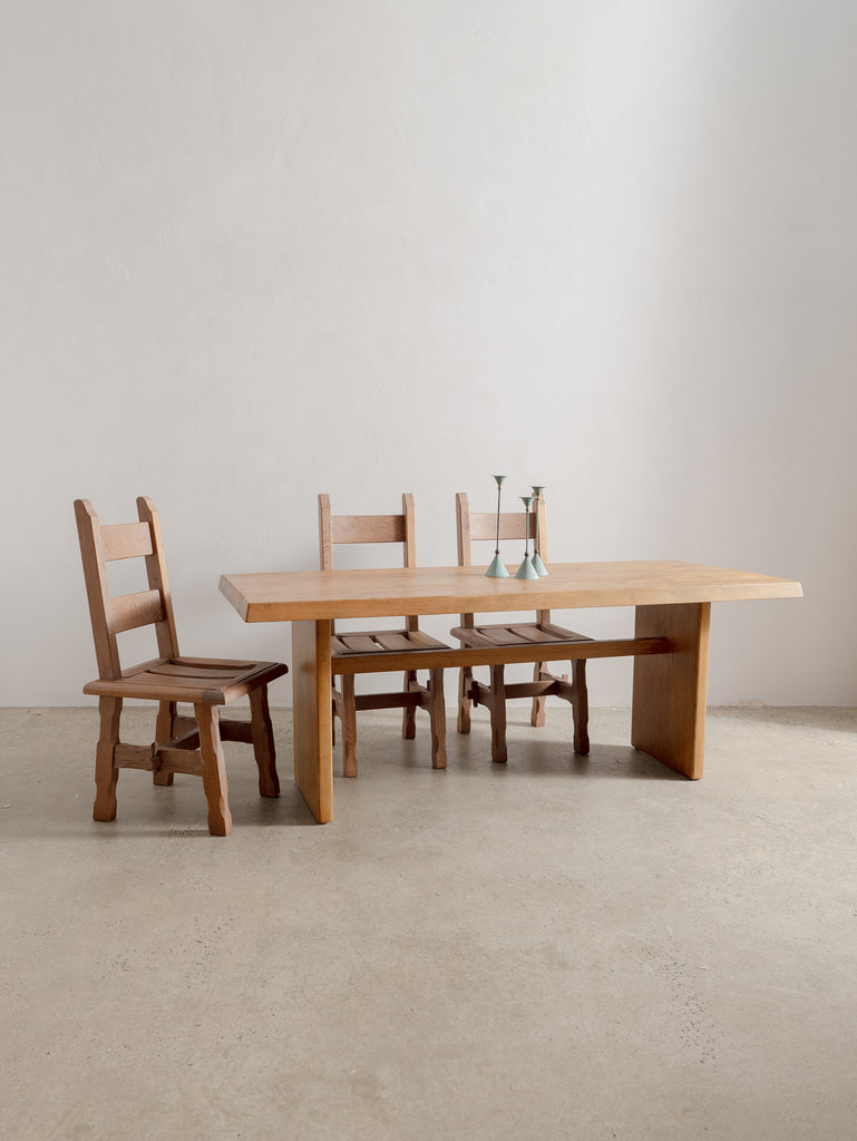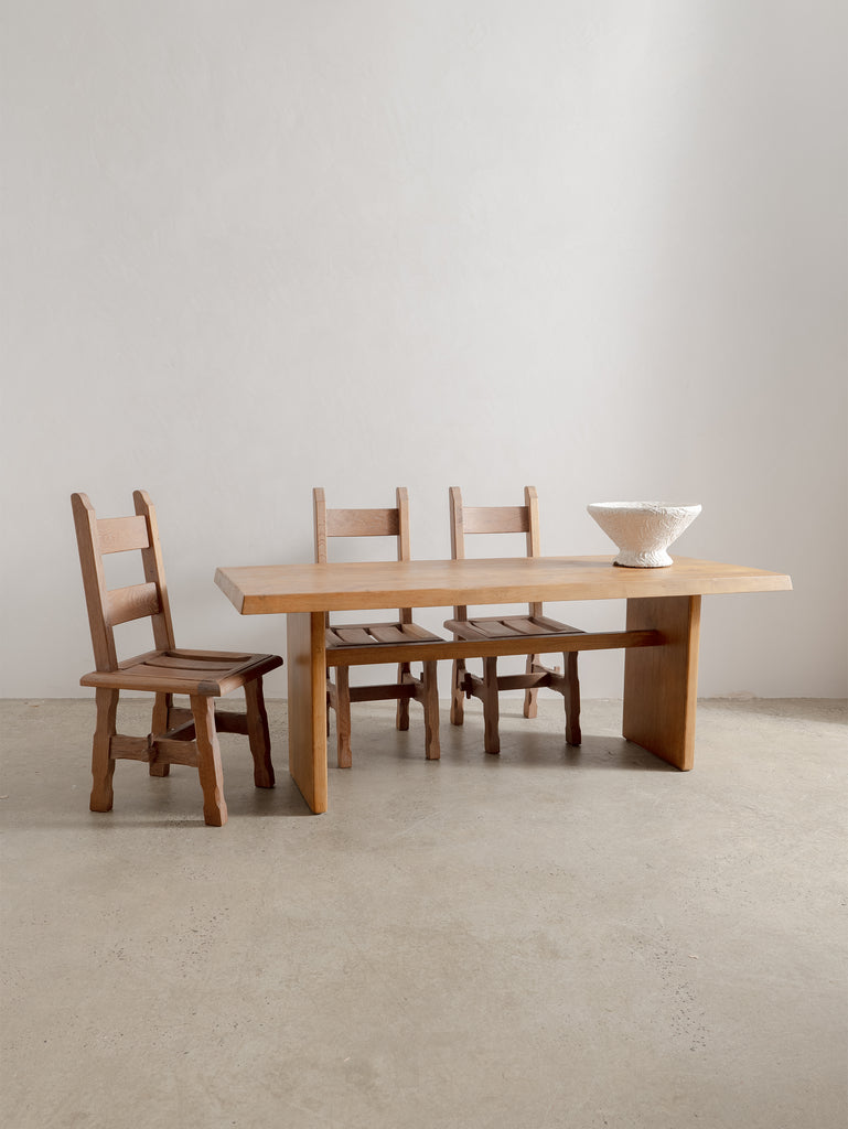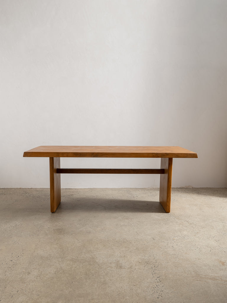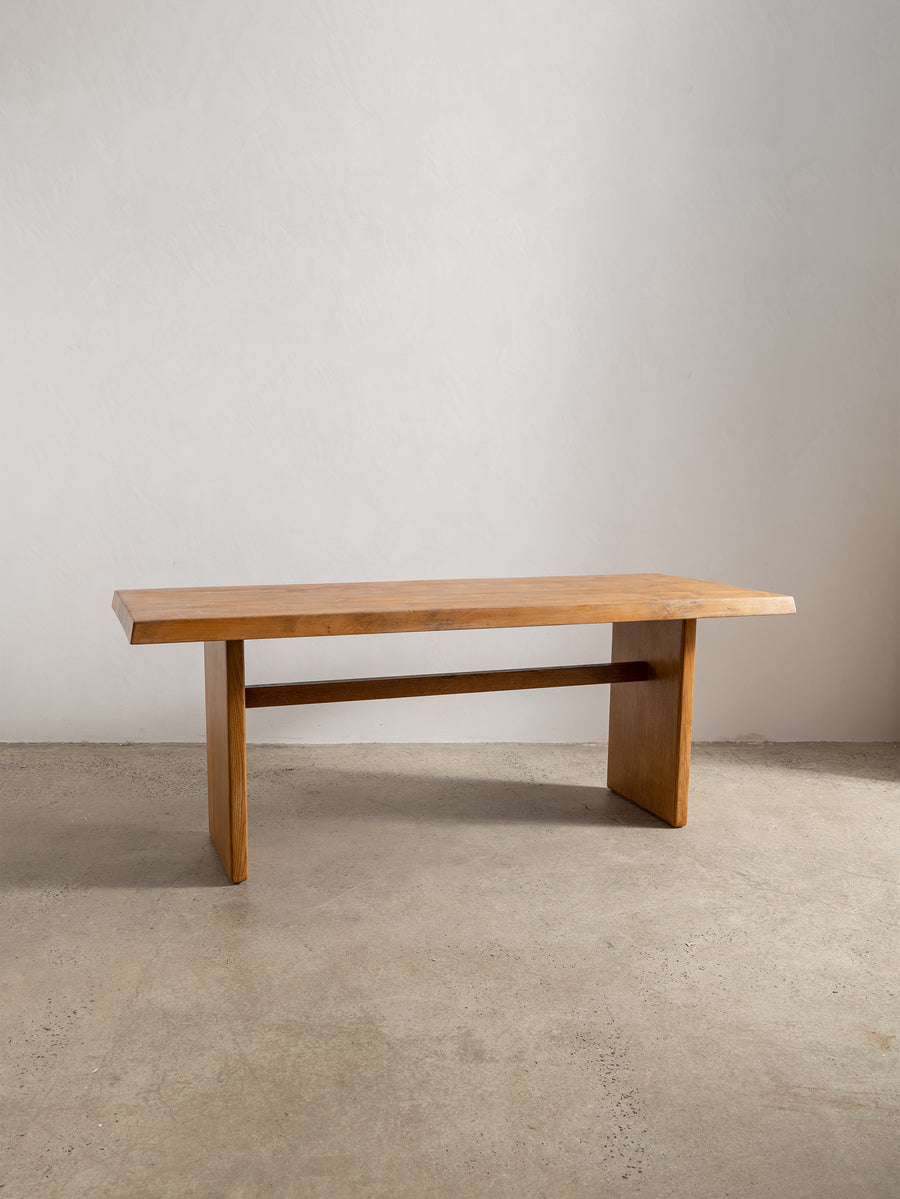 Rooted in the timeless craftsmanship of Pierre Chapo, this 1950s French oak dining table balances form and function with quiet confidence. Its solid rectangular top rests on two sculptural feet, joined by a thoughtfully spaced stretcher that adds both stability and lightness. The warmth of aged oak enhances its honest, architectural lines—an enduring piece that embodies the quiet strength of considered design.