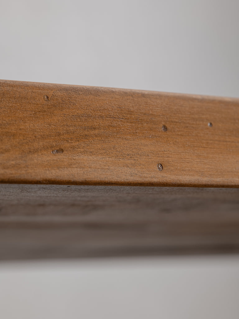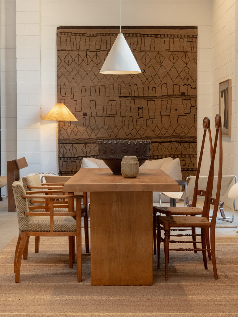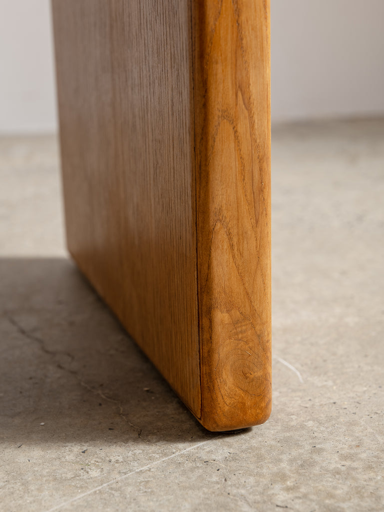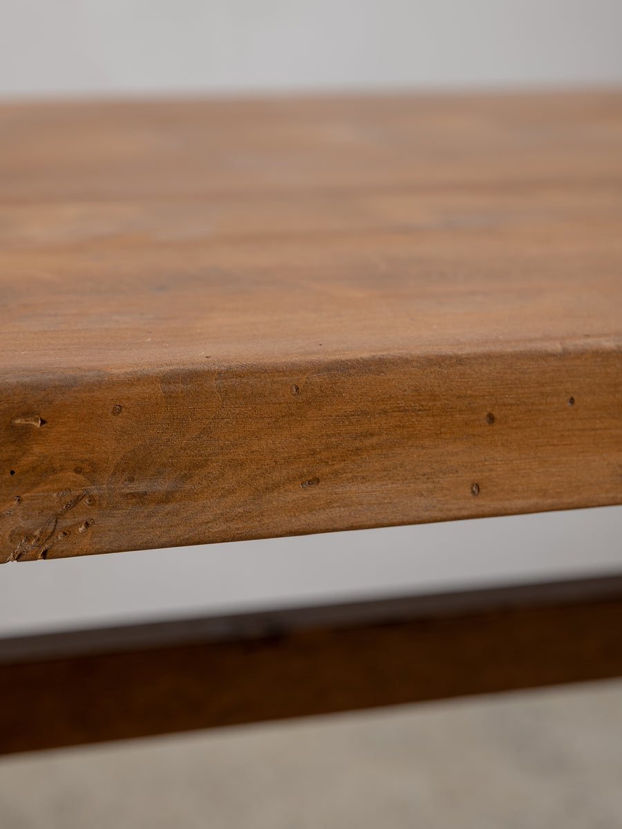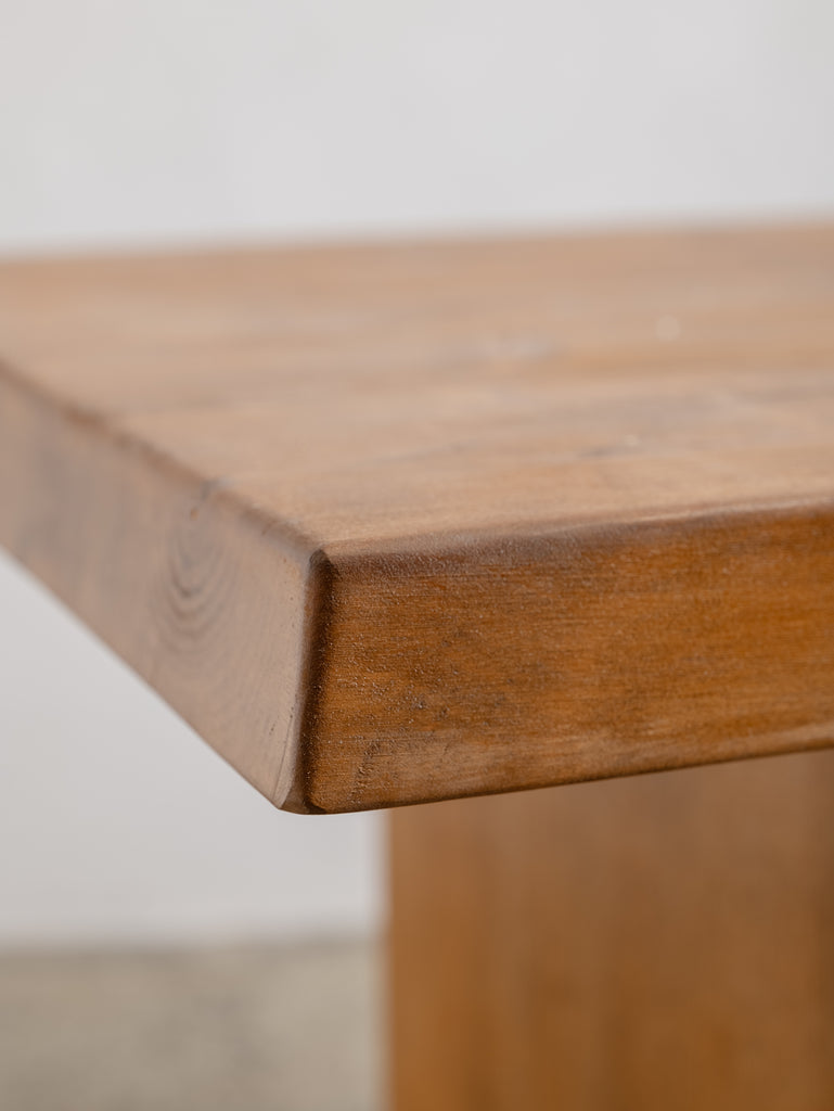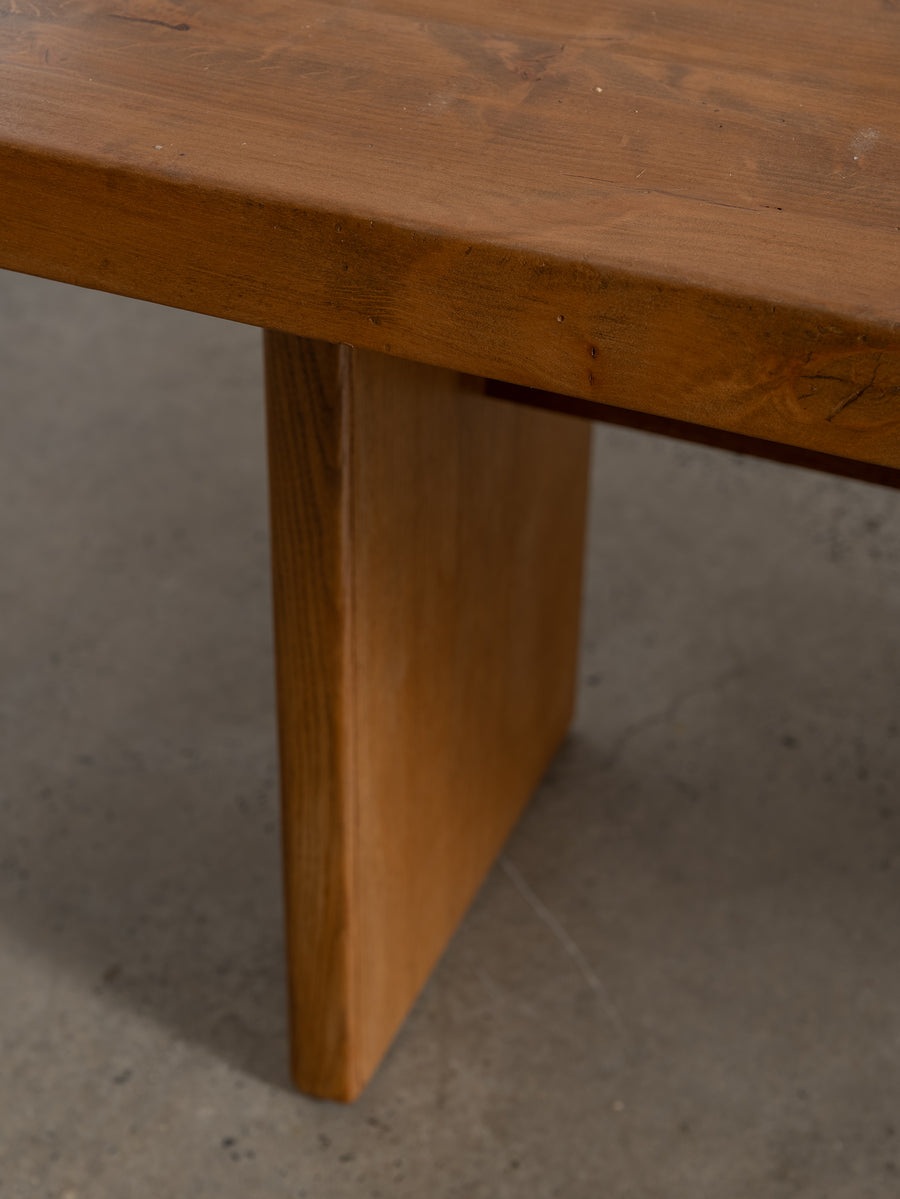 Rooted in the timeless craftsmanship of Pierre Chapo, this 1950s French oak dining table balances form and function with quiet confidence. Its solid rectangular top rests on two sculptural feet, joined by a thoughtfully spaced stretcher that adds both stability and lightness. The warmth of aged oak enhances its honest, architectural lines—an enduring piece that embodies the quiet strength of considered design.