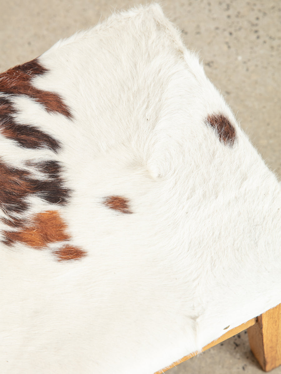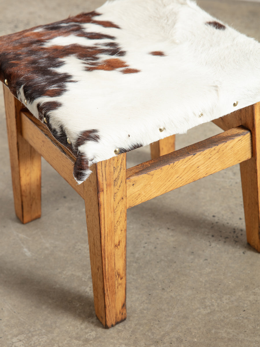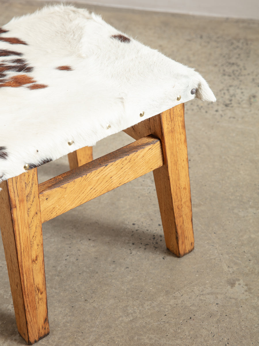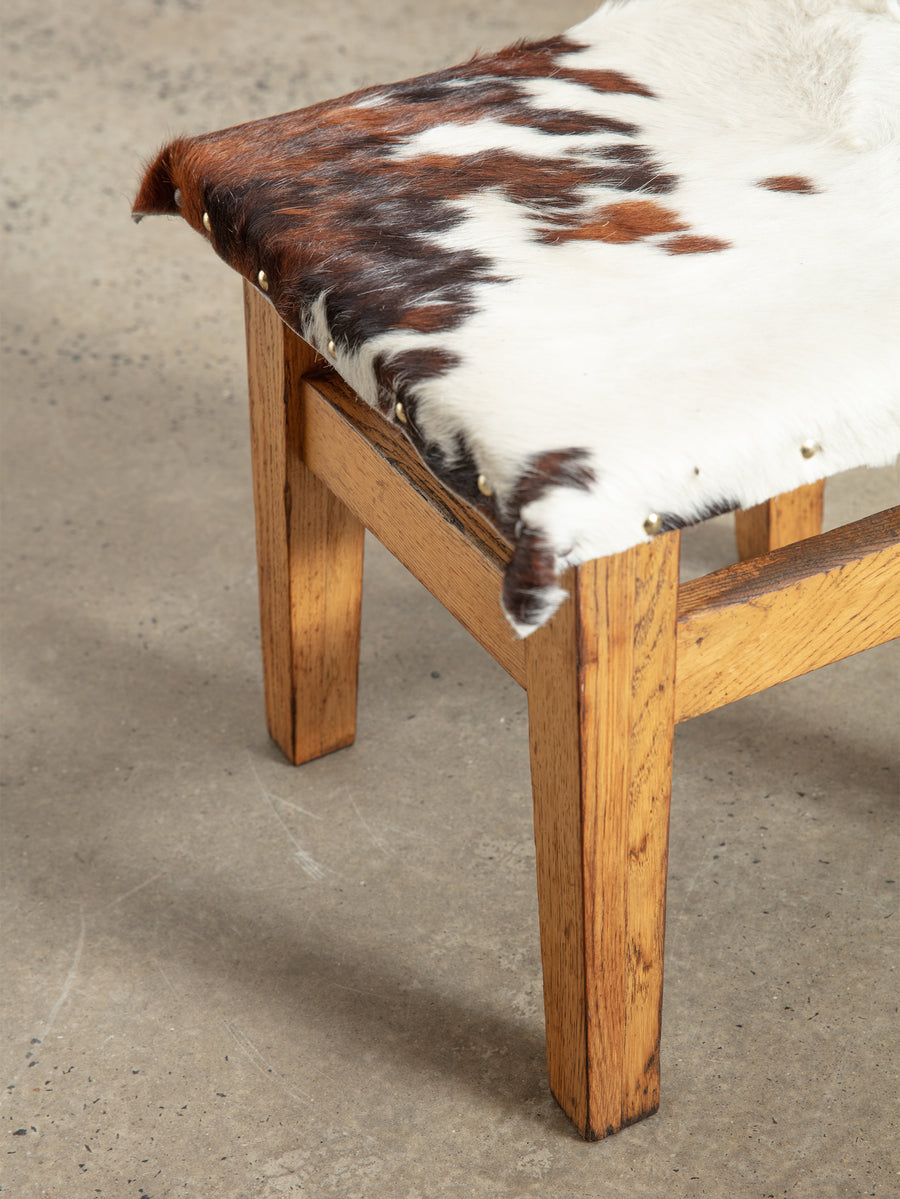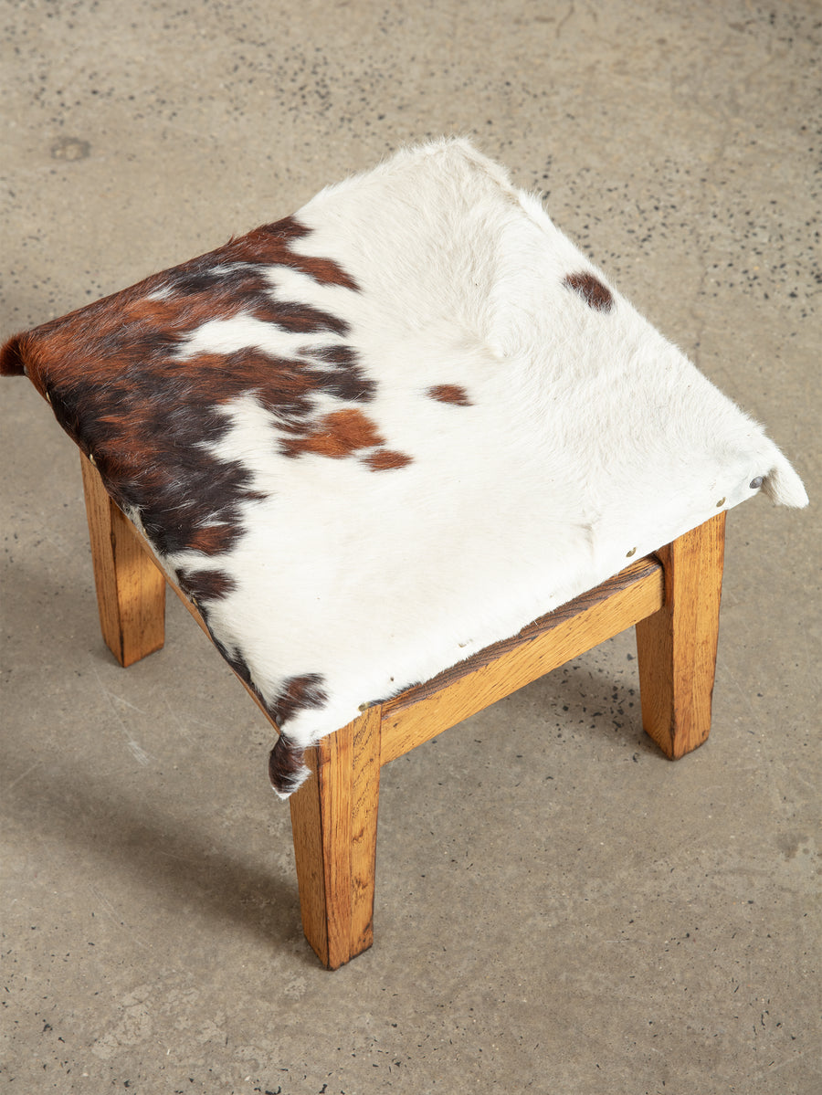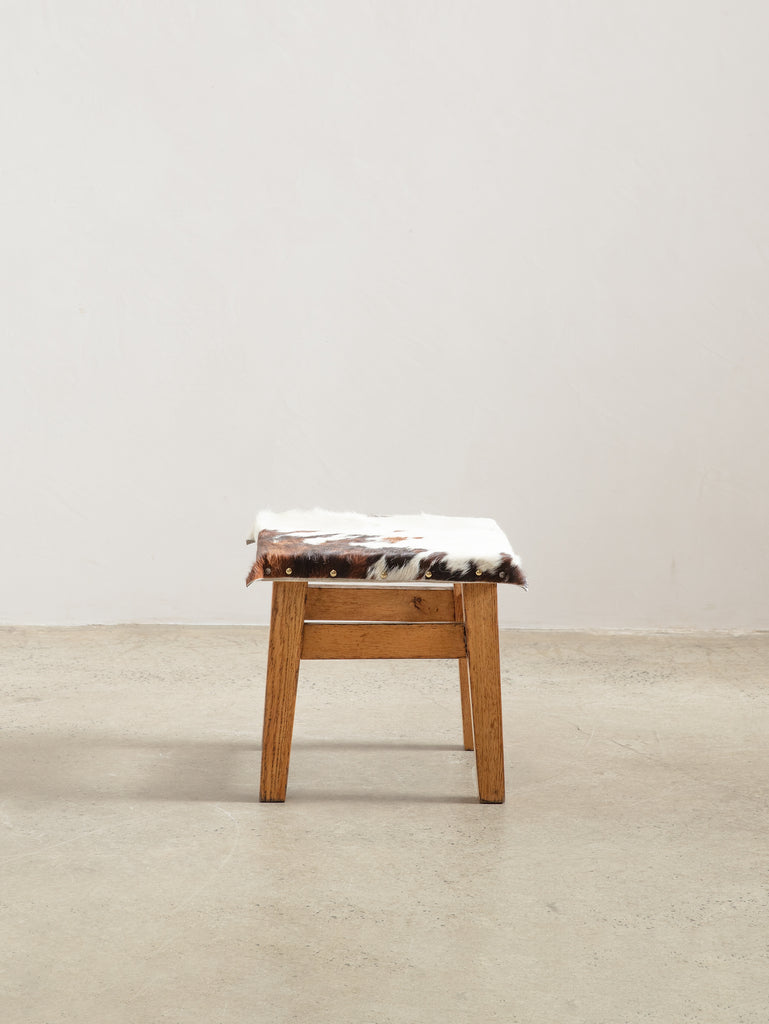 Anchored in simplicity, this 1950s timber stool is defined by its minimal form and natural cowhide seat. The smooth, timeworn timber reveals a rich patina, while the hide adds subtle texture and depth. Together they speak to the quiet refinement of mid-century craft - functional, tactile, and enduring.