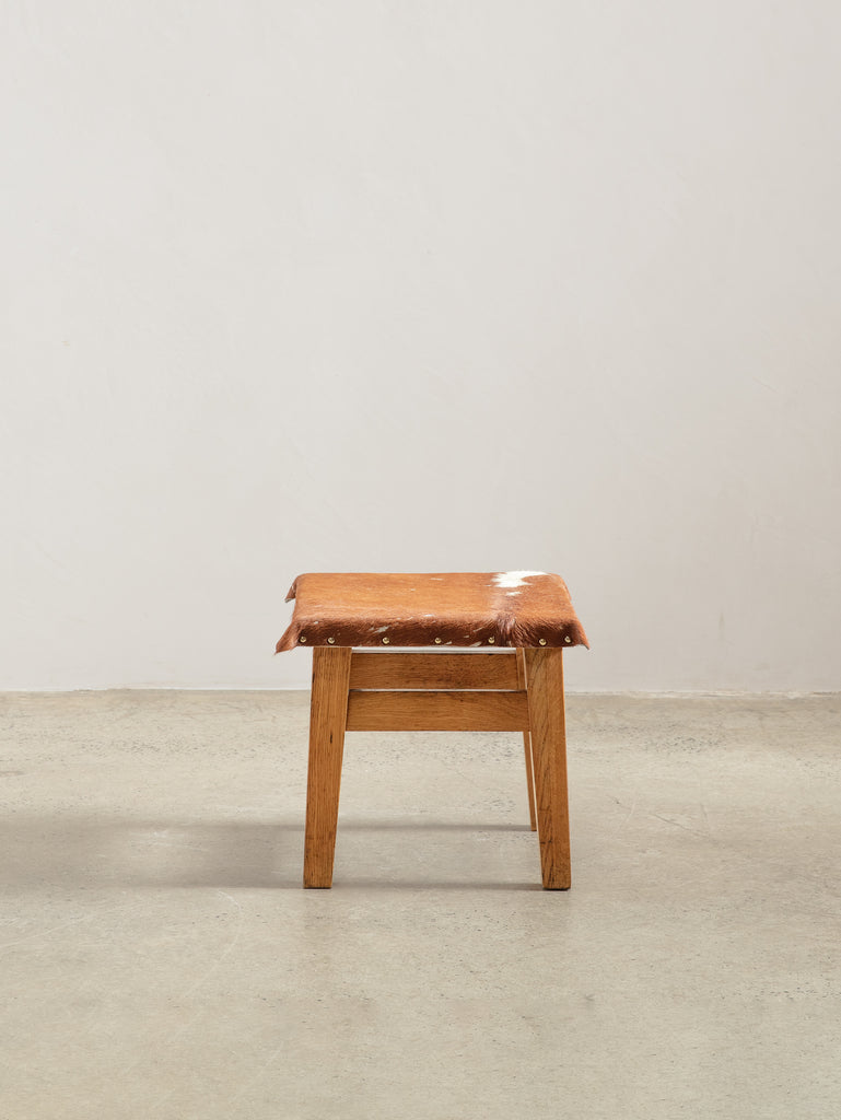 Anchored in simplicity, this 1950s timber stool is defined by its minimal form and natural cowhide seat. The smooth, timeworn timber reveals a rich patina, while the hide adds subtle texture and depth. Together they speak to the quiet refinement of mid-century craft - functional, tactile, and enduring.