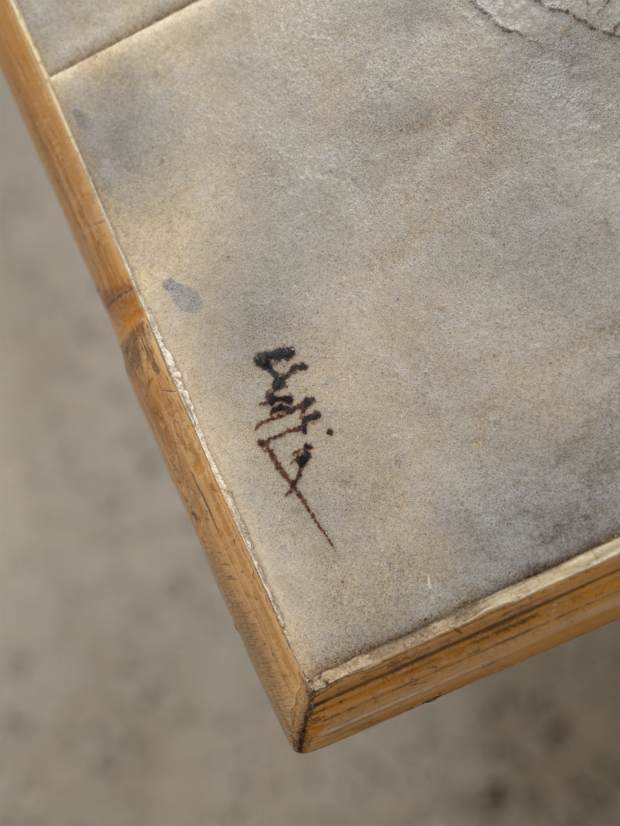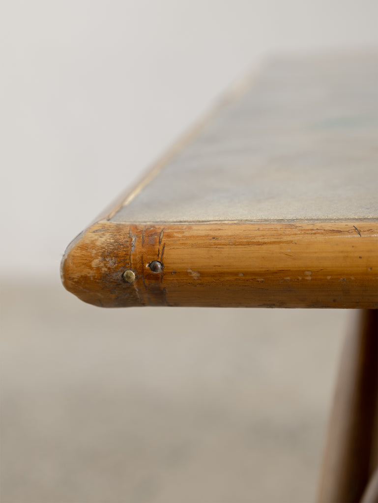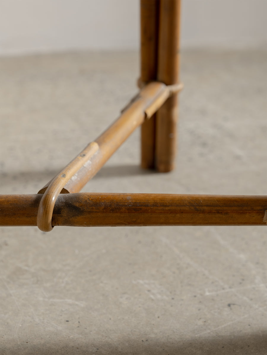 Signed piece by Audoux-Minet and Georges Chassin. This rattan coffee table is defined by its light bamboo frame and ceramic tiled top, a composition that reflects the designers’ affinity for natural materials and artisanal craft. The handwoven cane structure lends warmth and texture, while the decorative tile surface introduces a refined graphic quality. Both practical and sculptural, this work embodies the enduring spirit of French mid-century design.