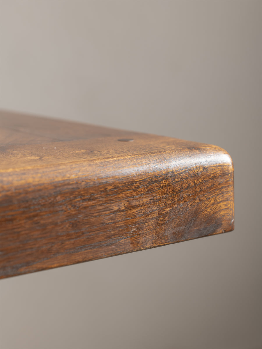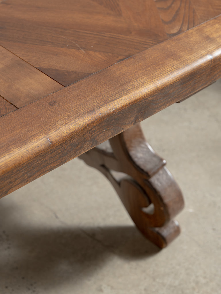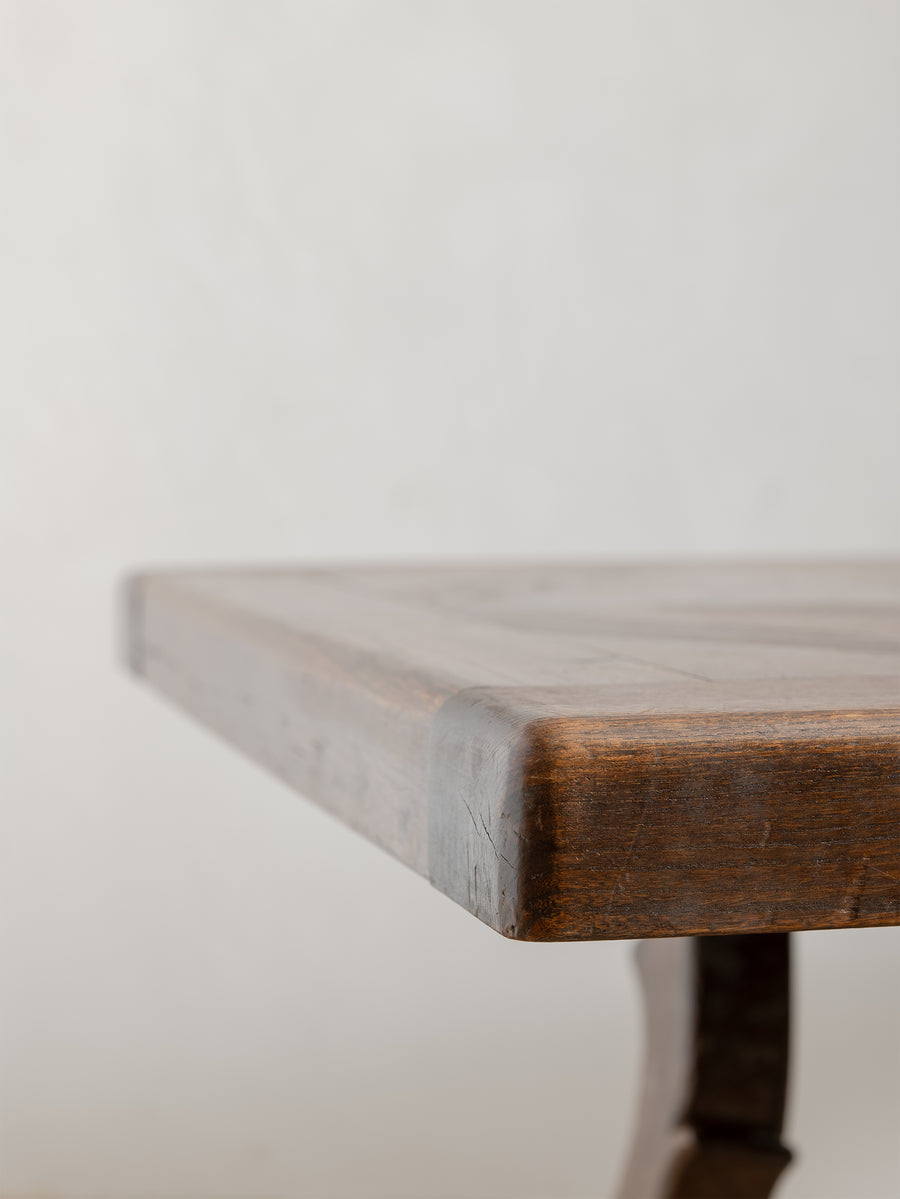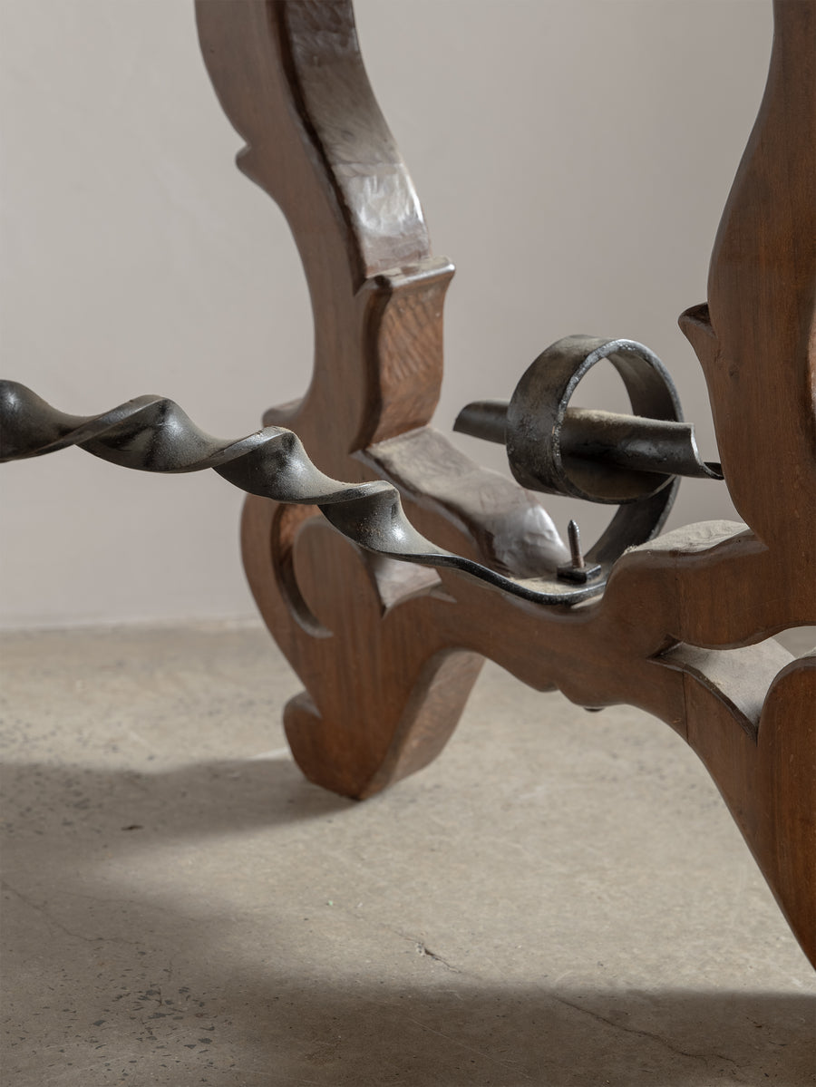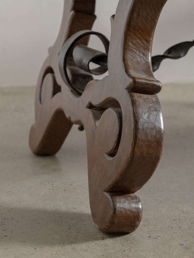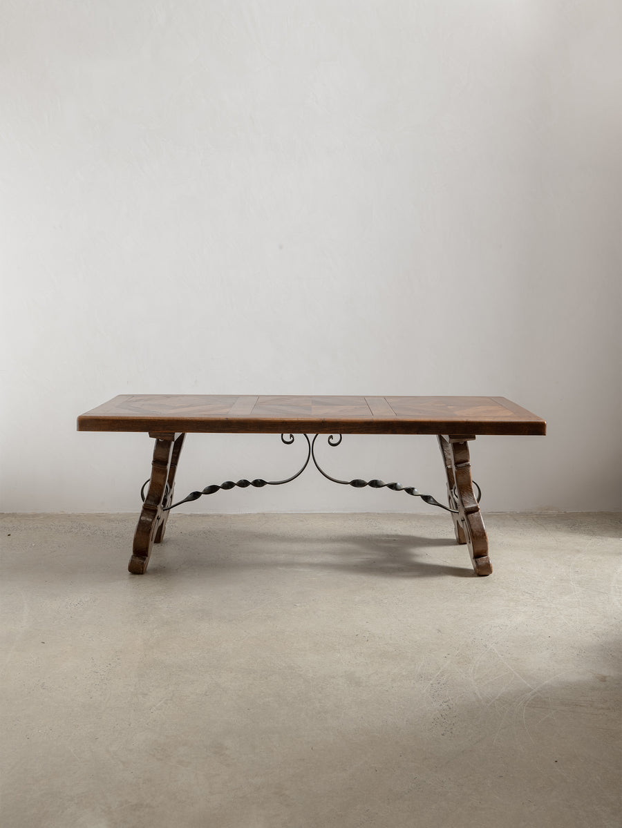 An elegant 19th century French walnut refectory table, showcasing refined craftsmanship and timeless design. The solid walnut top rests upon finely carved supports, their sculptural presence balanced by a hand-forged Spanish-style wrought iron stretcher. With its warm patina and graceful proportions, this piece carries the weight of history while remaining effortlessly functional, making it a distinguished addition to any dining space or interior setting.