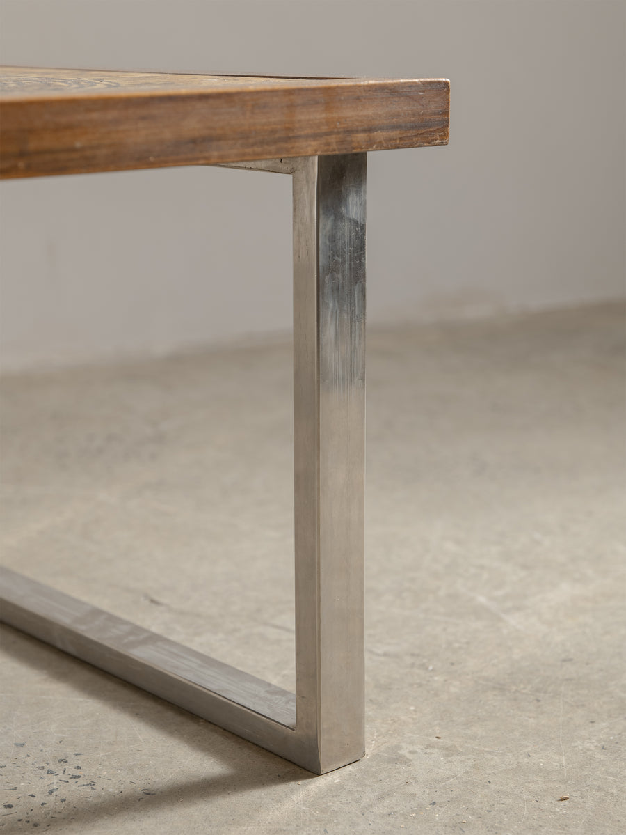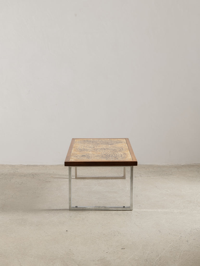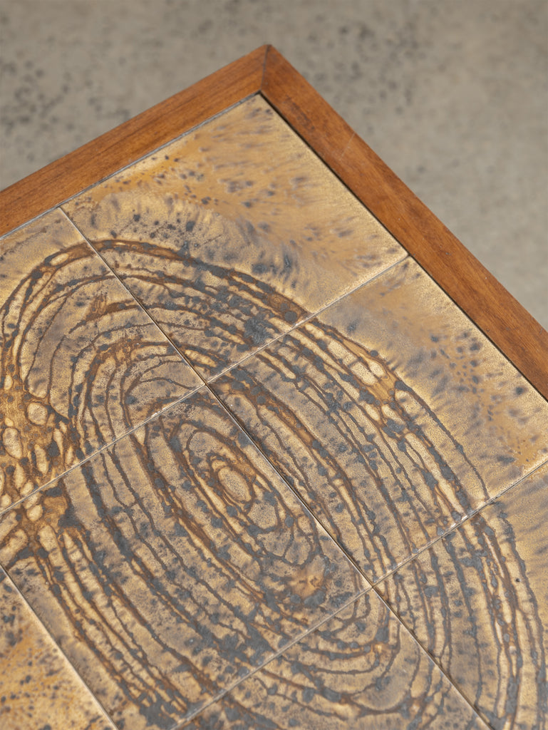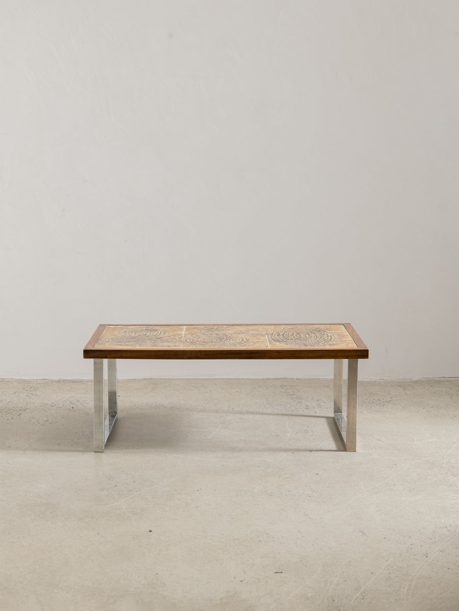 Wooden and ceramic coffee table by Jean D’Asti, created in Vallauris, France during the 1970s. The tiled surface features an abstract, hand-enameled design in earthy tones of beige, brown, and black — characteristic of D’Asti’s rustic yet sophisticated style. Resting on a solid wood frame with polished metal legs, the piece captures the spirit of the French Riviera’s ceramic movement, where art and function meet in perfect balance.