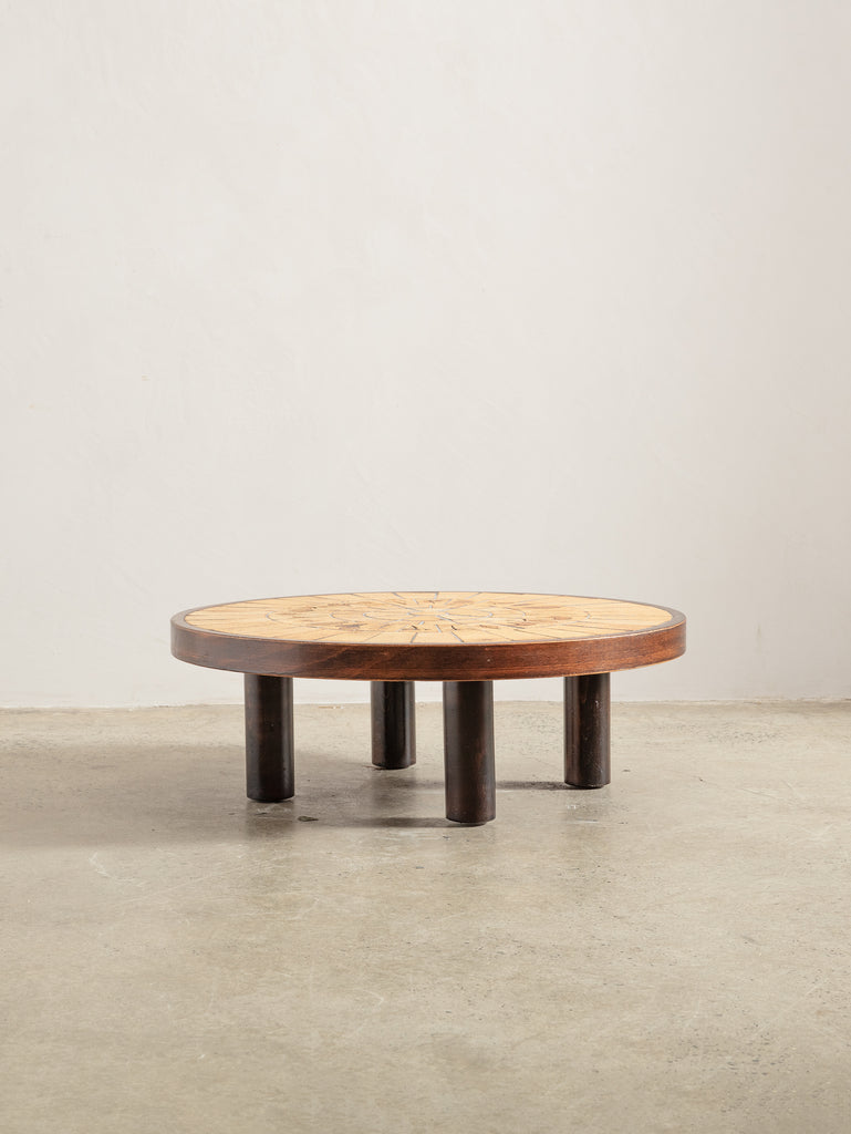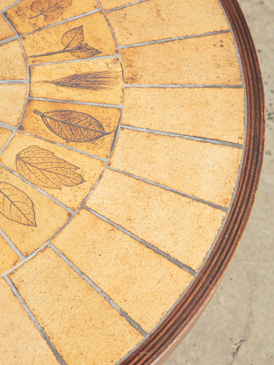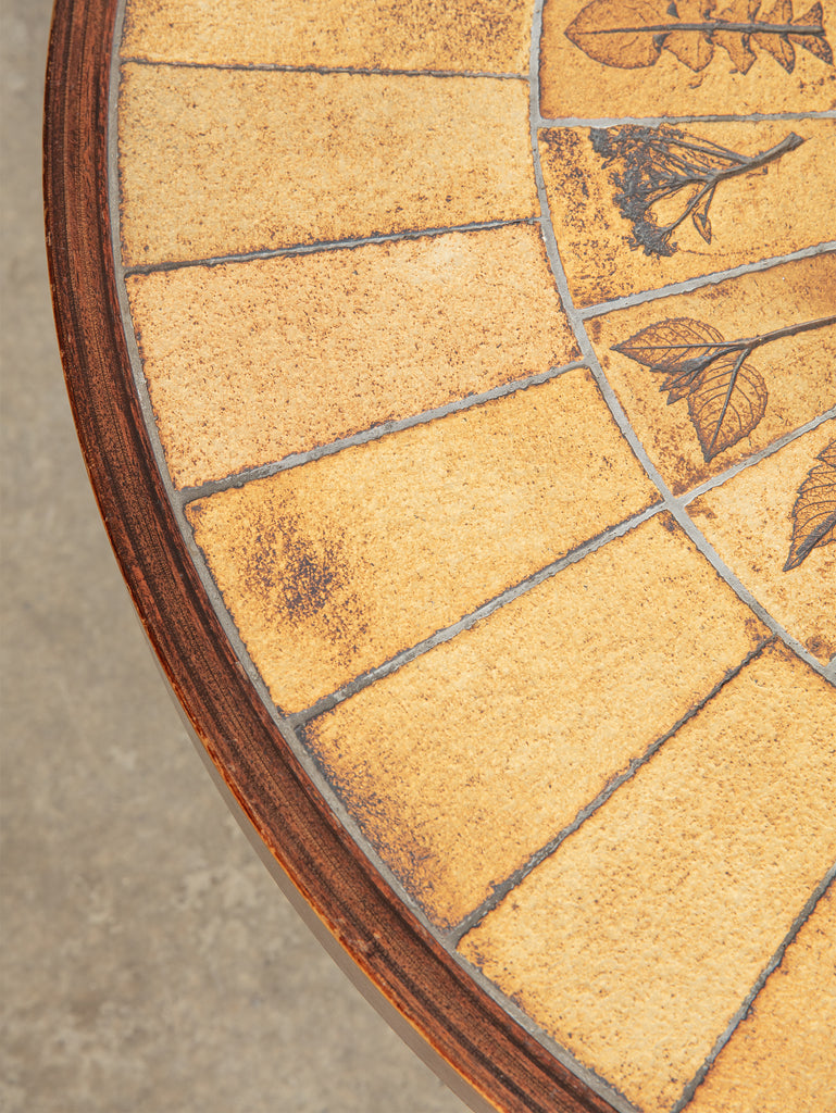 A low ceramic coffee table by French designer Roger Capron, circa 1960s. Handcrafted with studio craft precision, the circular tiled top is decorated with impressed herbs and botanical motifs, capturing Capron’s signature dialogue between nature and form.