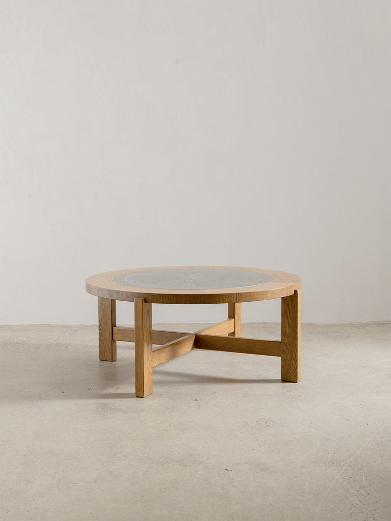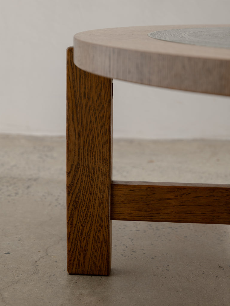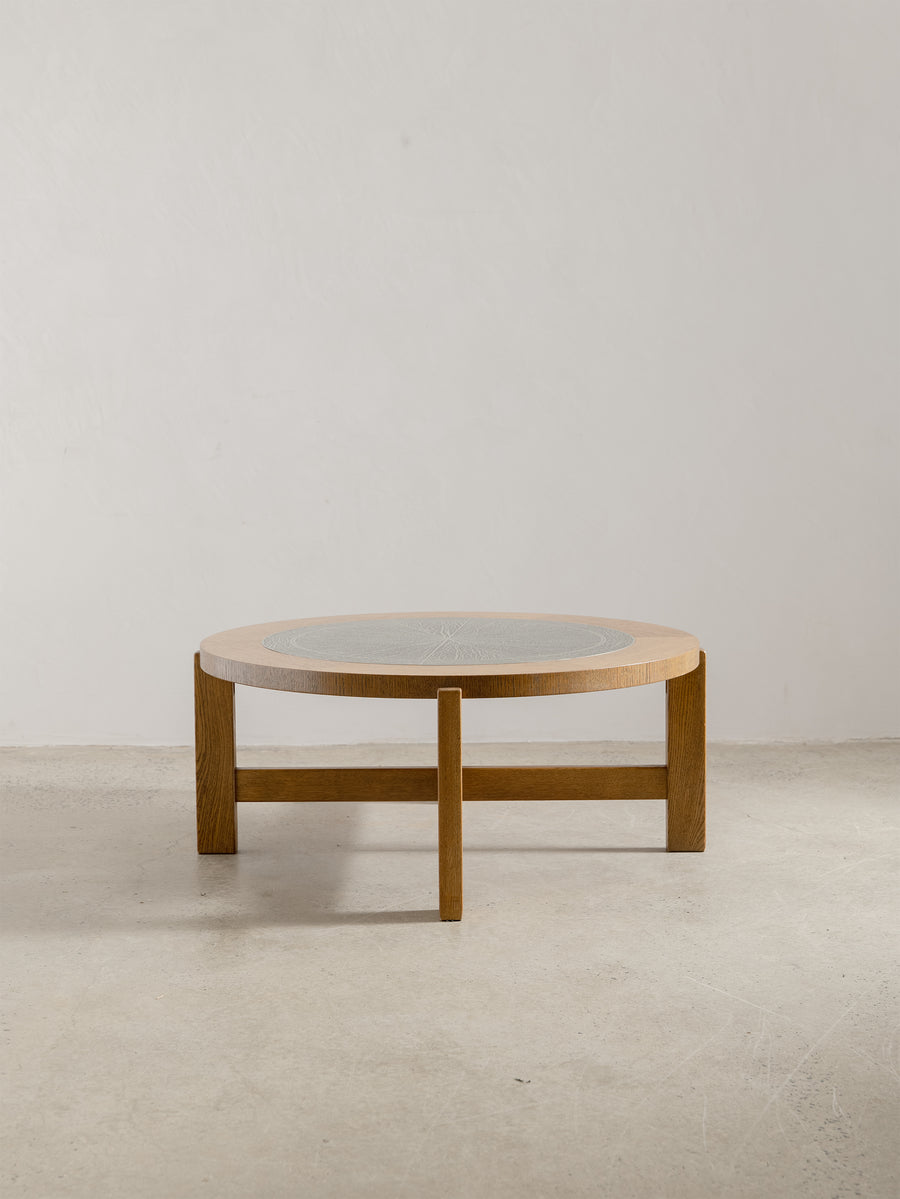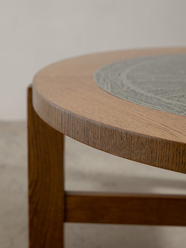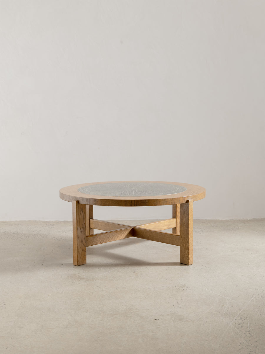 A striking round coffee table combining the warmth of timber with the bold artistry of a pressed metal inlay. The circular top rests on a geometric cross-base, its clean lines and restrained form characteristic of Scandinavian design. The centre inlay radiates outward in a dynamic, textural pattern, lending both contrast and intrigue to the piece. A beautiful example of functional design elevated by artistic detail, this table embodies the enduring appeal of Danish mid-century craftsmanship.