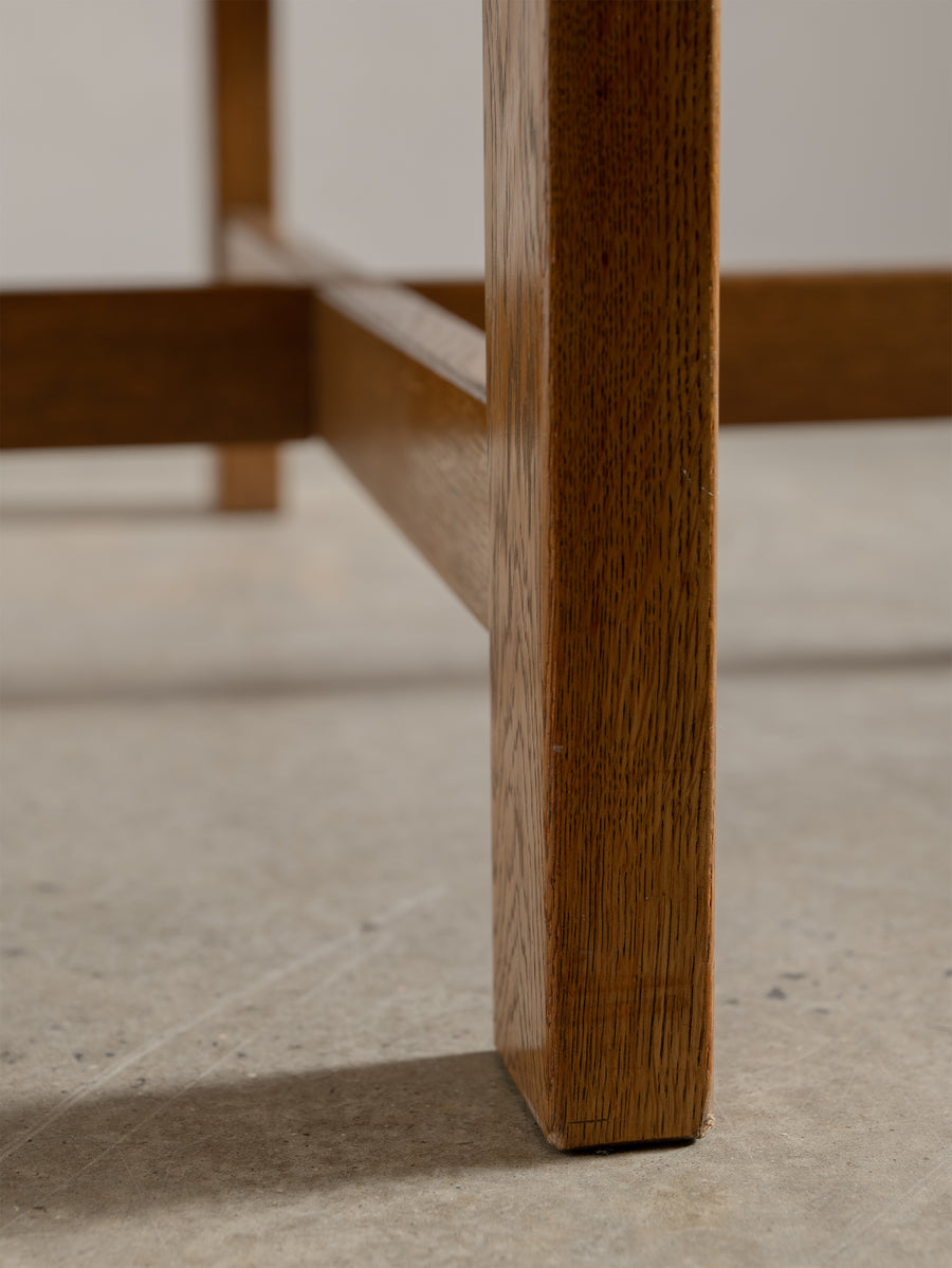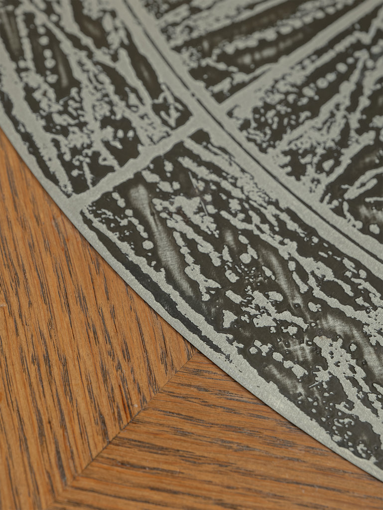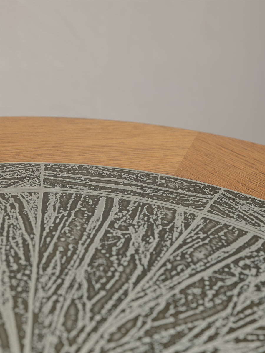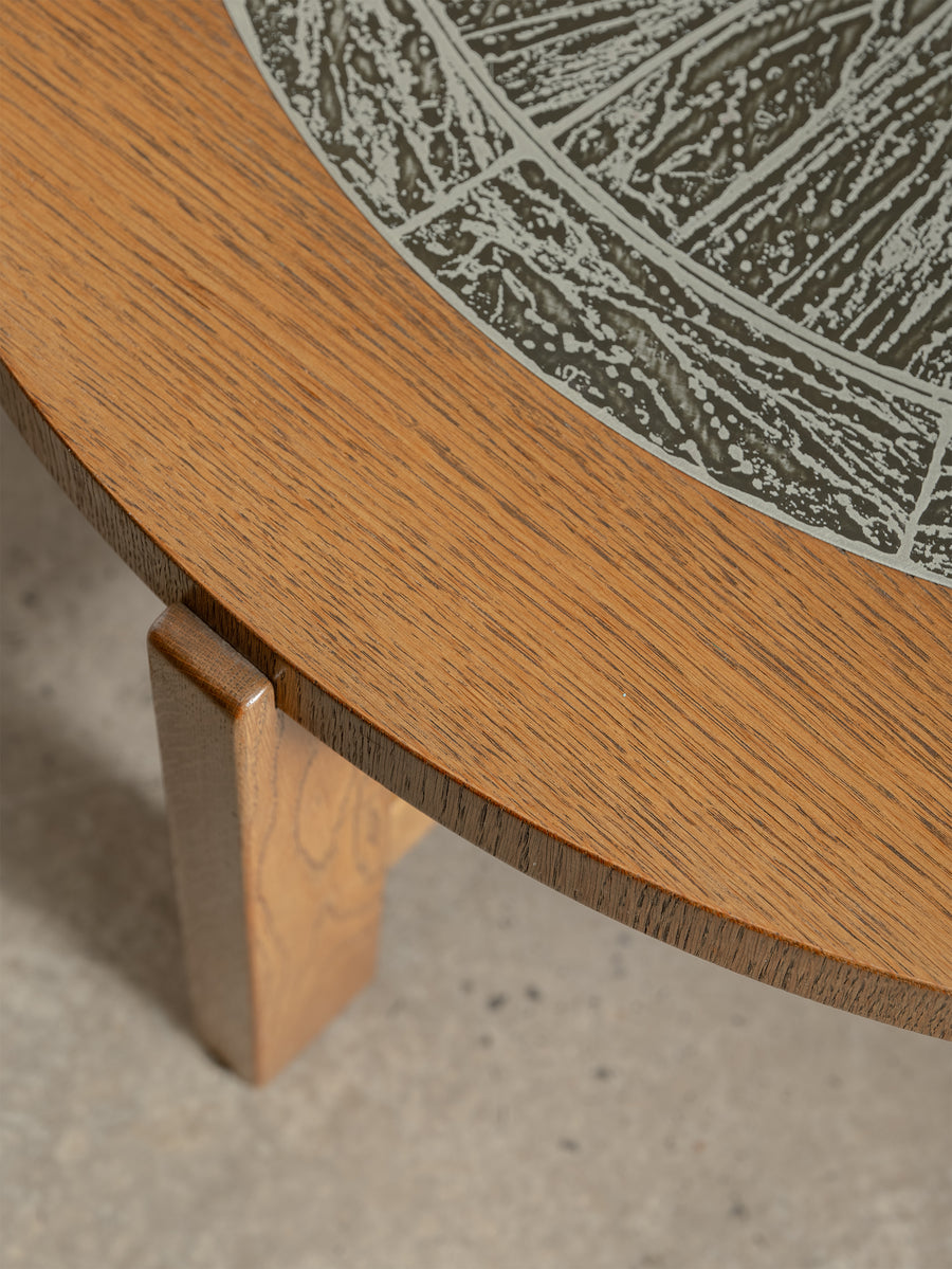A striking round coffee table combining the warmth of timber with the bold artistry of a pressed metal inlay. The circular top rests on a geometric cross-base, its clean lines and restrained form characteristic of Scandinavian design. The centre inlay radiates outward in a dynamic, textural pattern, lending both contrast and intrigue to the piece. A beautiful example of functional design elevated by artistic detail, this table embodies the enduring appeal of Danish mid-century craftsmanship.