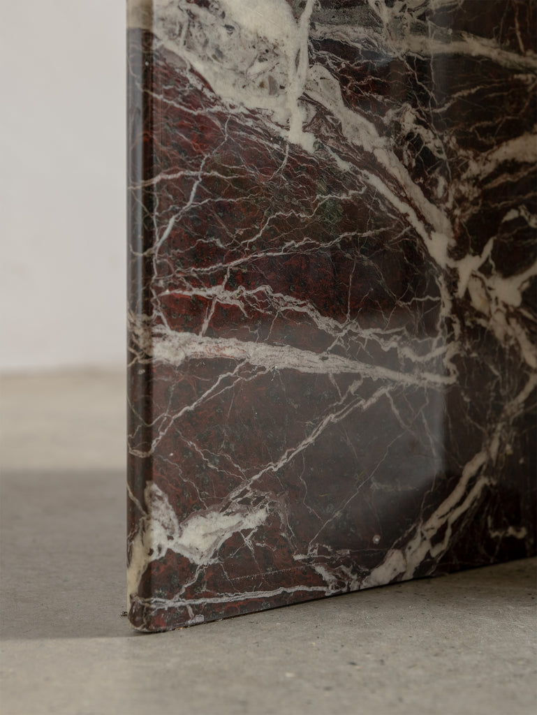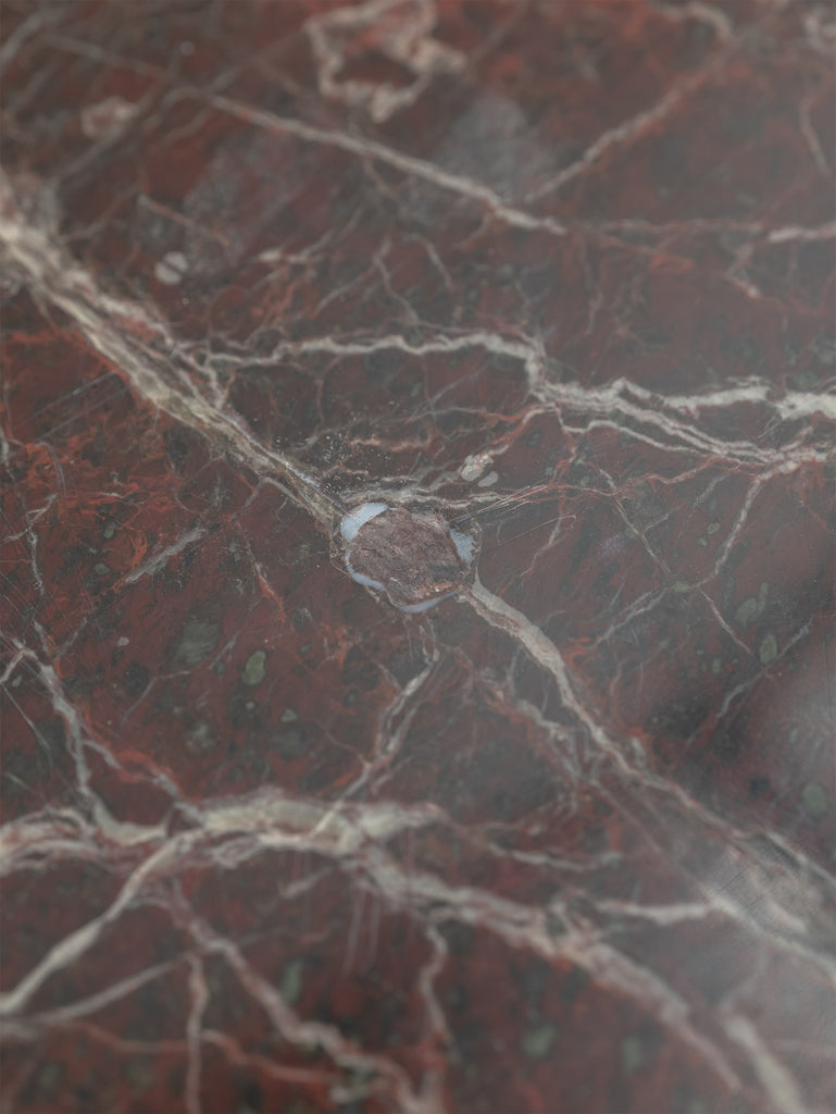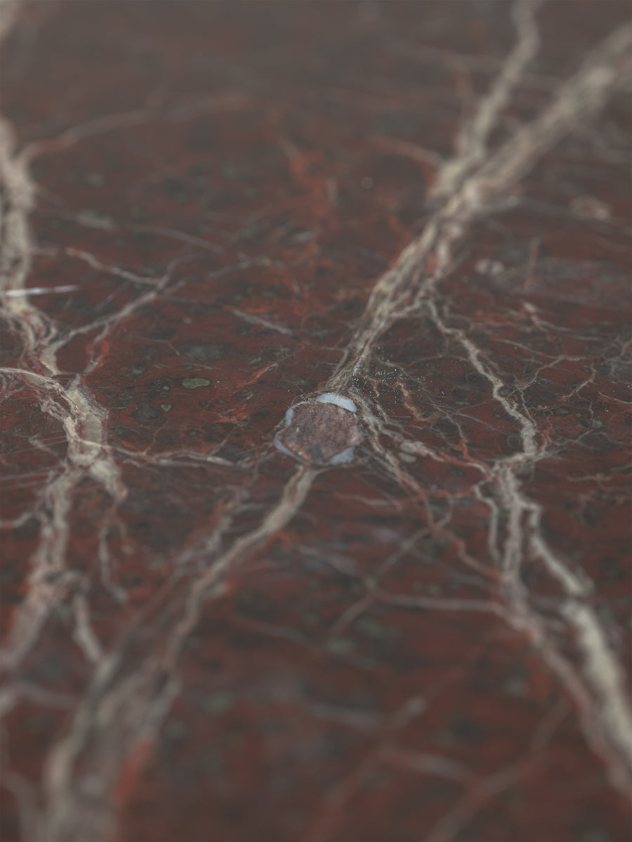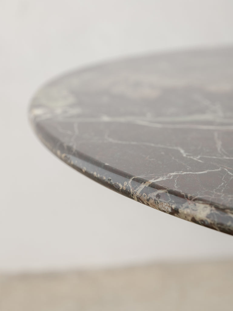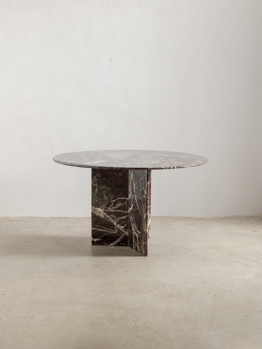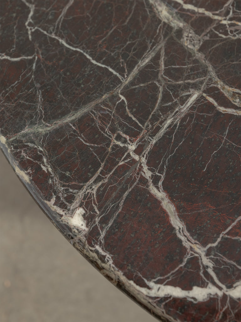 Defined by its rich Rosso Levanto marble, this round dining table showcases deep burgundy hues animated by veins of green, cherry-red, and fine white spidering. The polished surface offers clarity and depth into the stone’s grain, highlighting the drama of its natural composition. Sculptural yet refined, the piece captures the enduring elegance of Italian marble craftsmanship.