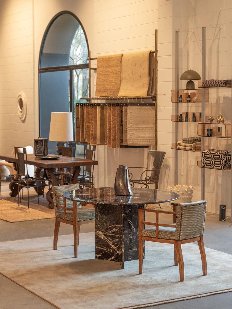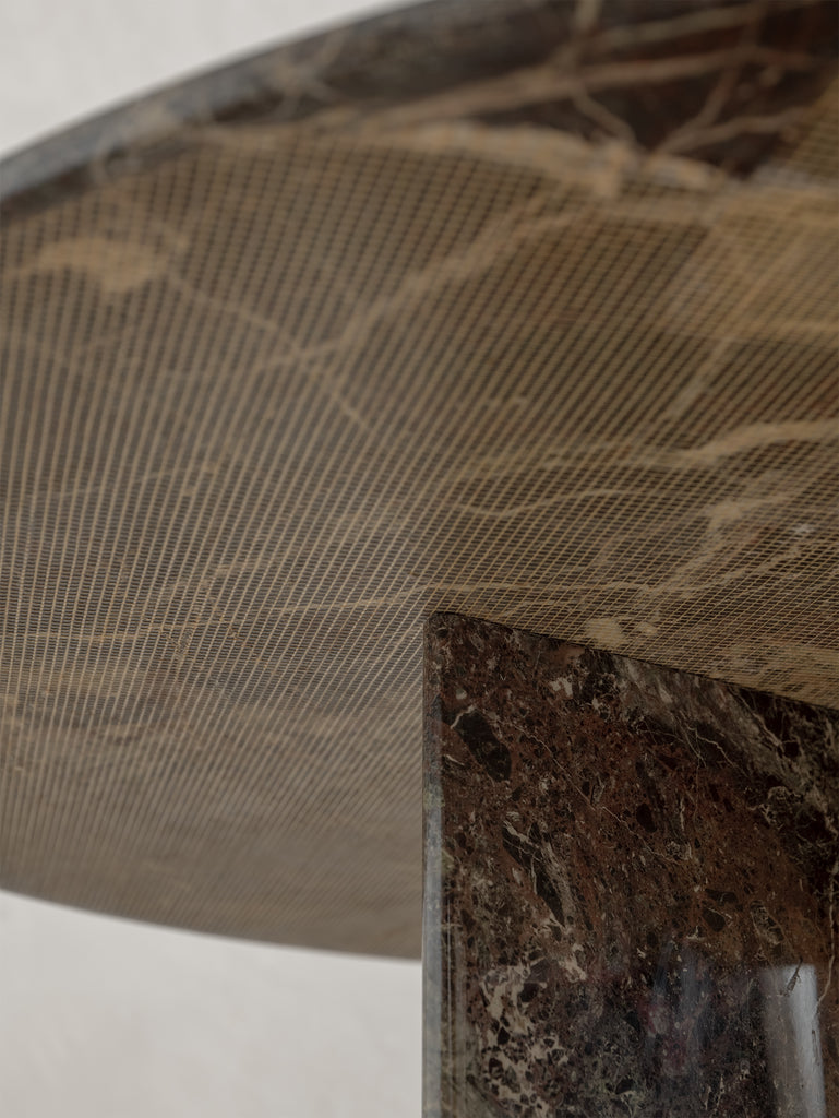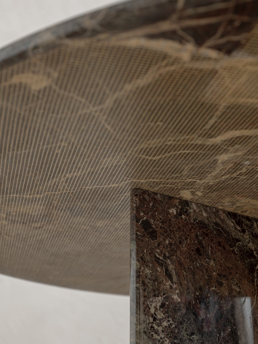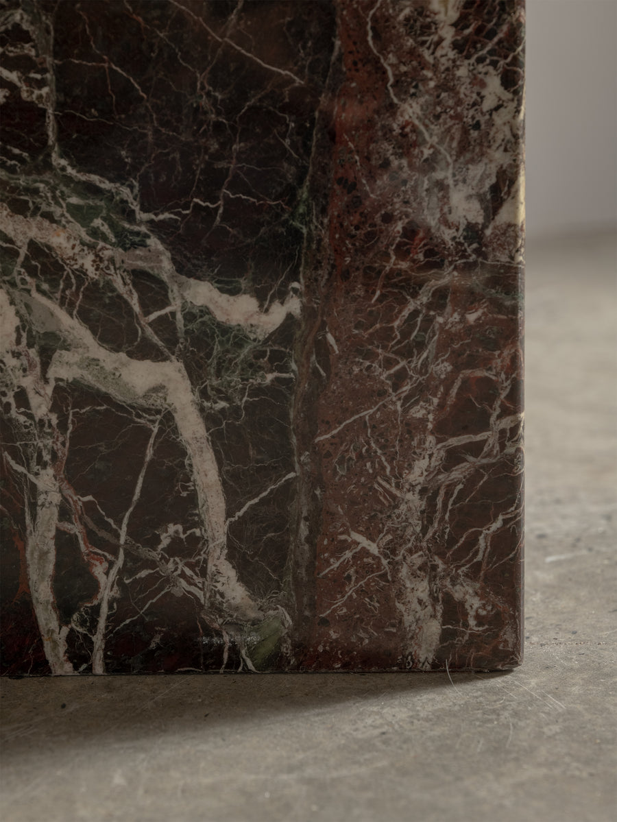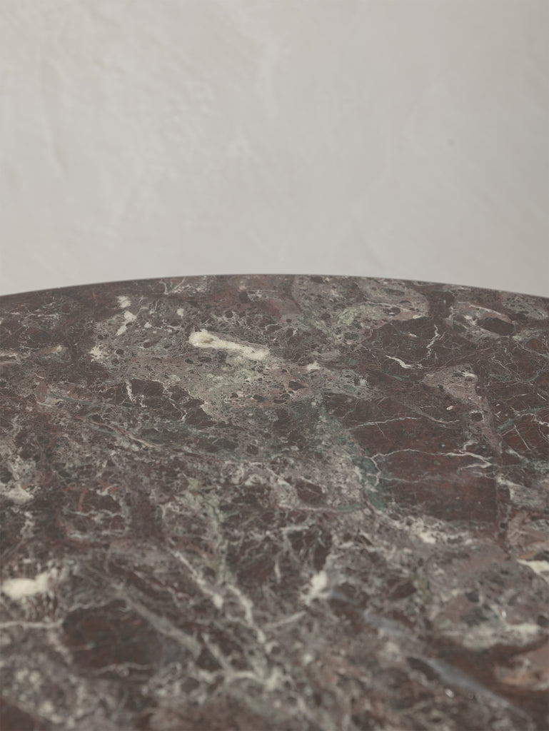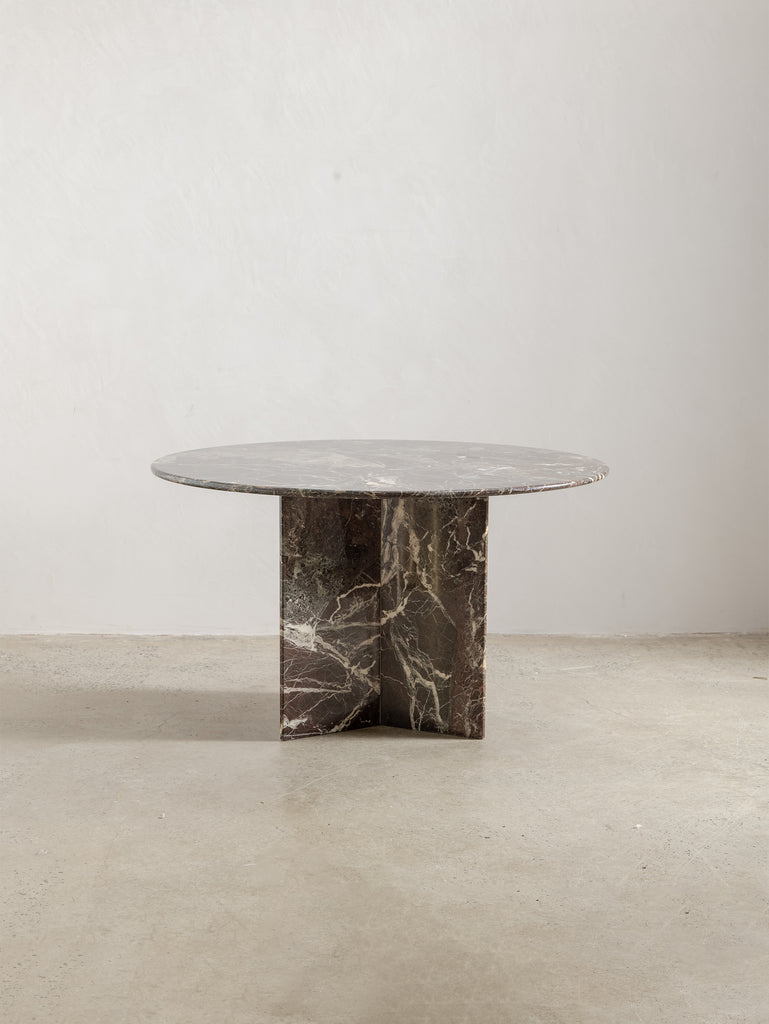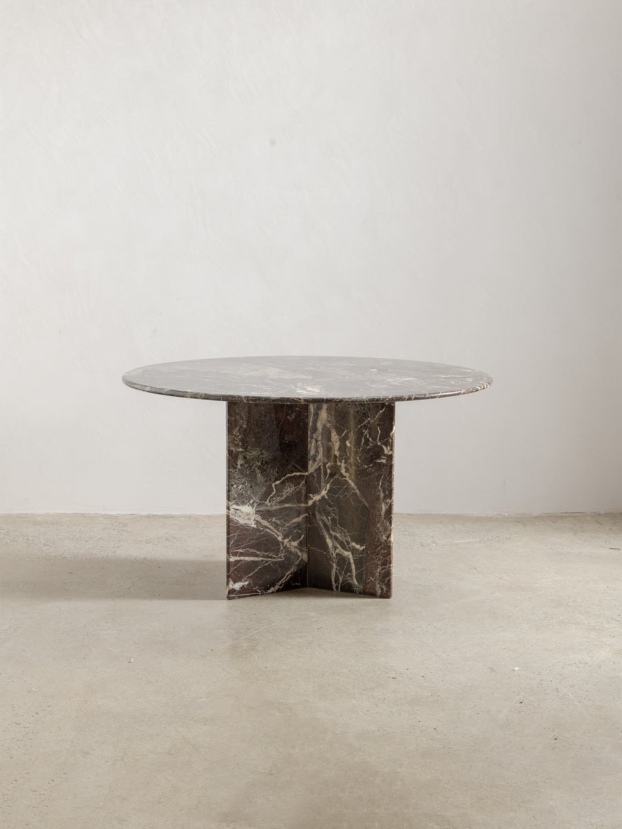 Defined by its rich Rosso Levanto marble, this round dining table showcases deep burgundy hues animated by veins of green, cherry-red, and fine white spidering. The polished surface offers clarity and depth into the stone’s grain, highlighting the drama of its natural composition. Sculptural yet refined, the piece captures the enduring elegance of Italian marble craftsmanship.