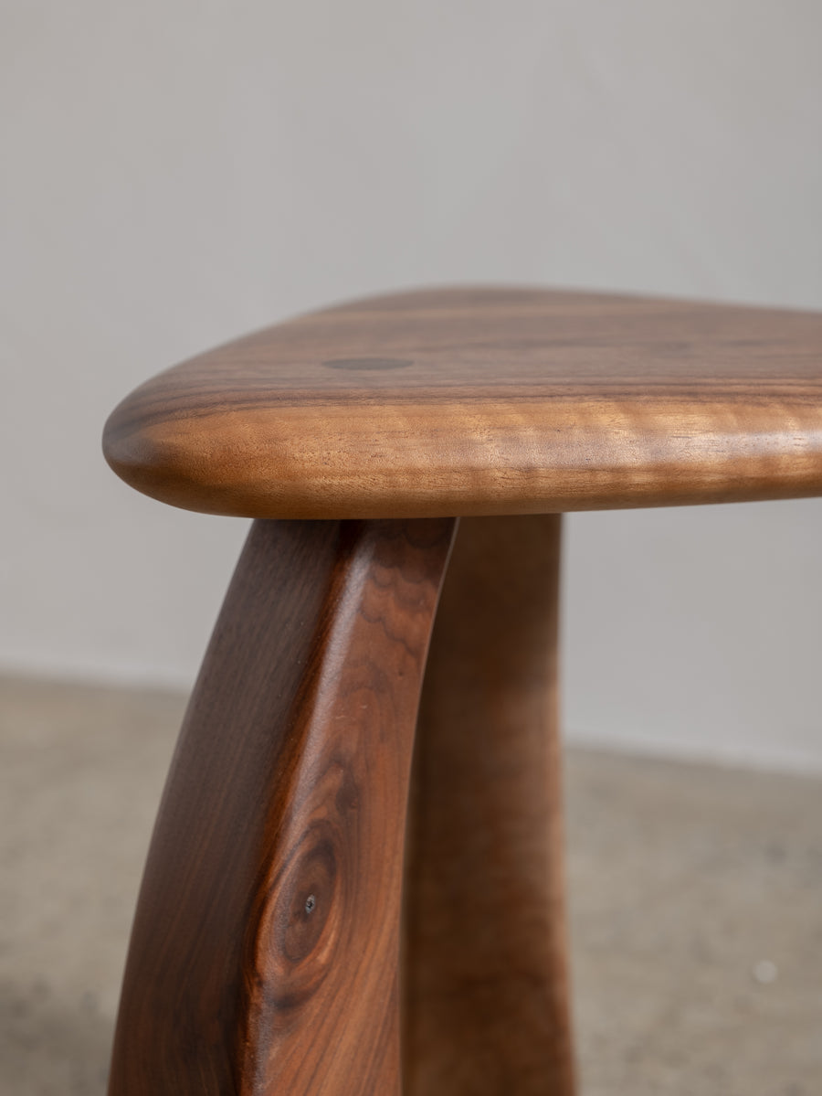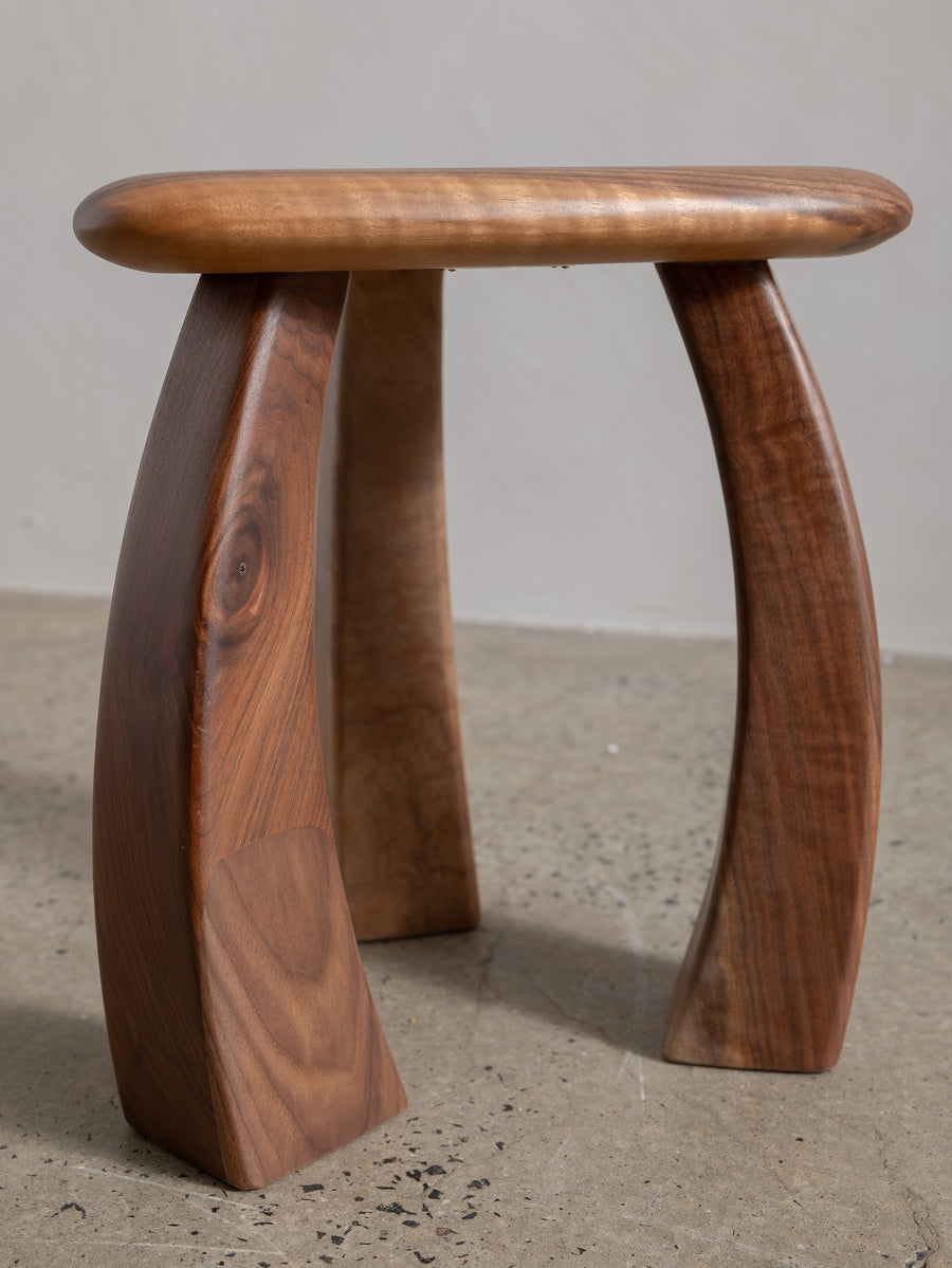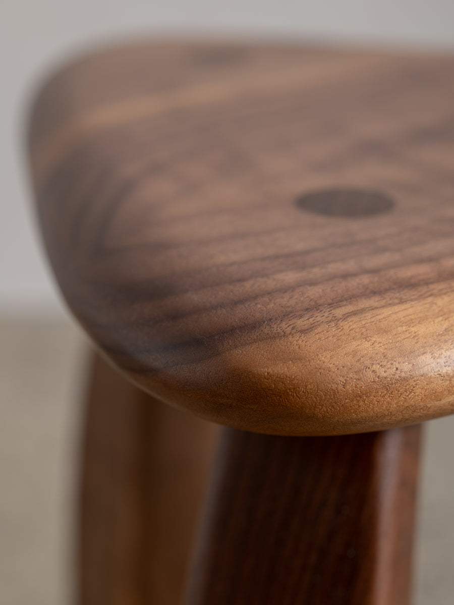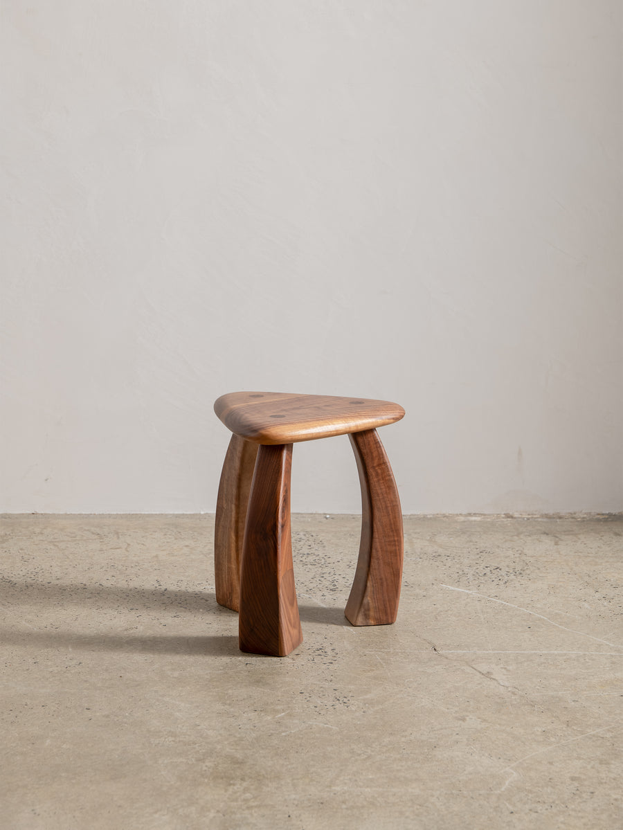 A quiet expression of craftsmanship, this sculptural walnut stool is shaped by skilled artisans in Northern Portugal. Its solid form is softened by inward-arching legs, meeting at a triangular top that highlights the natural beauty of the wood. The deep grain and hand-carved details lend warmth and depth, making each piece truly unique.