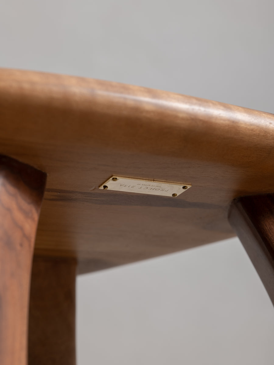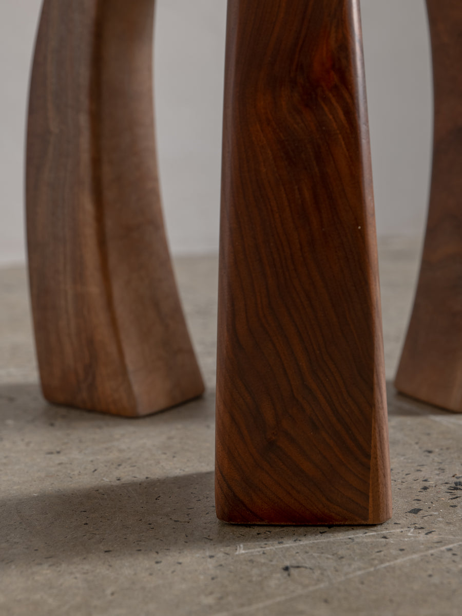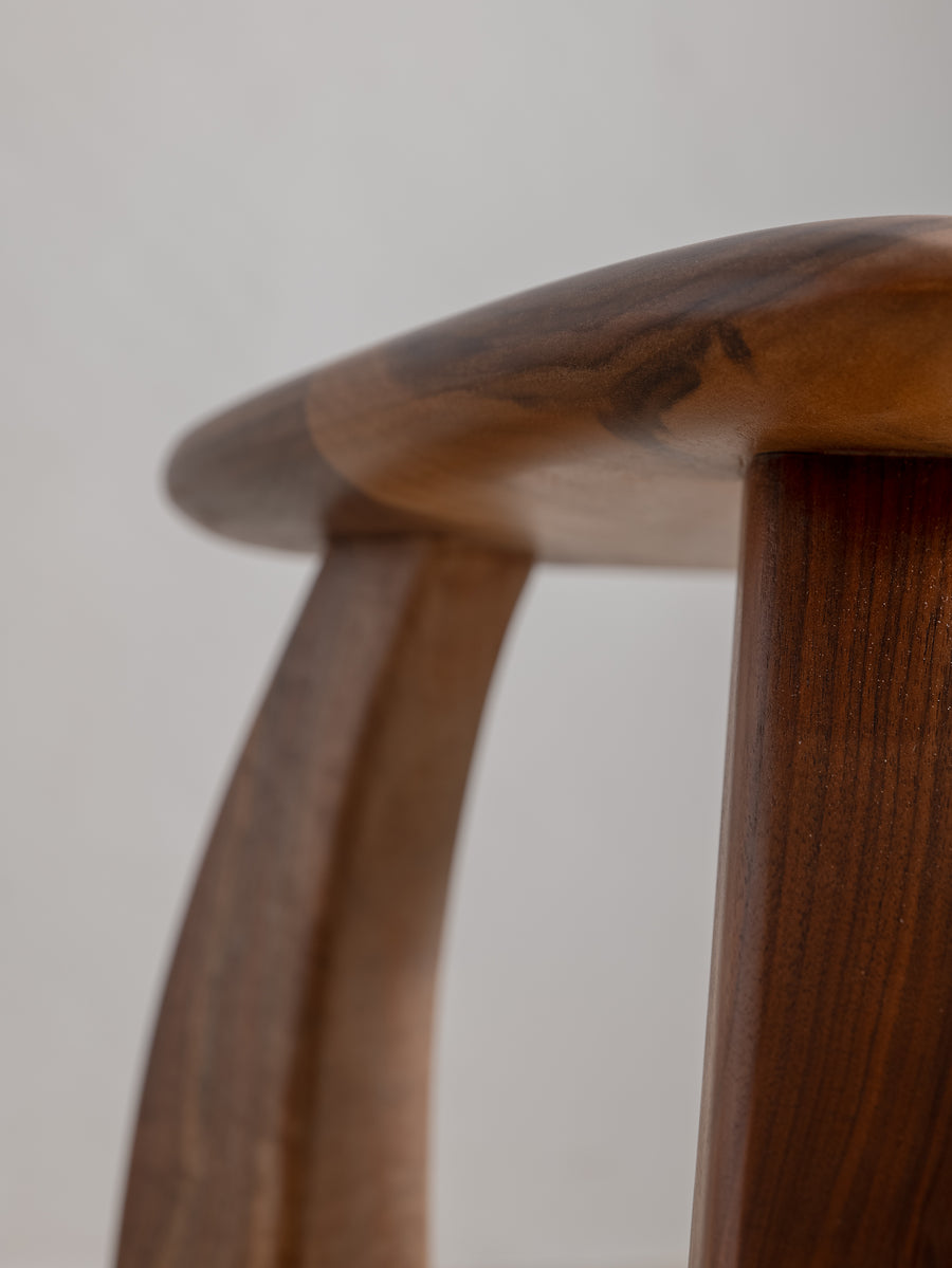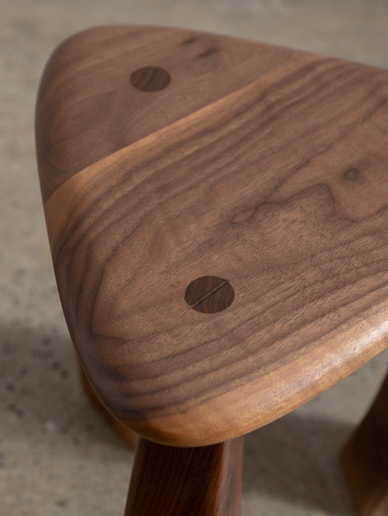 A quiet expression of craftsmanship, this sculptural walnut stool is shaped by skilled artisans in Northern Portugal. Its solid form is softened by inward-arching legs, meeting at a triangular top that highlights the natural beauty of the wood. The deep grain and hand-carved details lend warmth and depth, making each piece truly unique.