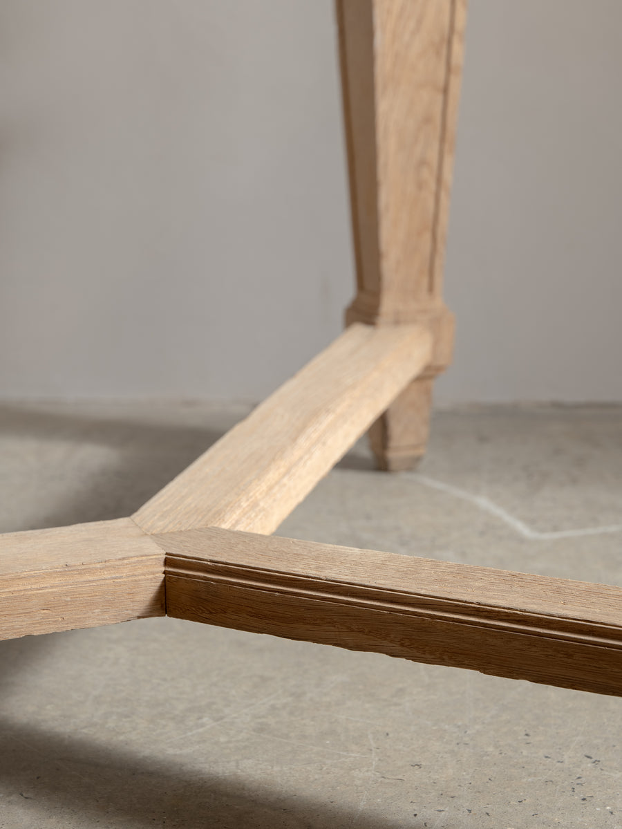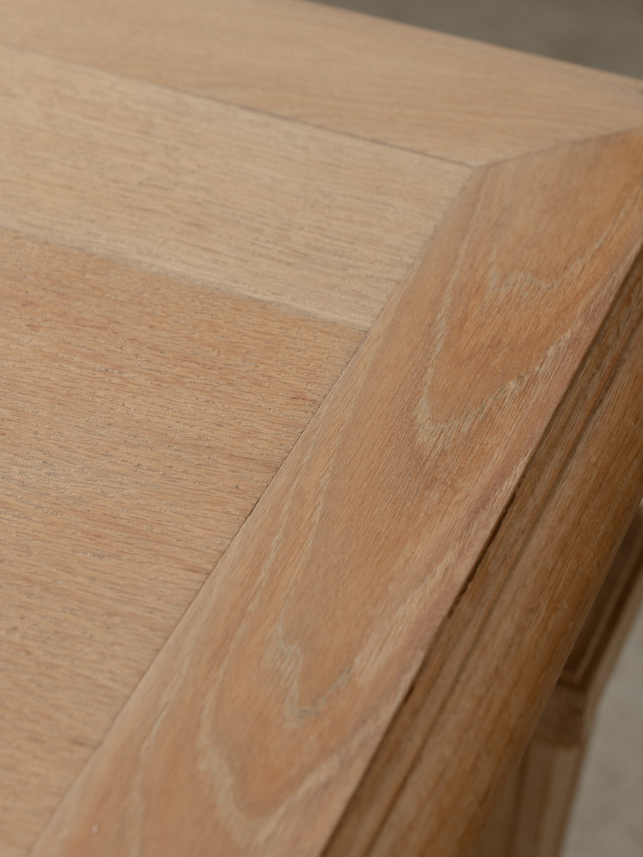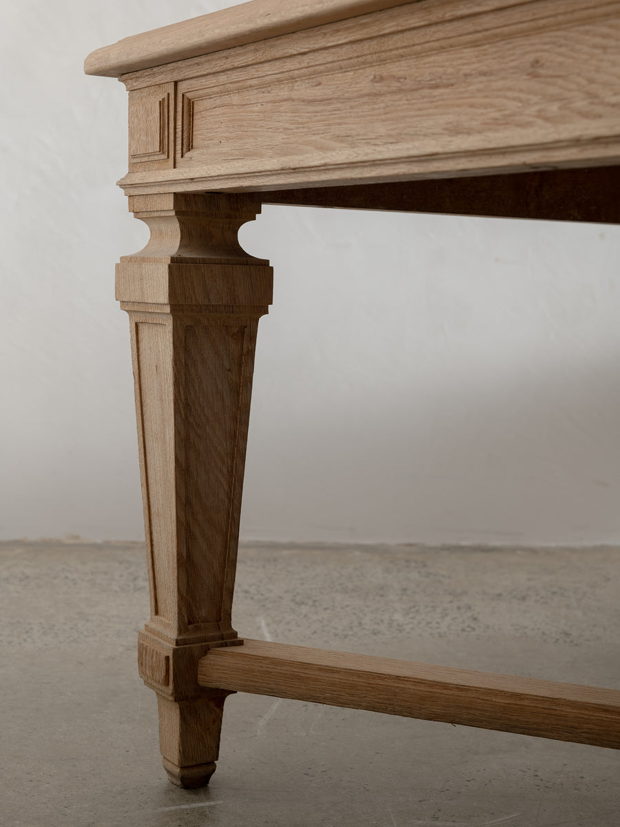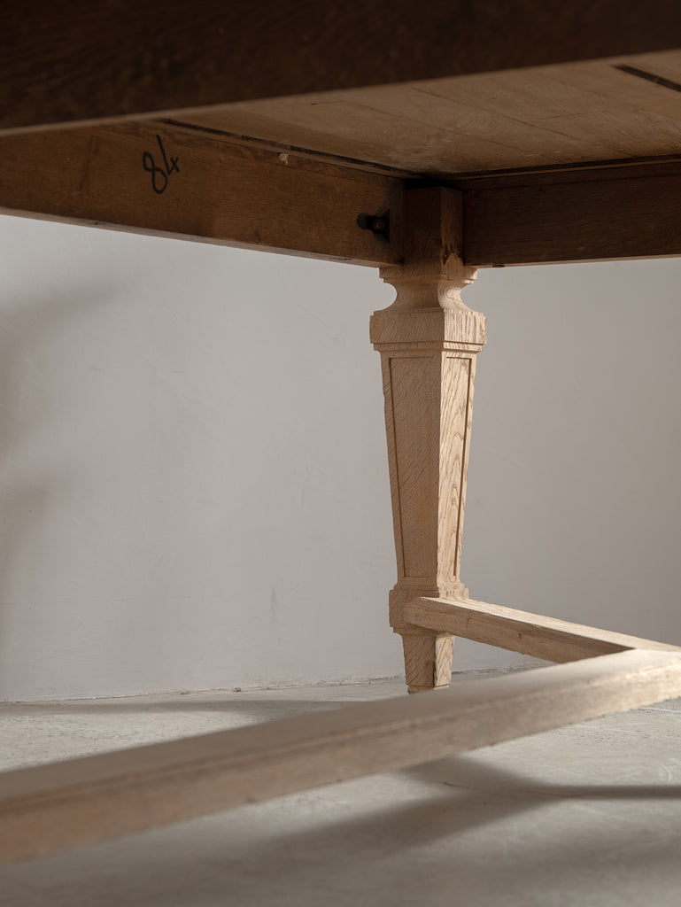 Originally crafted for the Banque de France, this stately oak dining table speaks to a legacy of utility and quiet grandeur. Its substantial top and faceted legs are carved from solid oak, showcasing the warmth and integrity of traditional French joinery. A water-repellent finish has been applied to protect the surface while preserving the timber’s natural texture and patina.