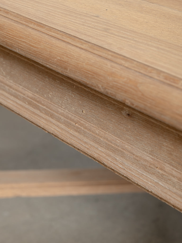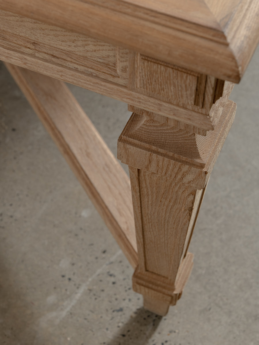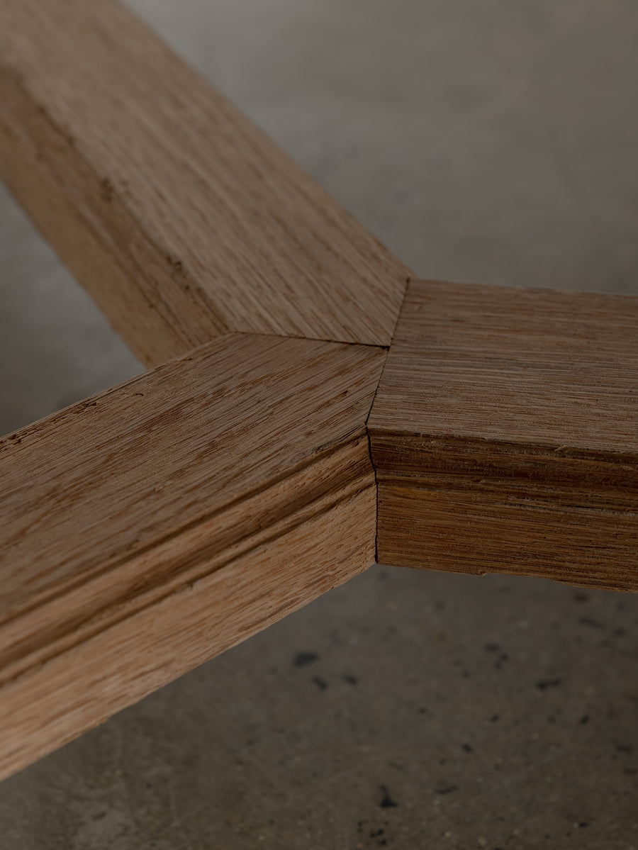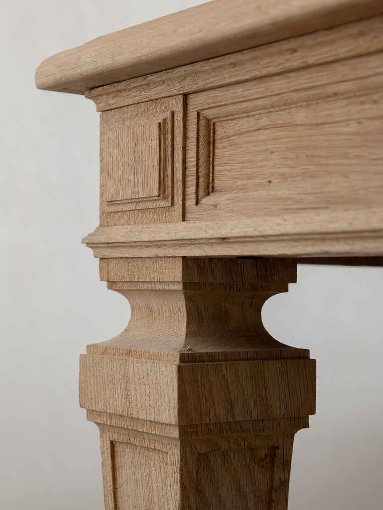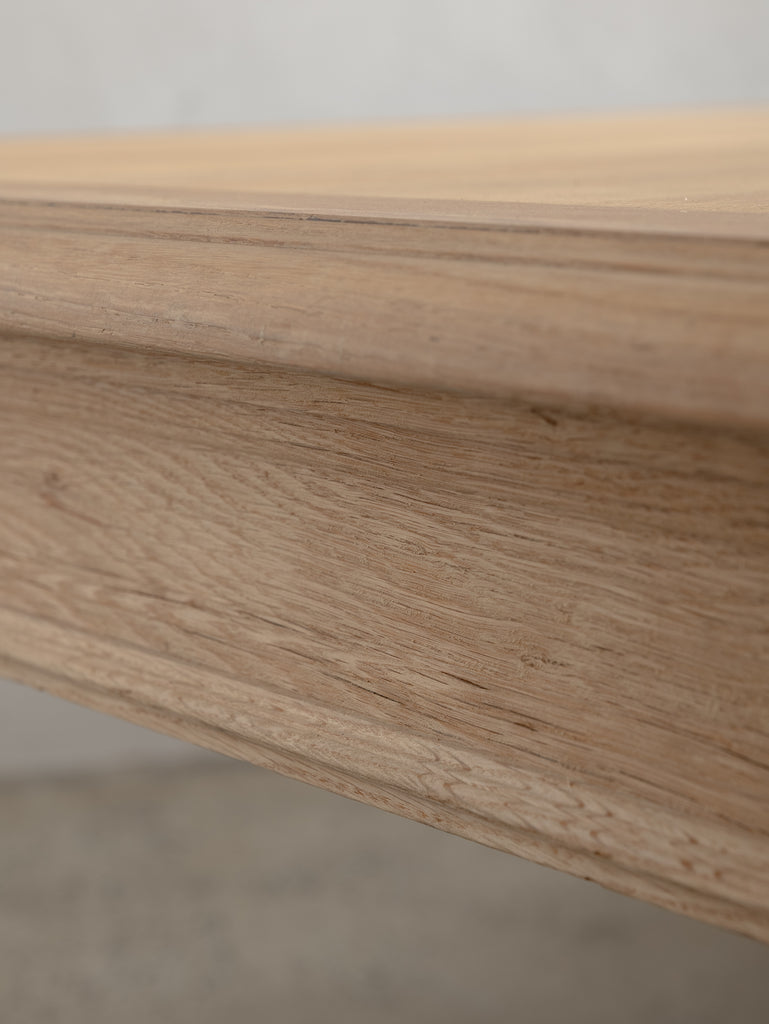 Originally crafted for the Banque de France, this stately oak dining table speaks to a legacy of utility and quiet grandeur. Its substantial top and faceted legs are carved from solid oak, showcasing the warmth and integrity of traditional French joinery. A water-repellent finish has been applied to protect the surface while preserving the timber’s natural texture and patina.