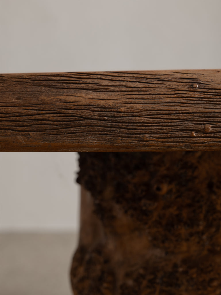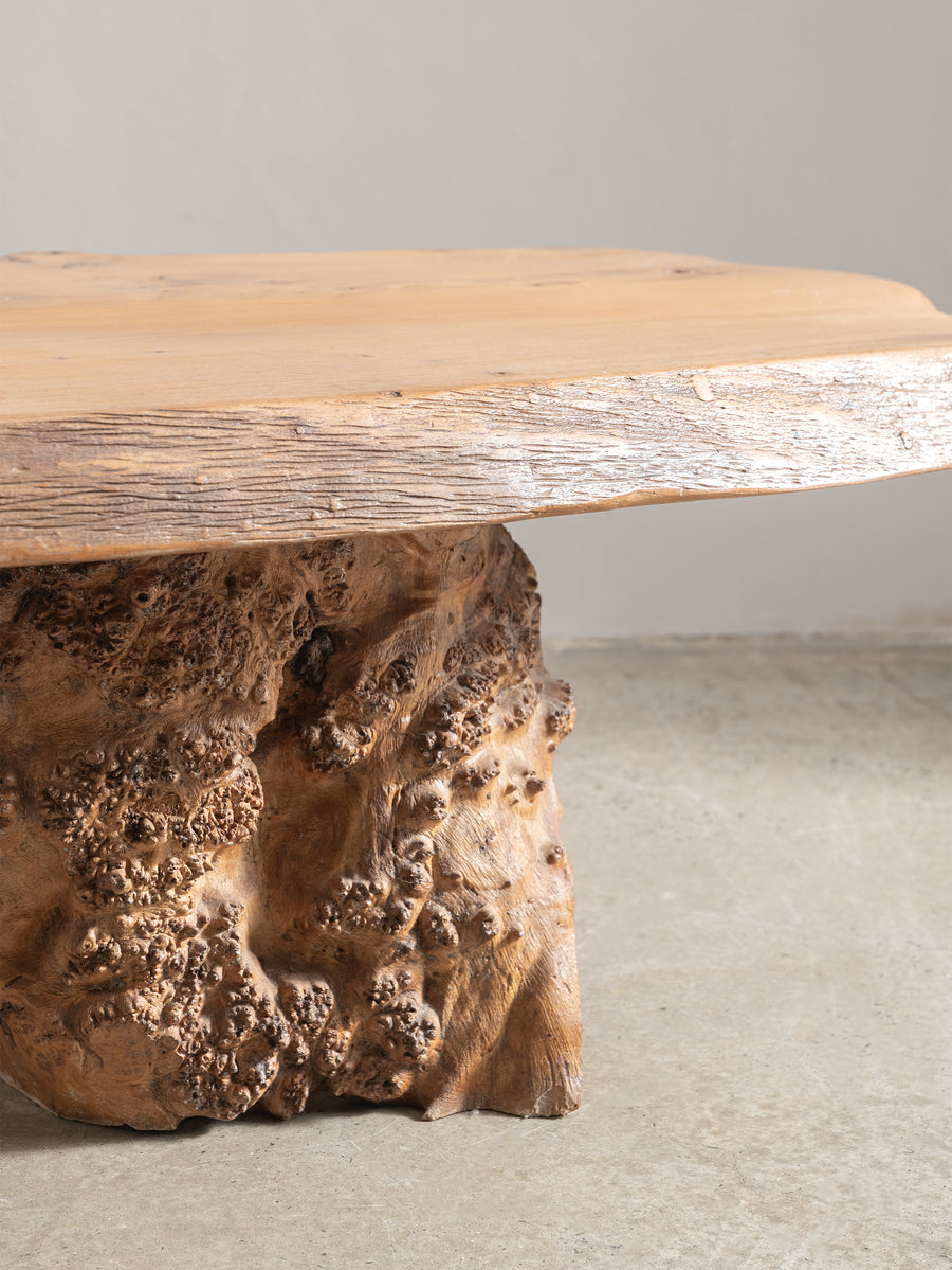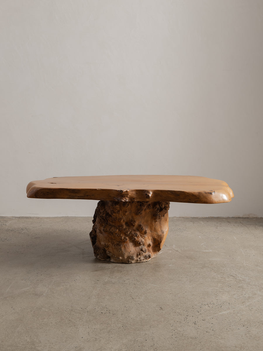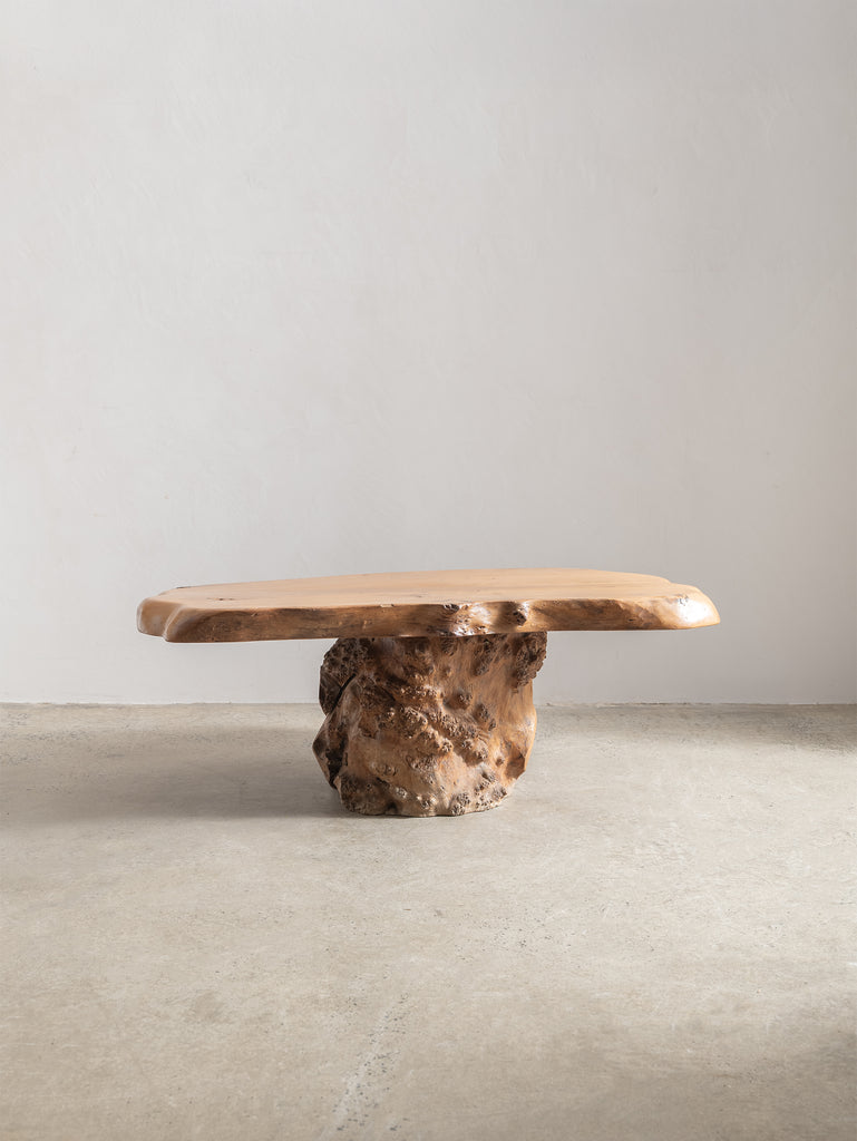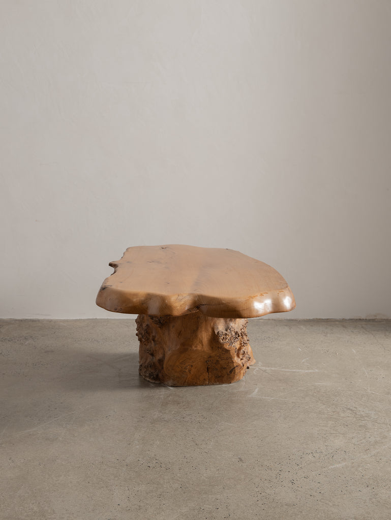 This brutalist elm coffee table brings together raw strength and refined simplicity. Its smooth top contrasts beautifully with a burly, sculpted base, grounding the piece with a bold presence. The natural veining and rich texture of the elm wood give it a unique character, celebrating the organic beauty of the material. Striking yet understated, this table serves as a true centrepiece.