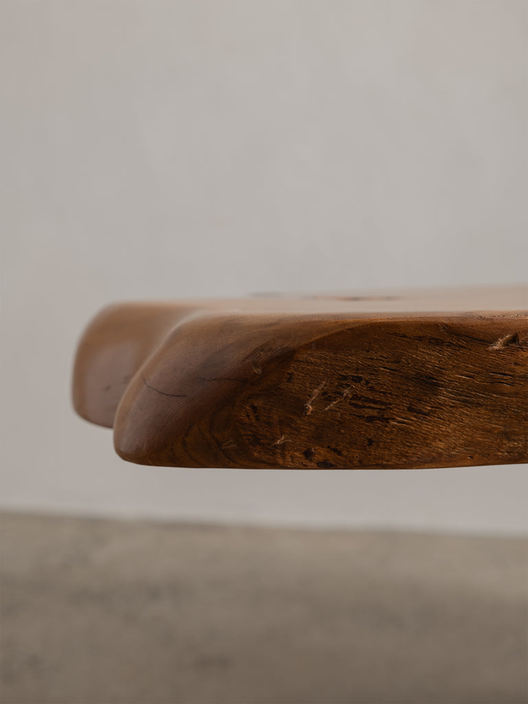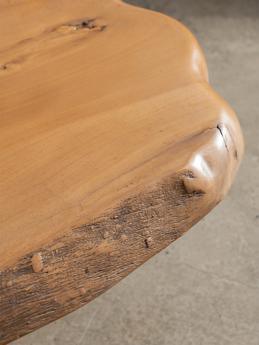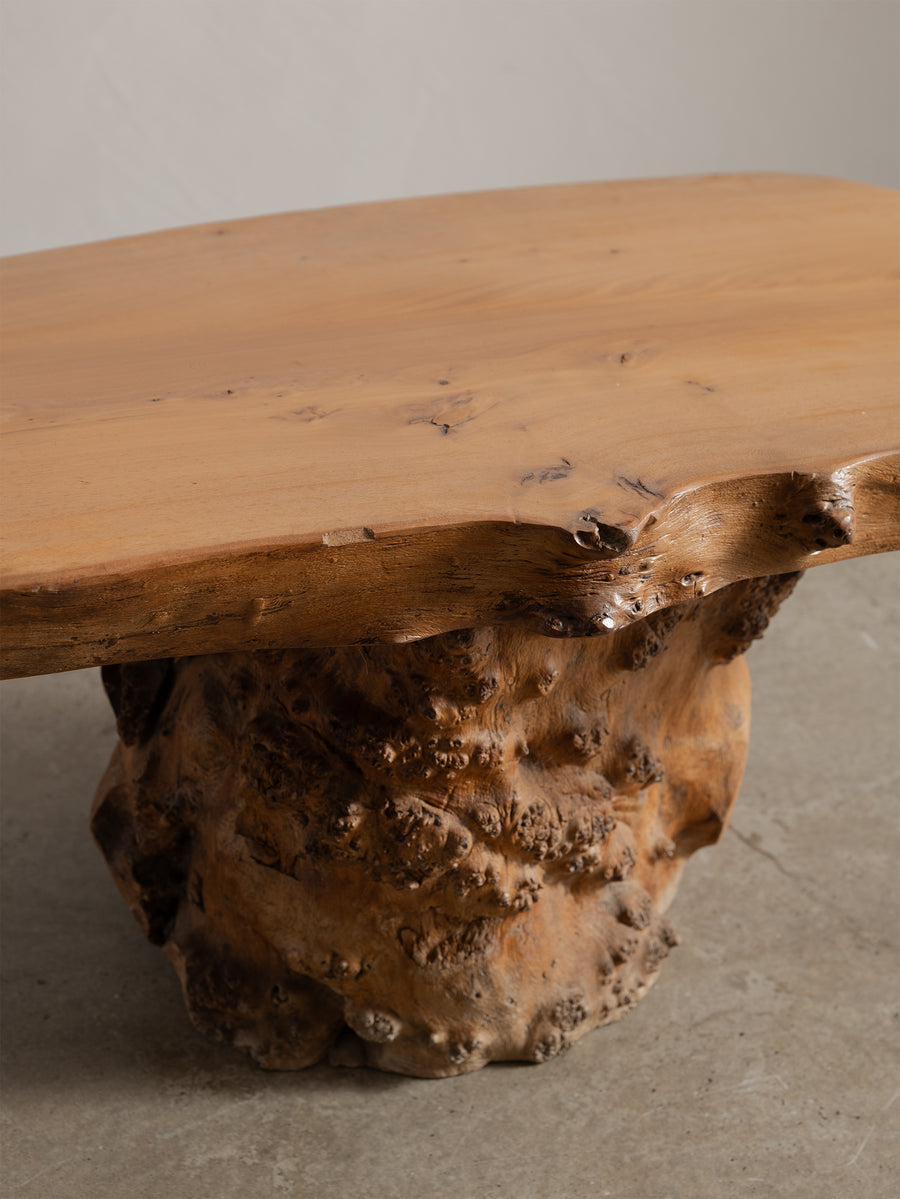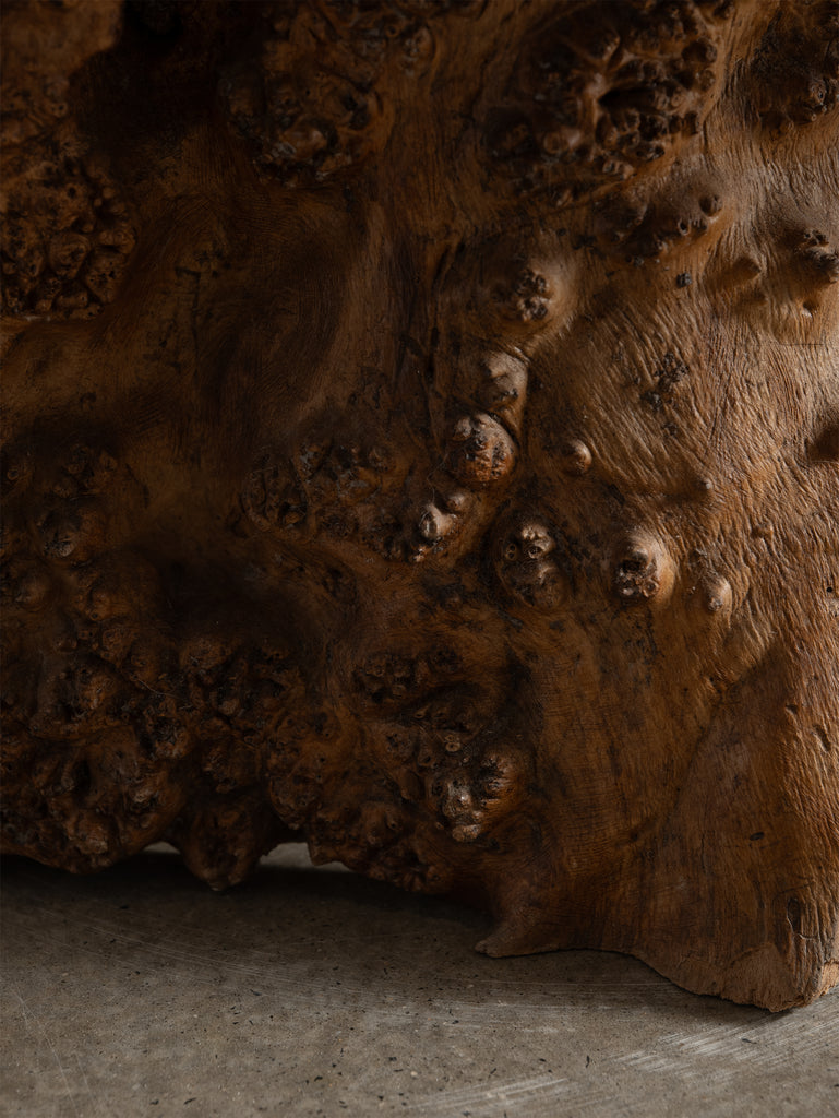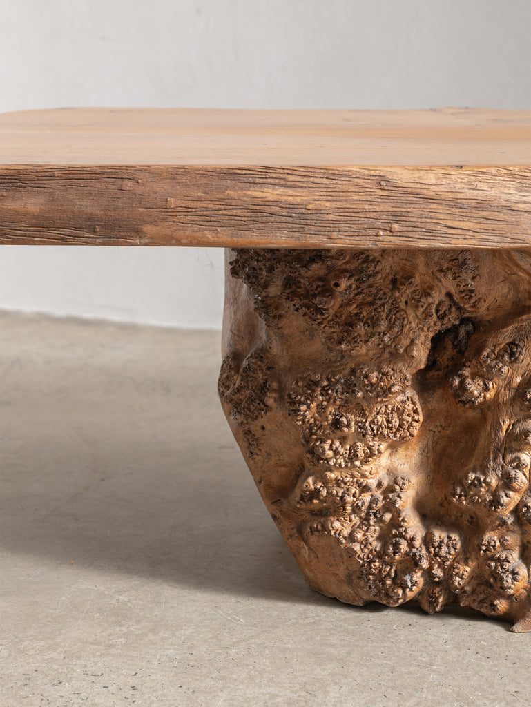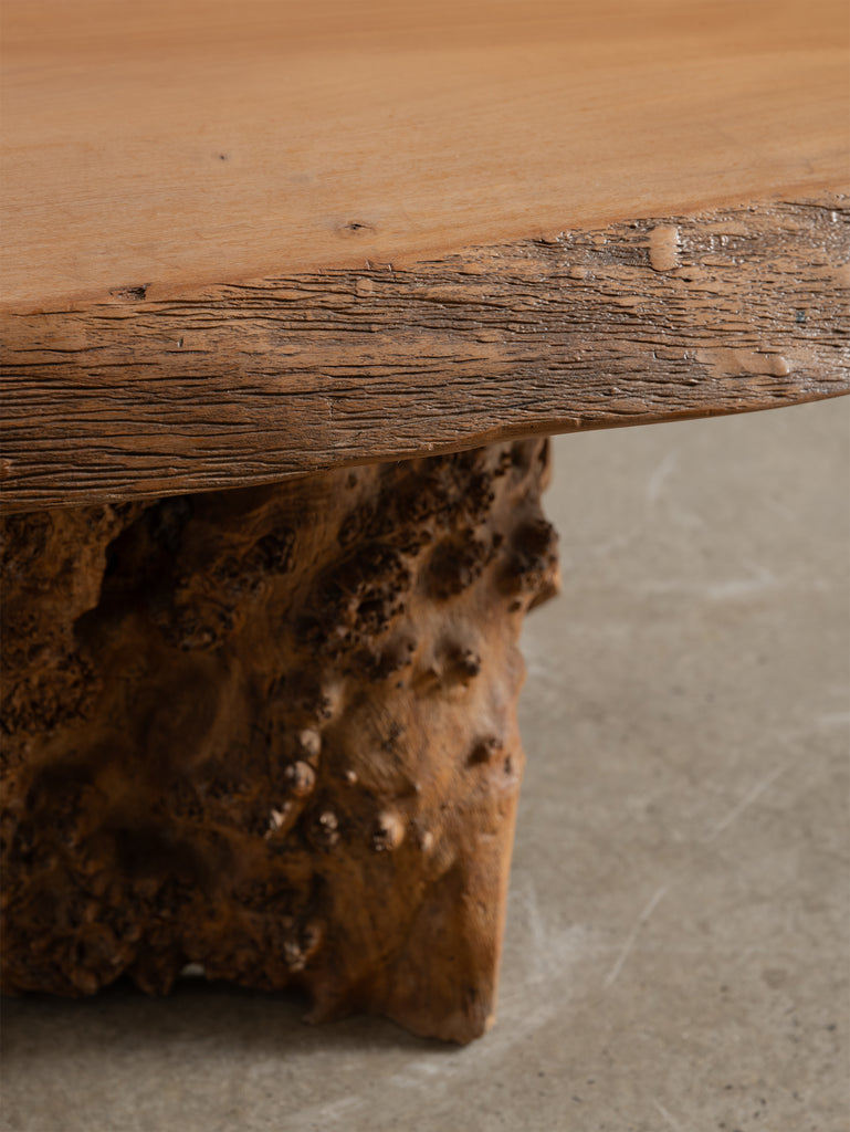 This brutalist elm coffee table brings together raw strength and refined simplicity. Its smooth top contrasts beautifully with a burly, sculpted base, grounding the piece with a bold presence. The natural veining and rich texture of the elm wood give it a unique character, celebrating the organic beauty of the material. Striking yet understated, this table serves as a true centrepiece.