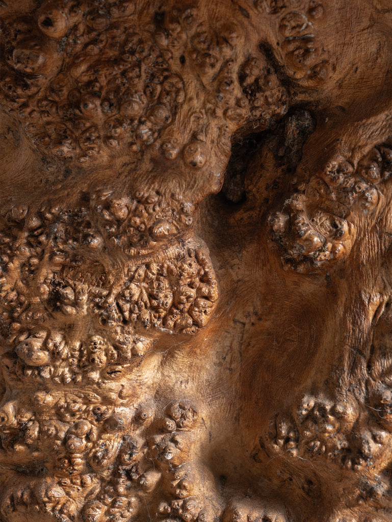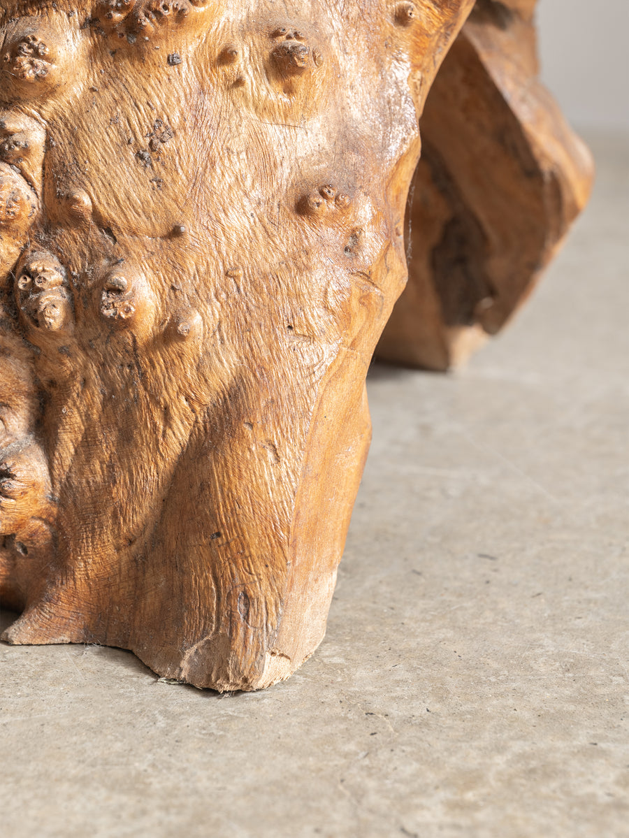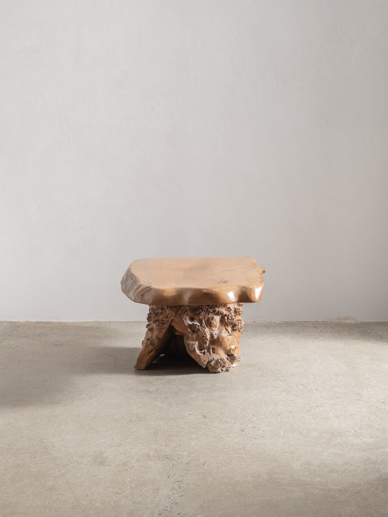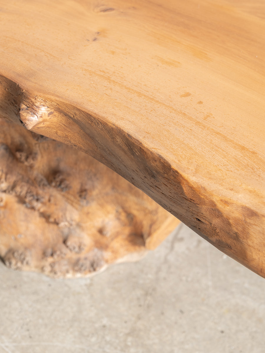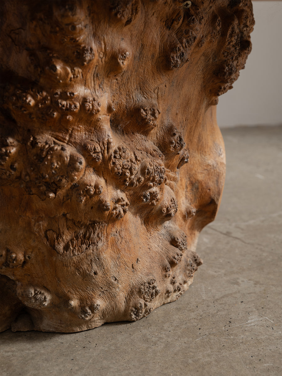 This brutalist elm coffee table brings together raw strength and refined simplicity. Its smooth top contrasts beautifully with a burly, sculpted base, grounding the piece with a bold presence. The natural veining and rich texture of the elm wood give it a unique character, celebrating the organic beauty of the material. Striking yet understated, this table serves as a true centrepiece.