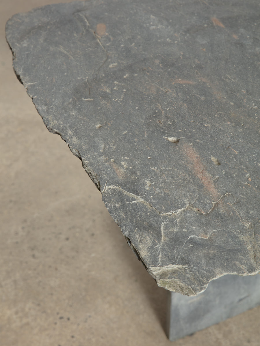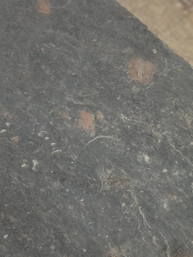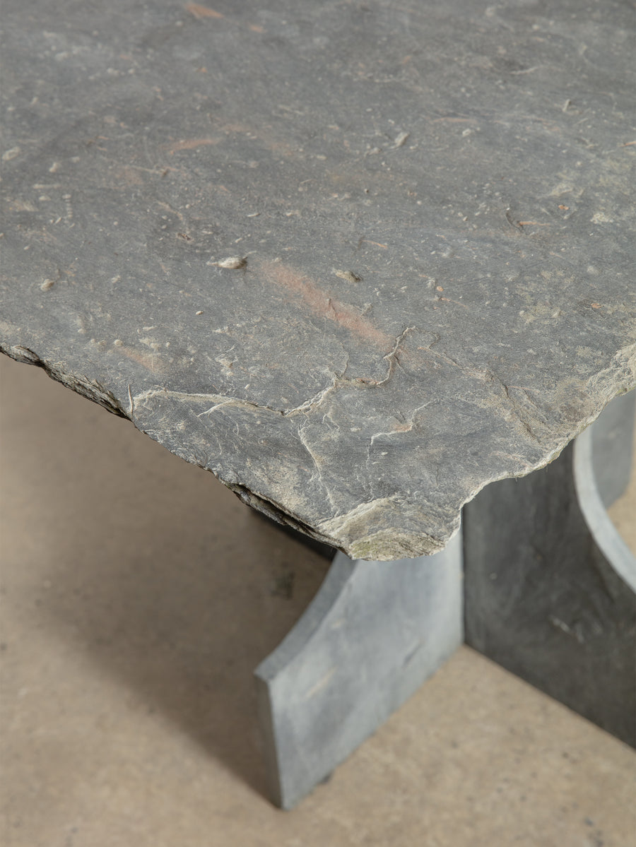 Beautiful vintage slate garden table. Crafted from solid slate, this sculptural piece embodies both strength and simplicity. The natural variations in tone and texture lend an organic presence, while its enduring material makes it ideal for use indoors or out. Perfect as a feature piece in the garden, courtyard, or terrace, it blends durability with quiet, elemental beauty.