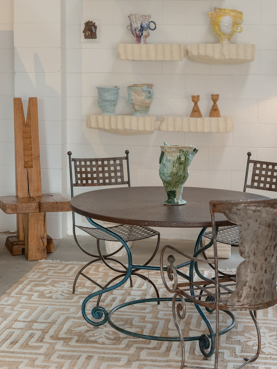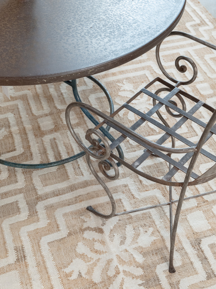 European garden style comes through in this 1950s round metal table, where a richly toned top meets a curving wrought iron base. The sculptural legs, finished in a time-worn blue, end in delicate scrolls that lend a sense of movement and ease. Balanced and enduring, it’s a piece that brings character to both outdoor and indoor settings, celebrated for its vintage patina and mid-century charm. Due to it's vintage nature, the table carries unique marks of age that speak to its decades of use.