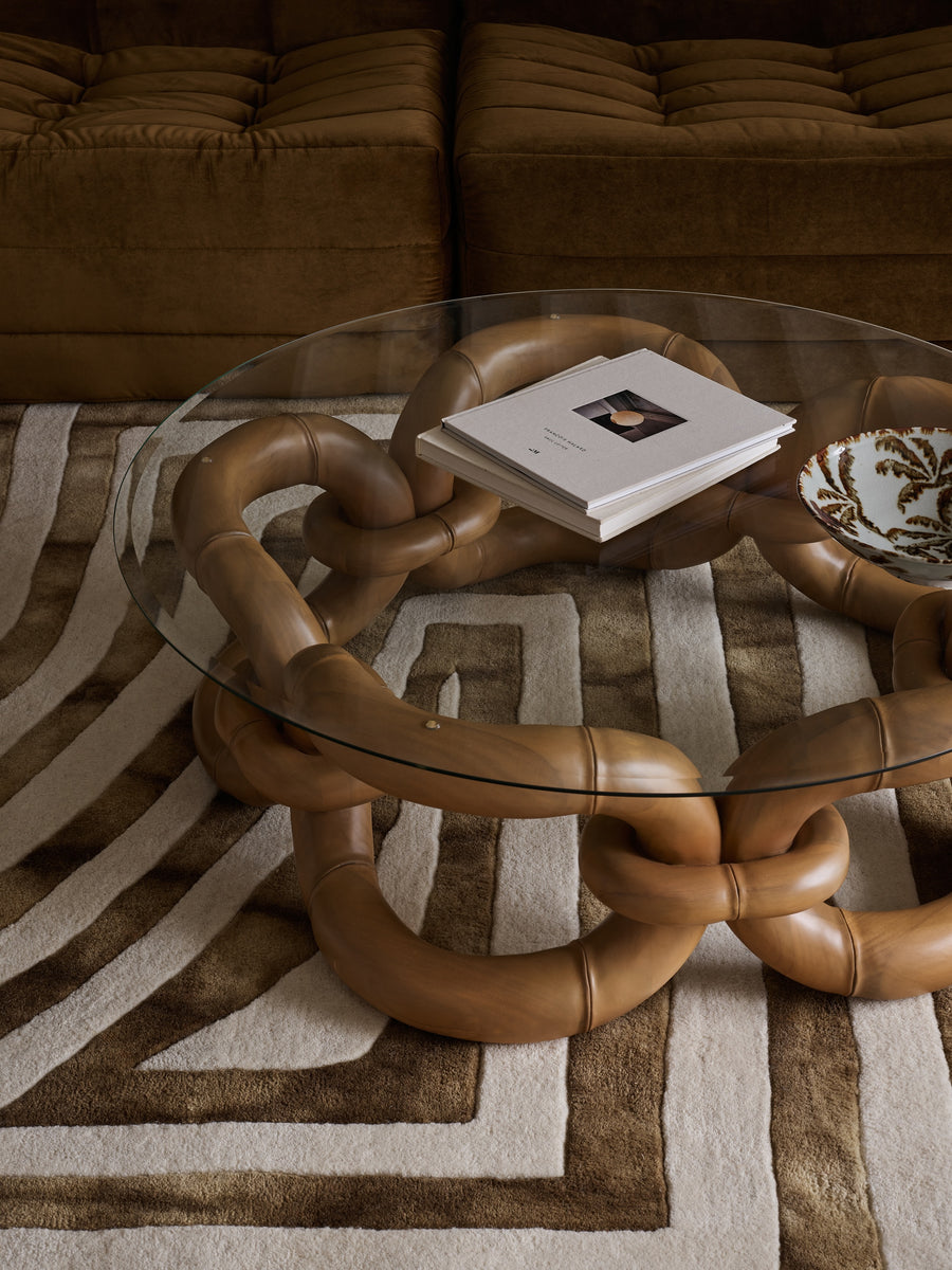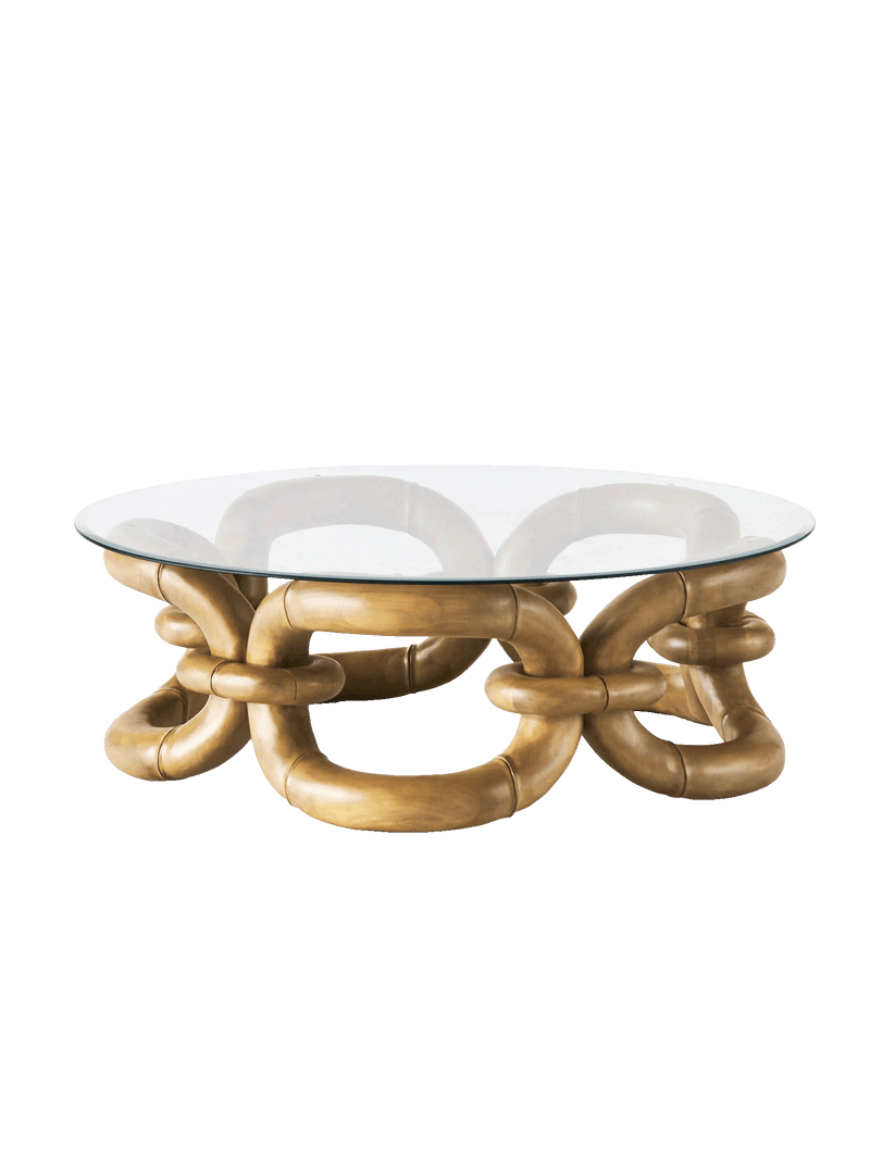 The Bamboo Bracelet Sofa Table features a hand carved wooden base reminiscent of a vintage gold bracelet discovered in a flea market. Made from cultivated Mahogany, this frame has been stained and hand painted, and paired with a tempered glass top.