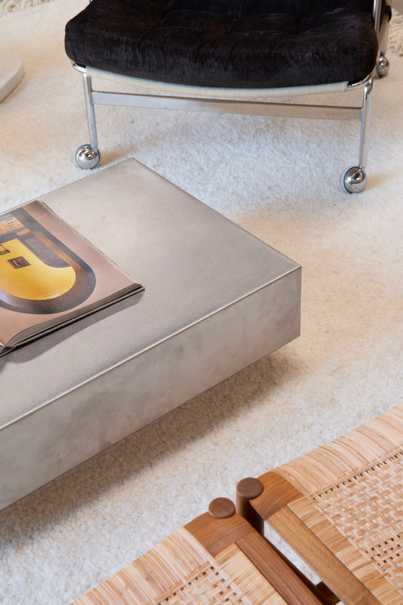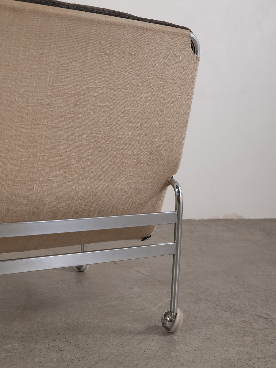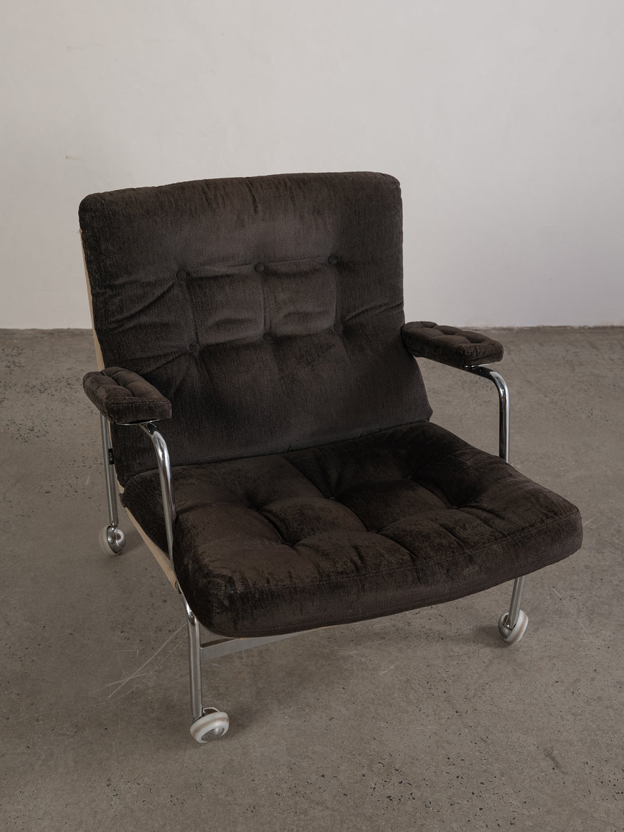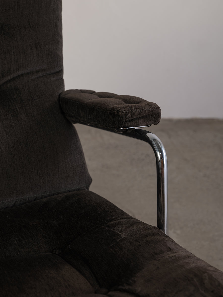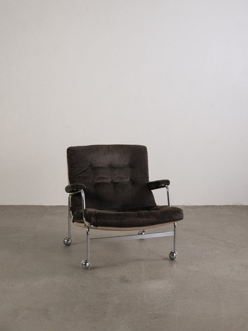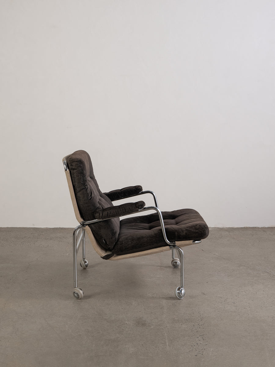 A timeless icon of Scandinavian modernism, the Karin armchair by Bruno Mathsson for Dux embodies elegance and functionality. Designed in 1969, it features a button-tufted cushion in its original fabric, resting gracefully on a chrome-plated steel frame with Mathsson’s signature supportive webbing.