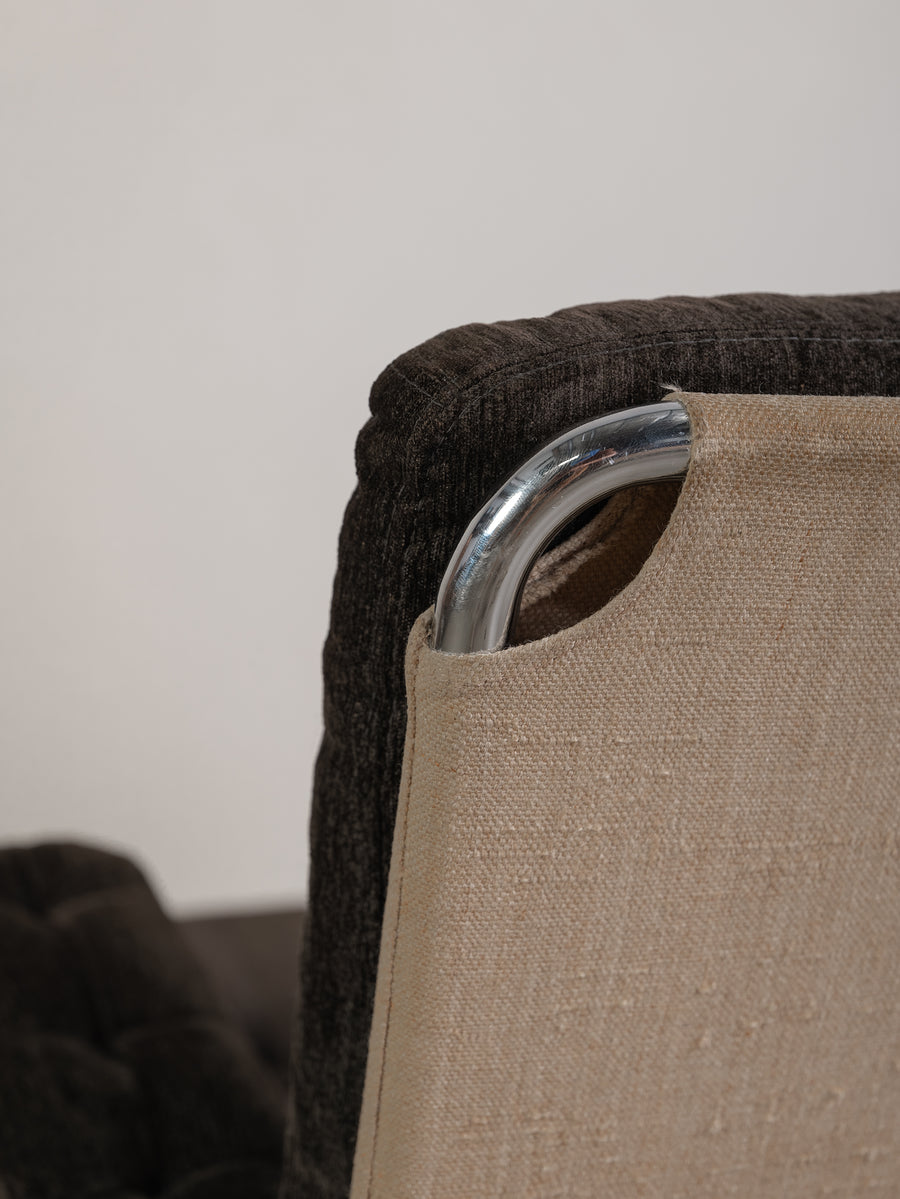 Thoughtfully crafted for both comfort and style, the Karin’s clean lines and understated sophistication make it a versatile addition to any interior. Casters provide effortless mobility, while the chrome frame remains in premium condition, adding a sleek, contemporary edge.