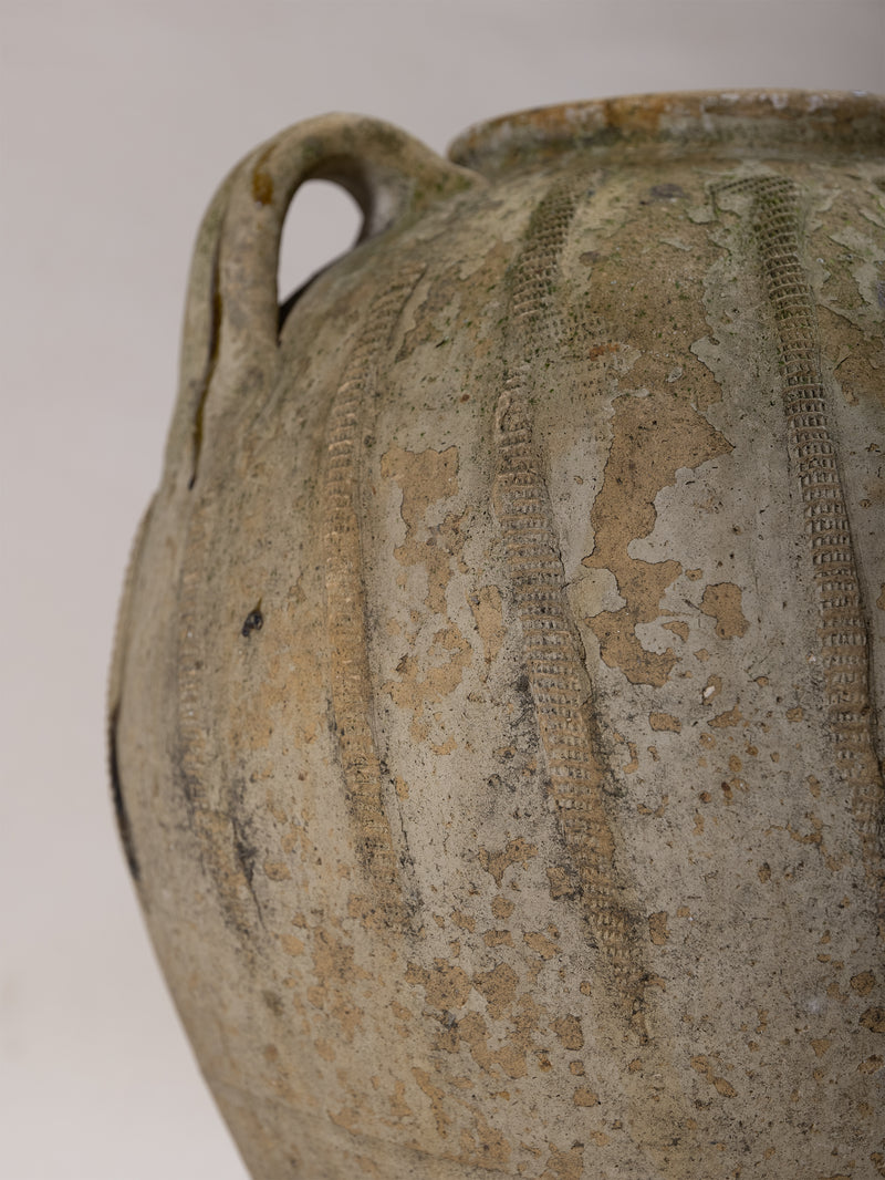Quietly expressive in form and surface, this ceramic vessel reflects the rustic elegance of early 20th-century French pottery. Its hand-shaped body features a subtle ribbed texture and twin handles, each softened by time and use. The aged glaze reveals warm earth tones and a gentle patina, offering a sense of history and restraint. Beautiful displayed on its own or among other collected forms, it embodies the timeless beauty of handmade craft.