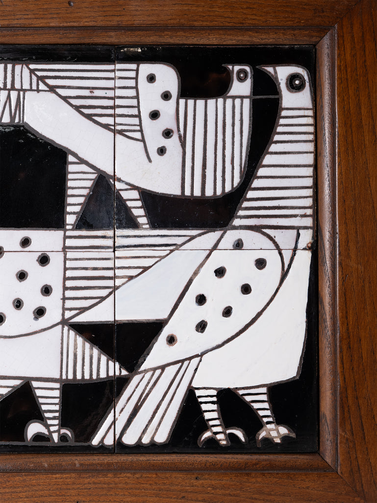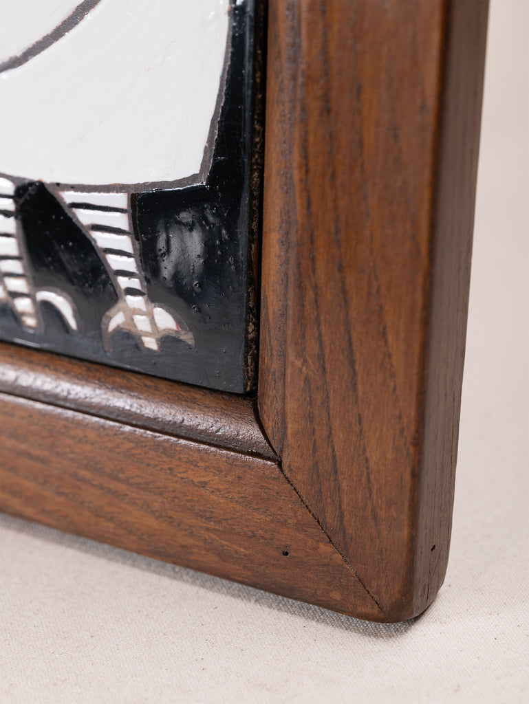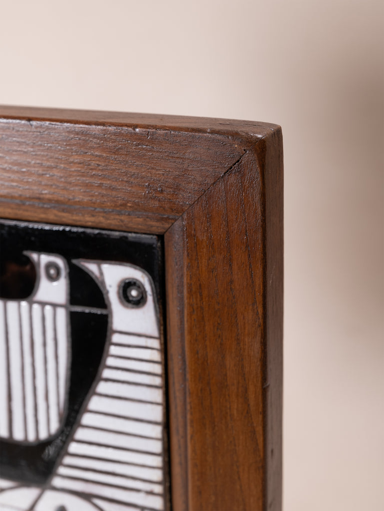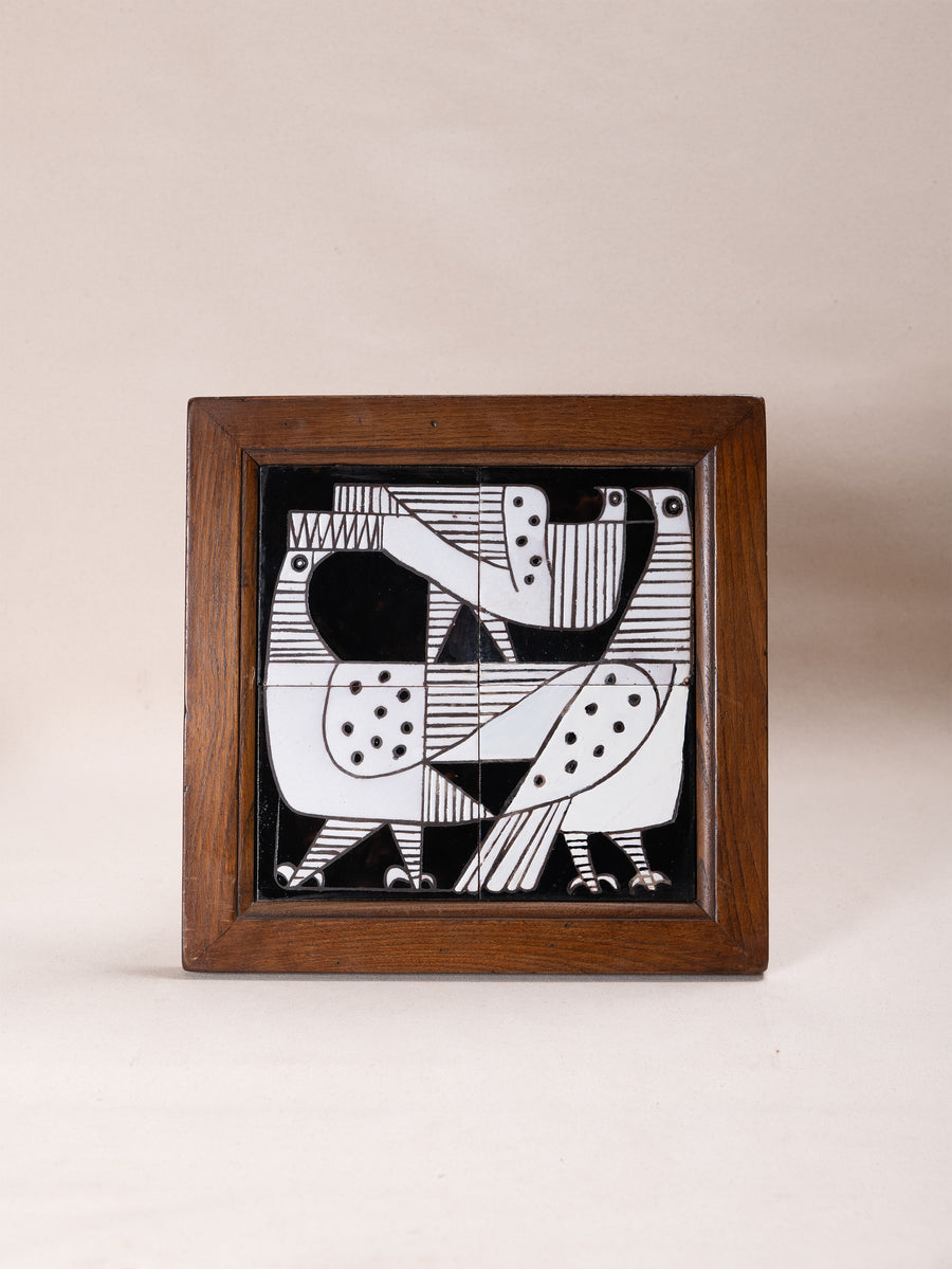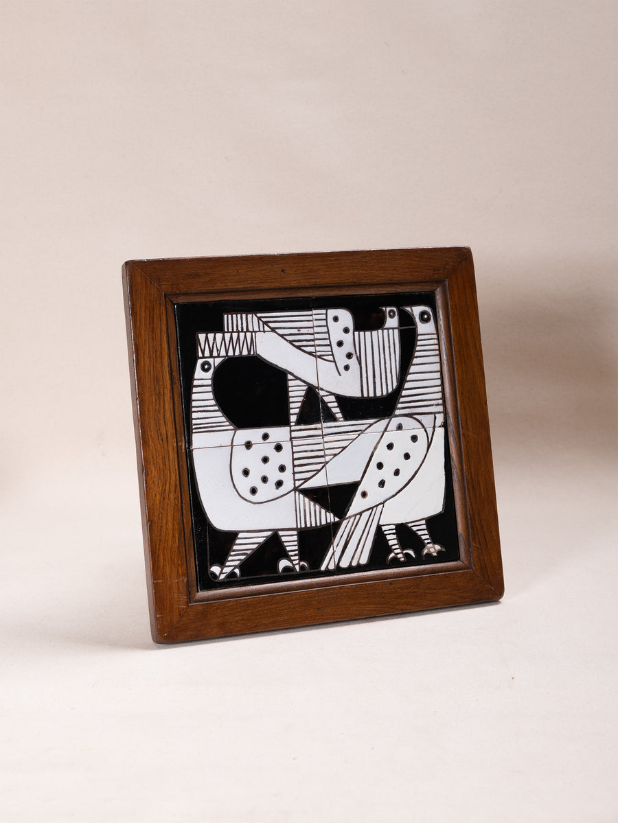 A striking mid-century ceramic artwork featuring a bold geometric bird motif rendered in black and white glaze. Framed in warm timber, the piece combines modernist abstraction with artisanal craft. Its rhythmic composition and hand-painted detail recall the era’s fascination with form, texture, and pattern.