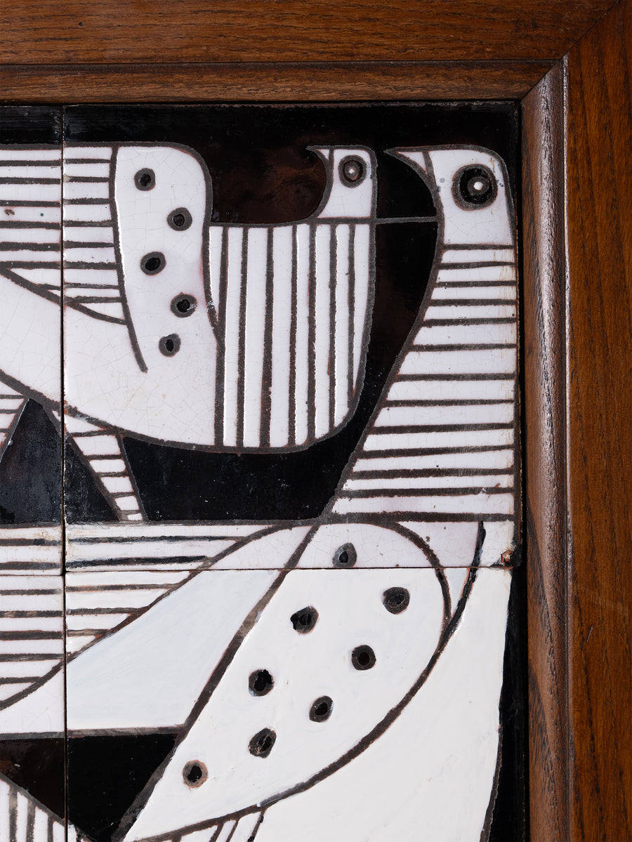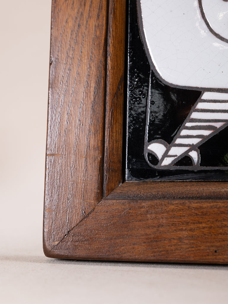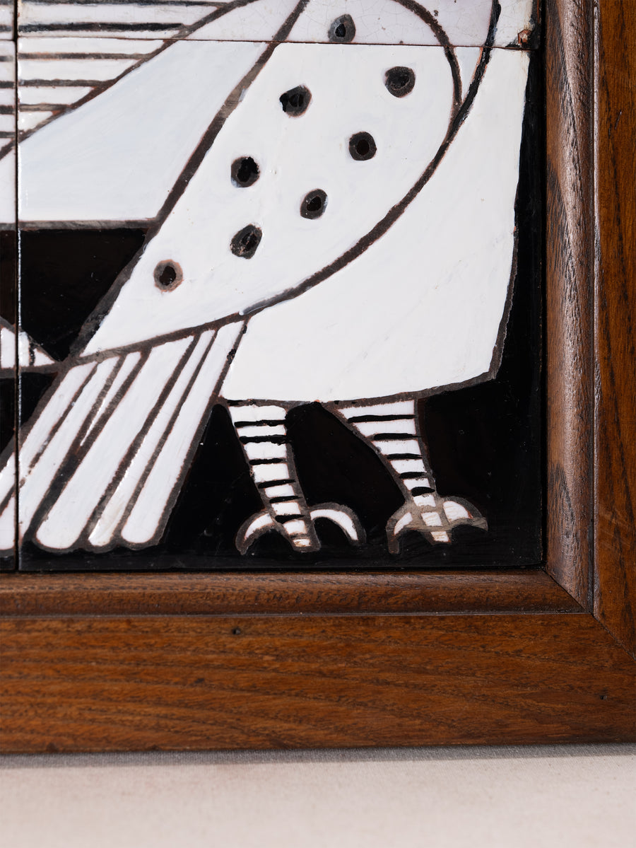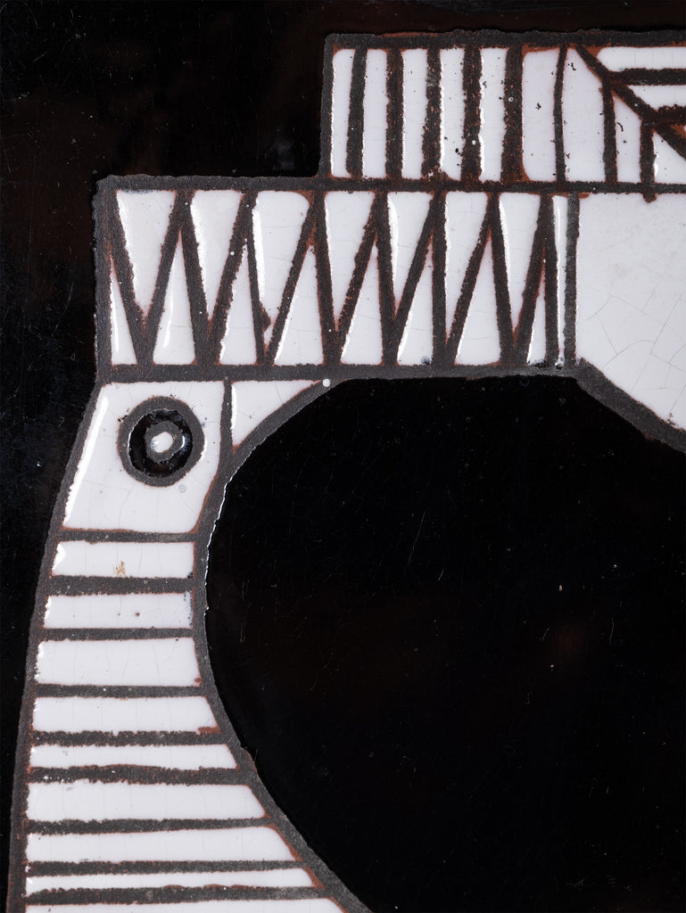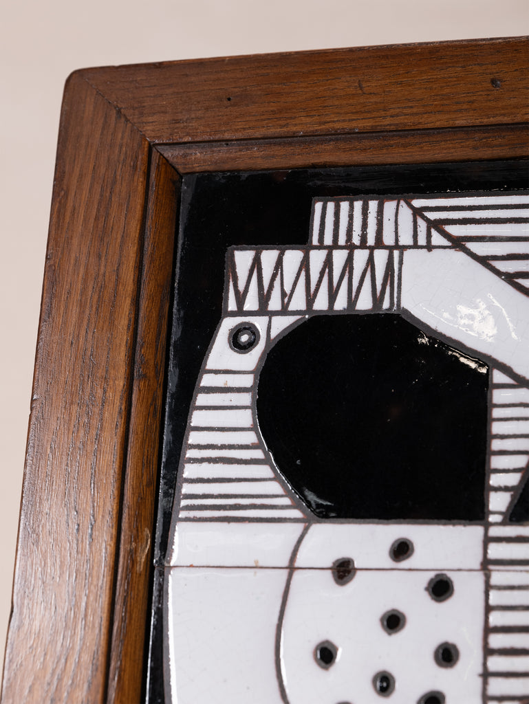 A striking mid-century ceramic artwork featuring a bold geometric bird motif rendered in black and white glaze. Framed in warm timber, the piece combines modernist abstraction with artisanal craft. Its rhythmic composition and hand-painted detail recall the era’s fascination with form, texture, and pattern.