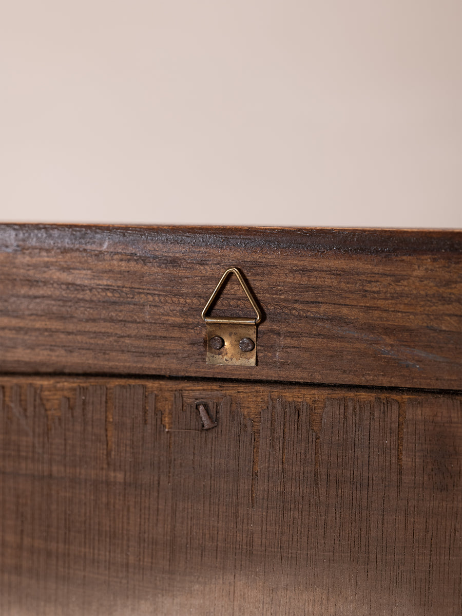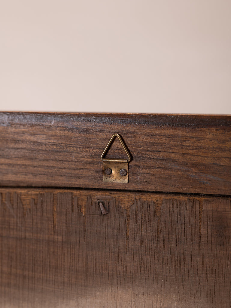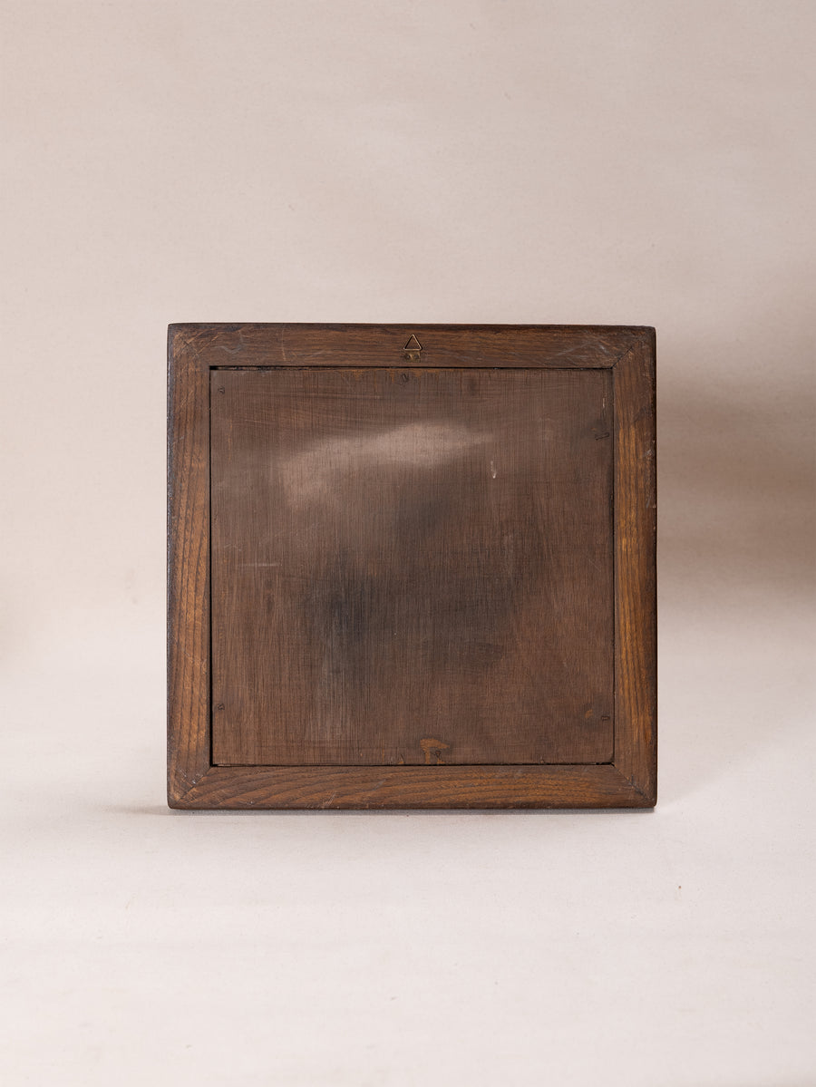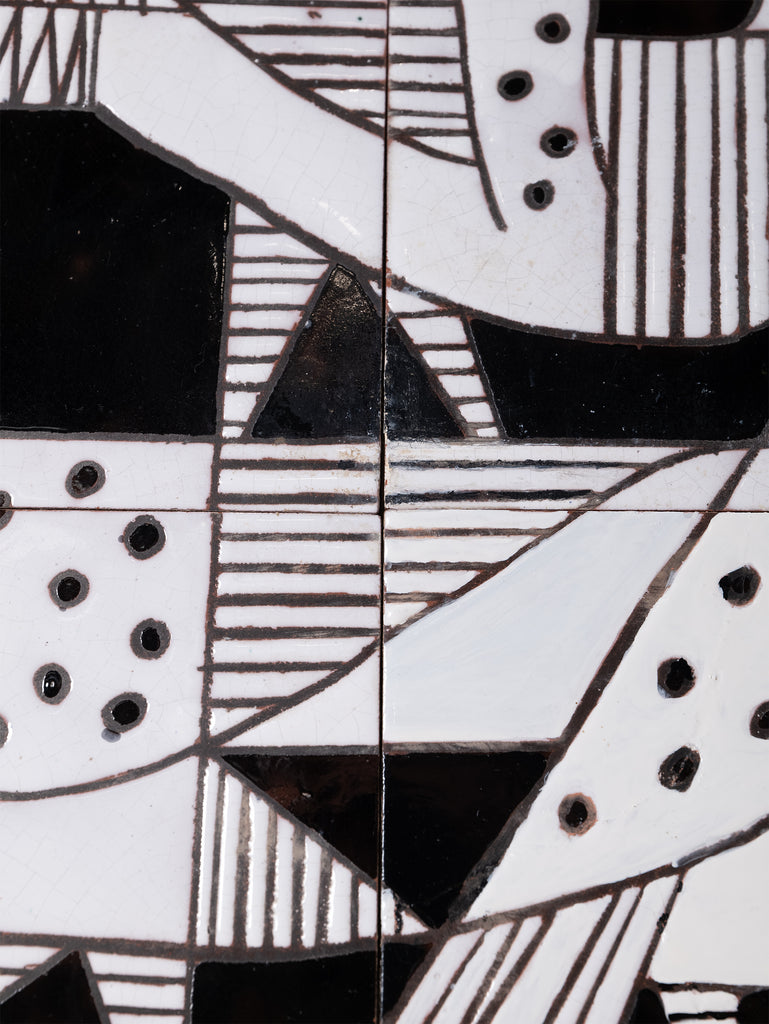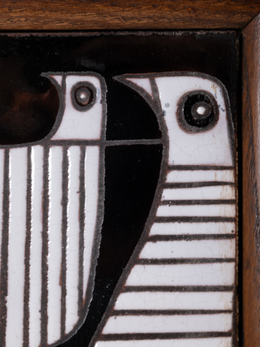 A striking mid-century ceramic artwork featuring a bold geometric bird motif rendered in black and white glaze. Framed in warm timber, the piece combines modernist abstraction with artisanal craft. Its rhythmic composition and hand-painted detail recall the era’s fascination with form, texture, and pattern.