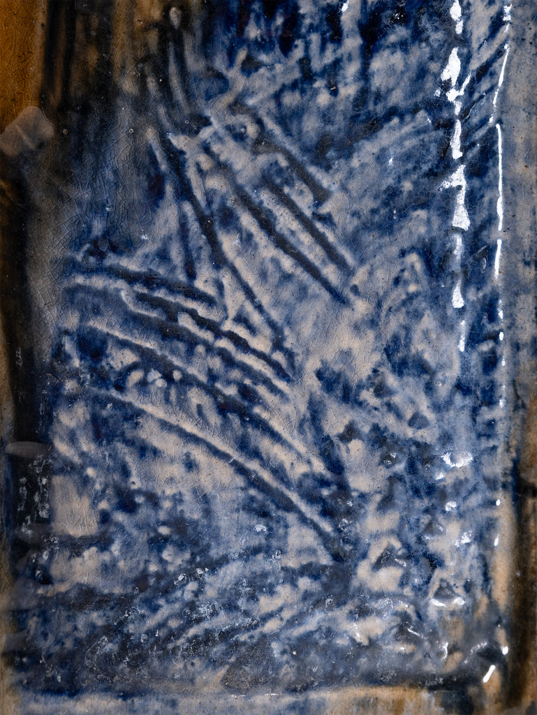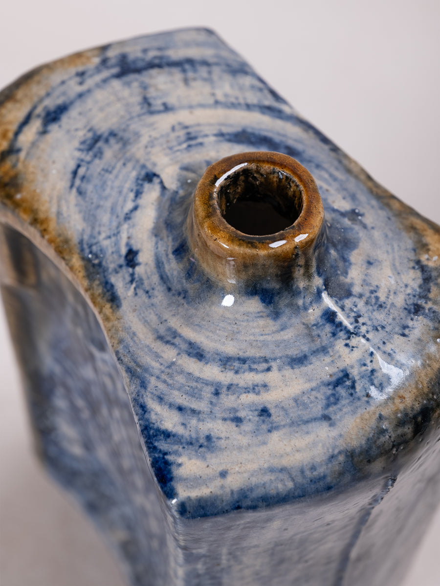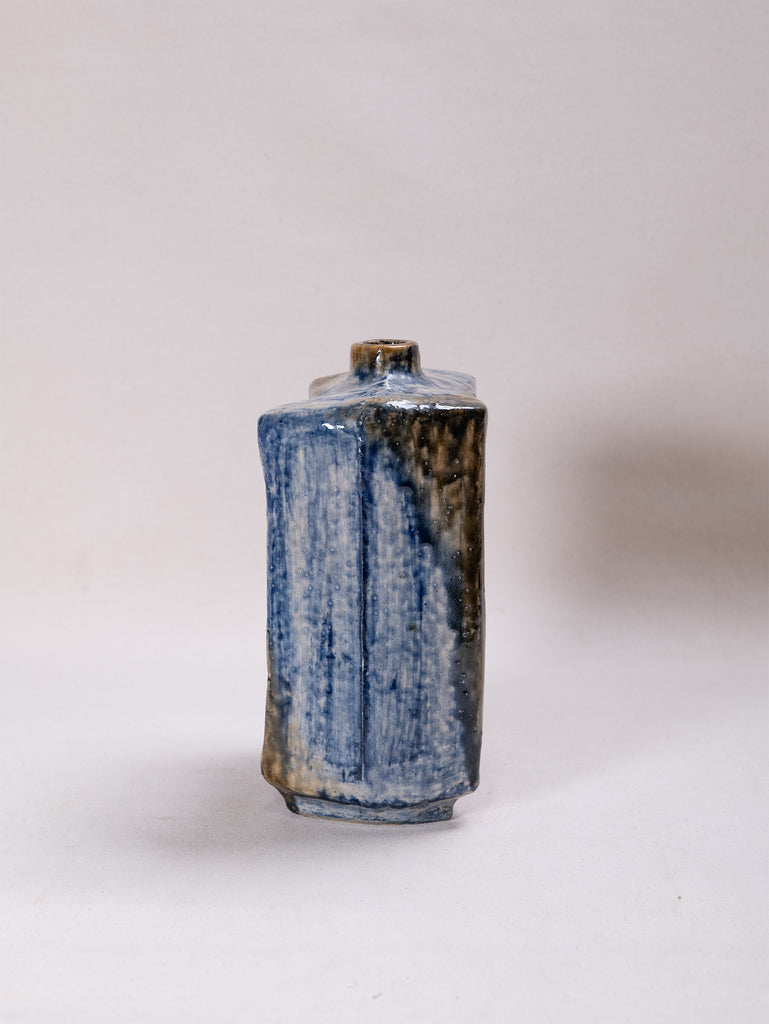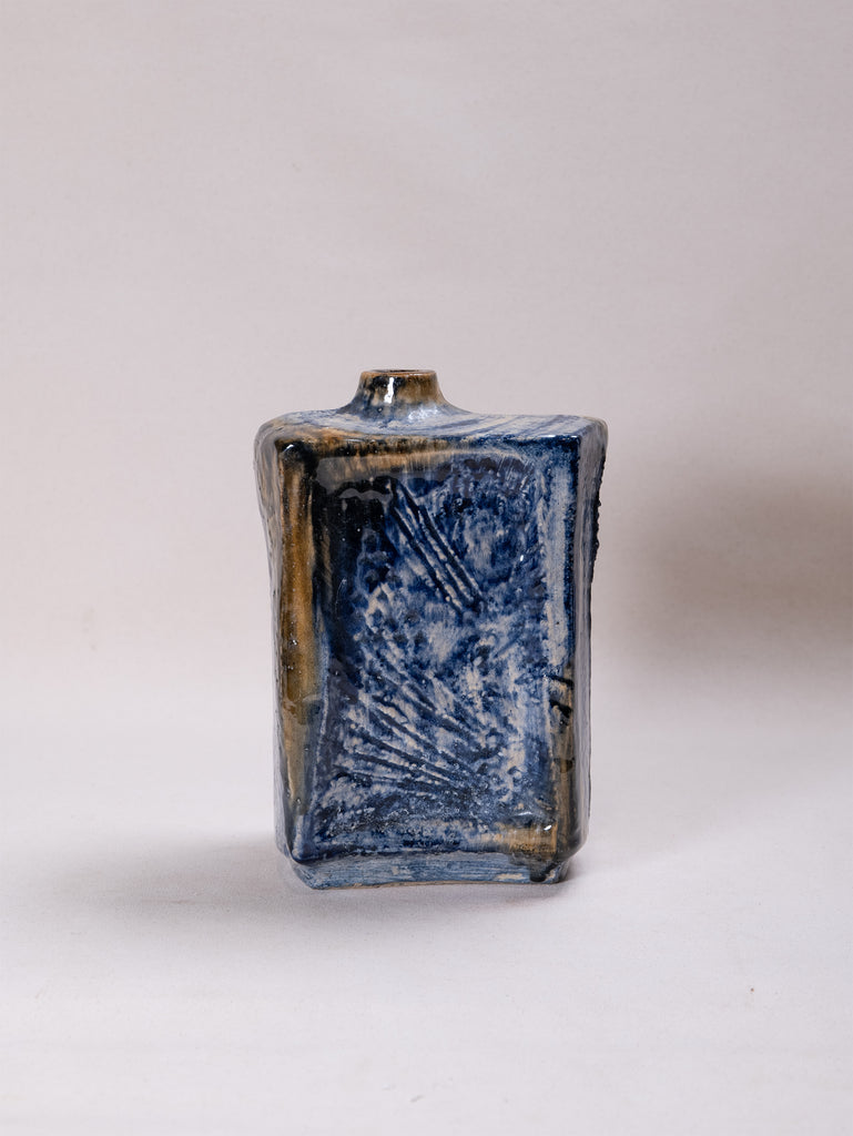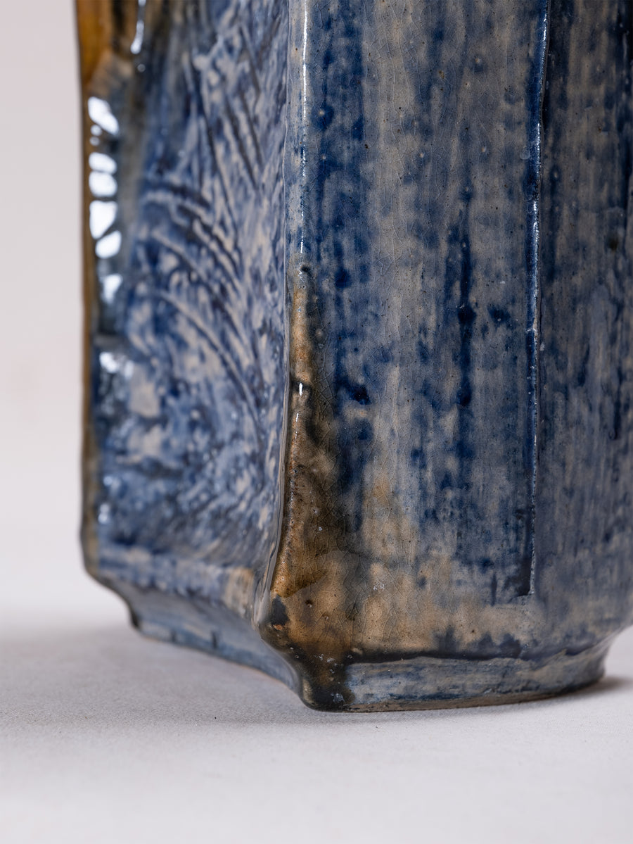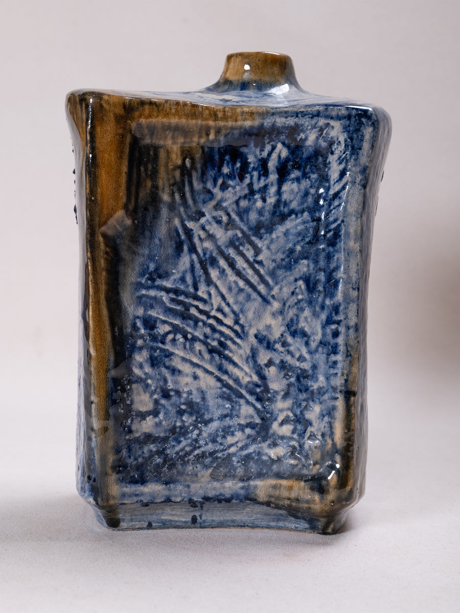 Defined by bold angular forms and richly textured surfaces, these glazed ceramic vessels reveal a dynamic interplay of earthy tones, deep blues, and expressive carved motifs. Their sculptural presence balances function with artistry, embodying the modernist spirit of mid-century ceramic design.