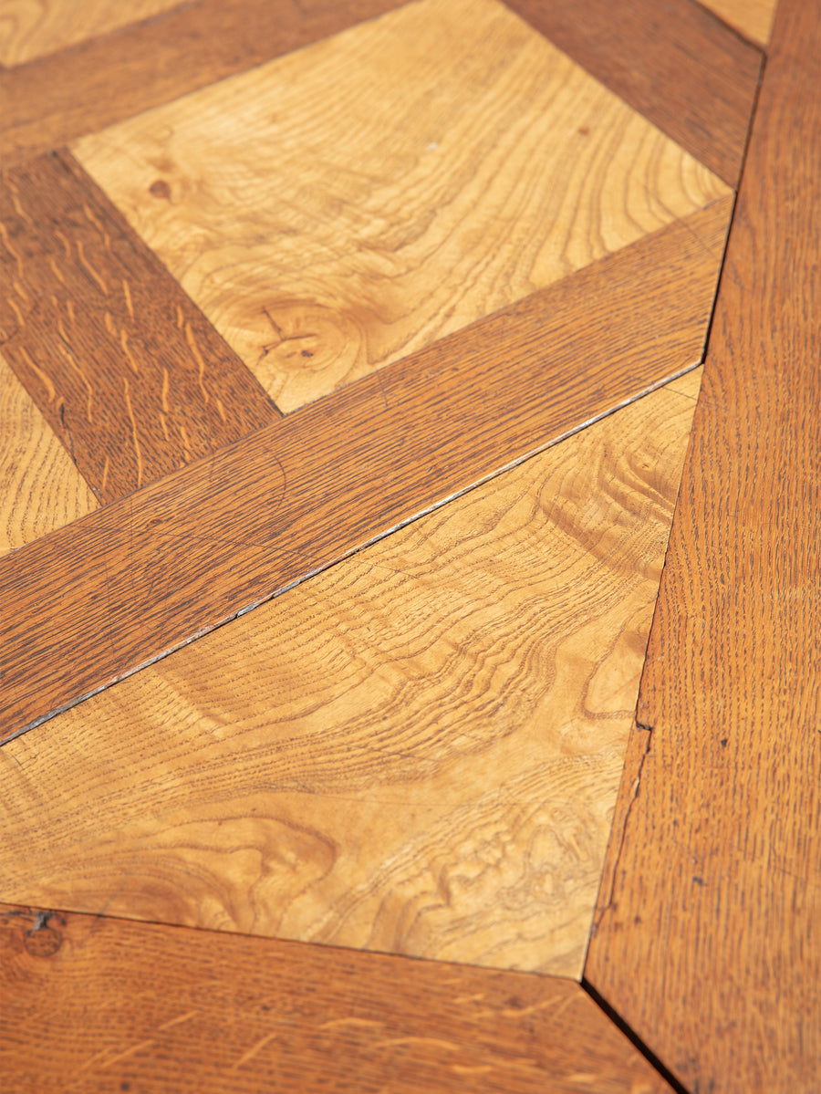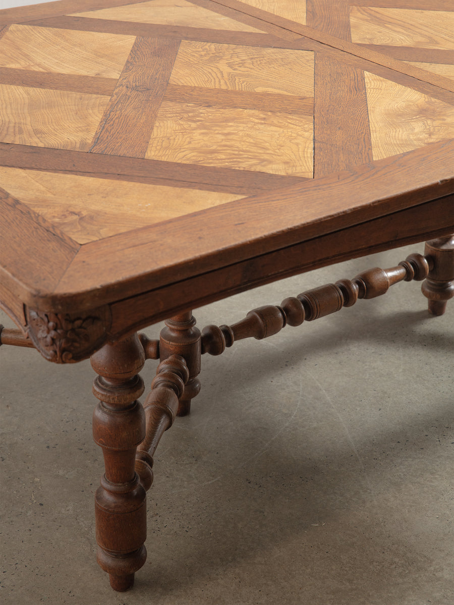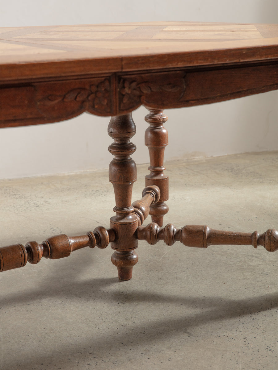 An exceptional oak dining table with parquetry inlay and beautifully hand-carved legs, sourced from an 18th-century French château. The craftsmanship speaks to its provenance - rich tones of aged timber, intricate detailing, and extendable leaves that transform it into an impressive, banquet-sized piece. Grand yet inviting, it embodies the enduring charm of French heritage furniture and the quiet grandeur of its origins.